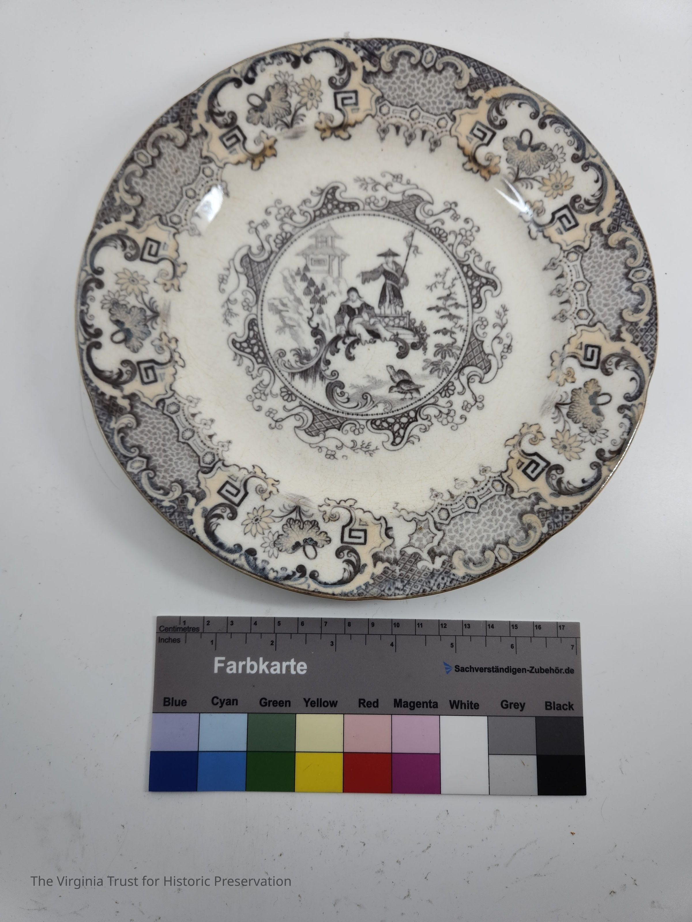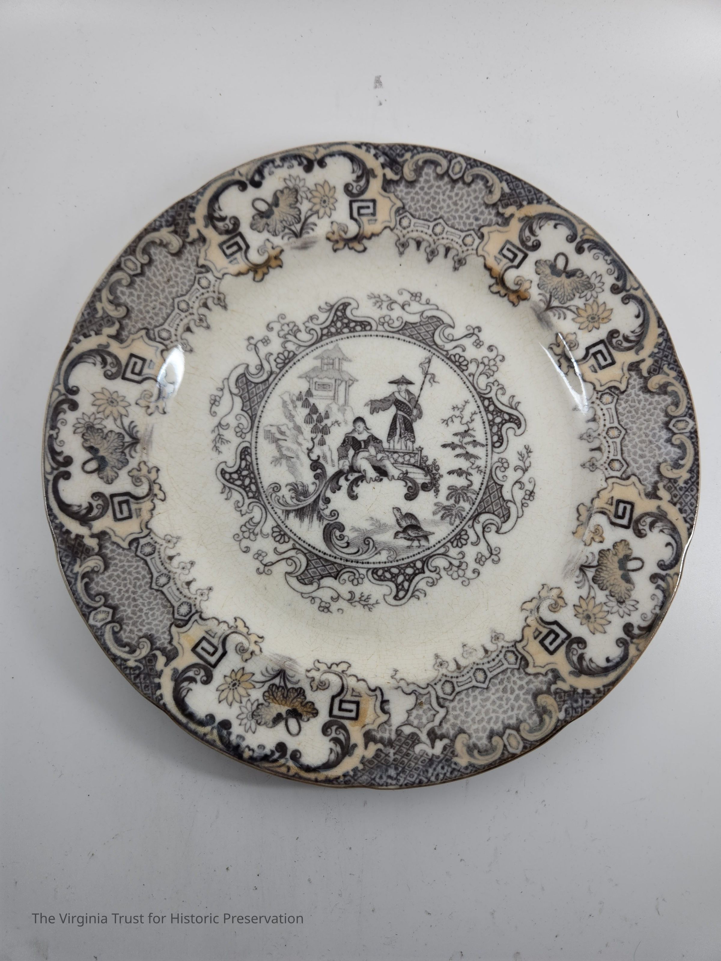 One of 14 luncheon plates. Part of a dinner service in "Mandarin" pattern. Brown lustre and grey with a central circular reserve of a Chinese scene, the border decorated with scrolls, pseudo-Chinese motifs and flowers. English.Dimensions