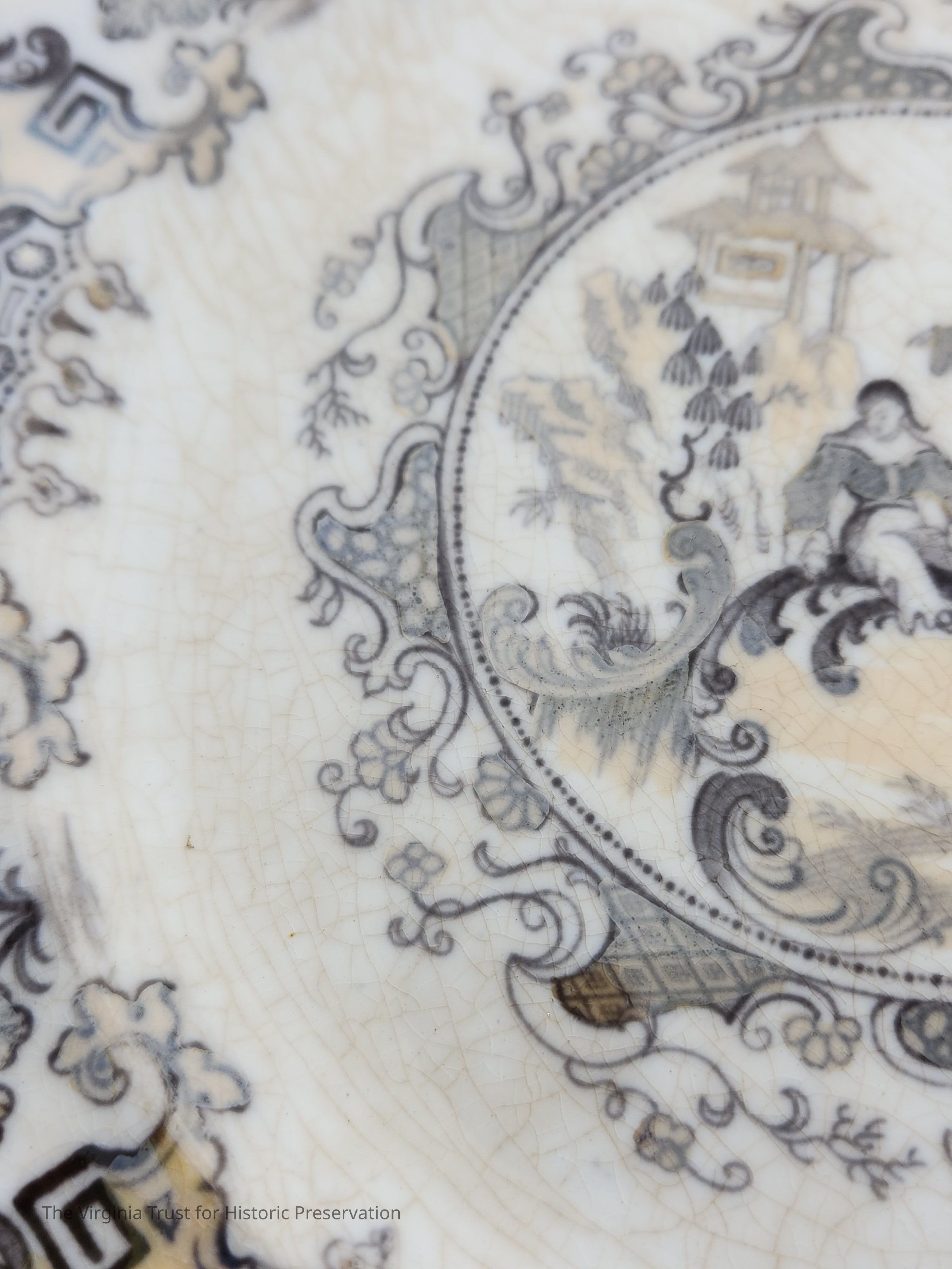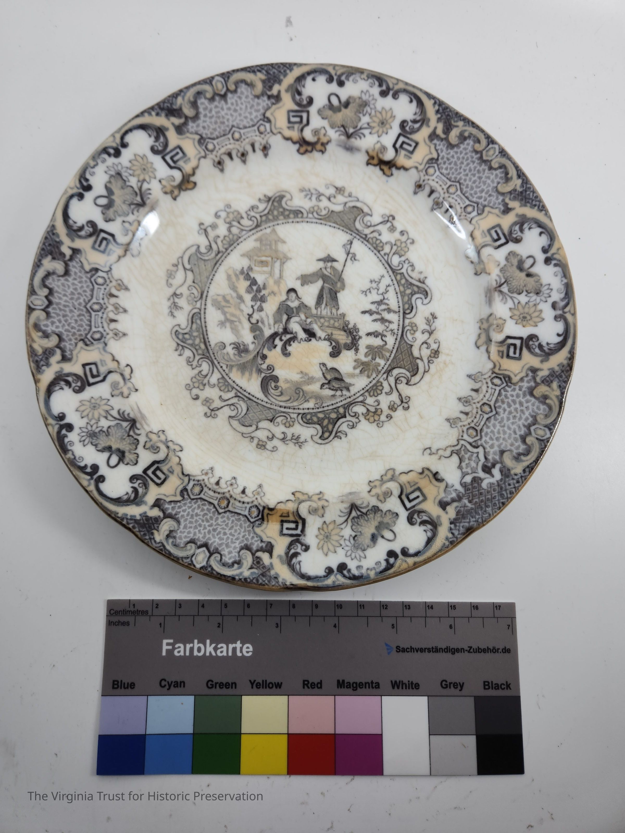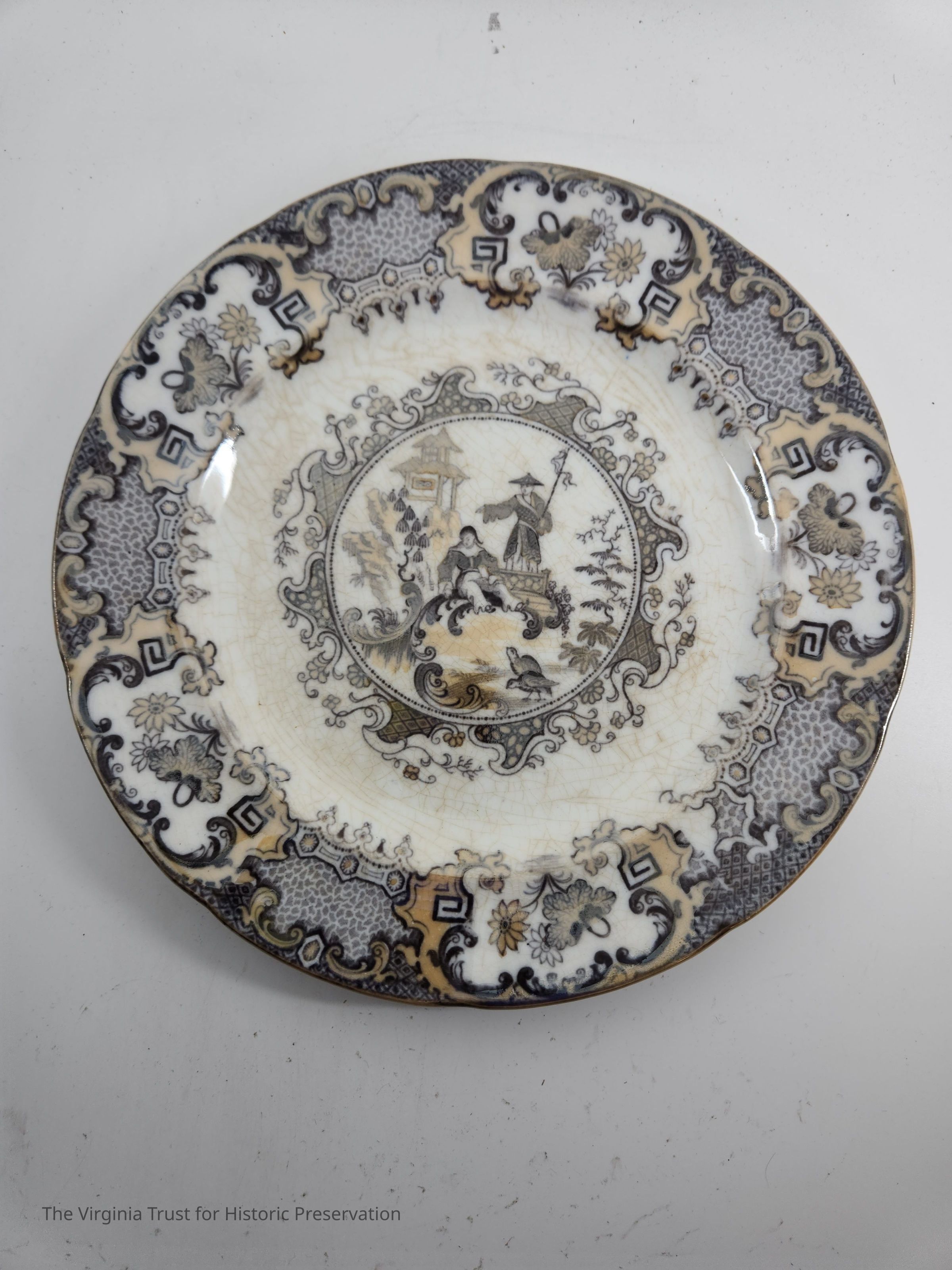 One of 14 luncheon plates. Part of a dinner service in "Mandarin" pattern. Brown lustre and grey with a central circular reserve of a Chinese scene, the border decorated with scrolls, pseudo-Chinese motifs and flowers. English.Dimensions