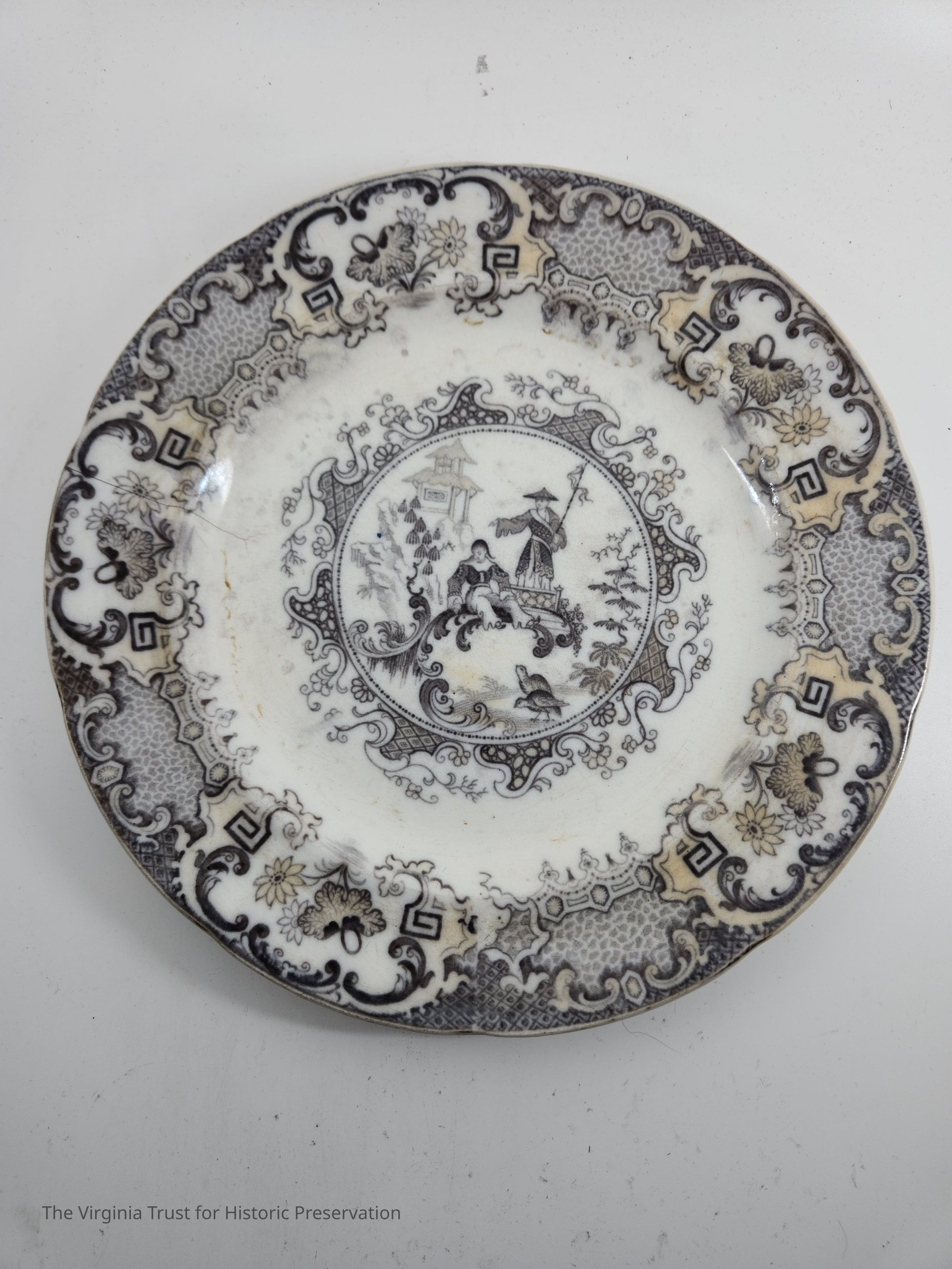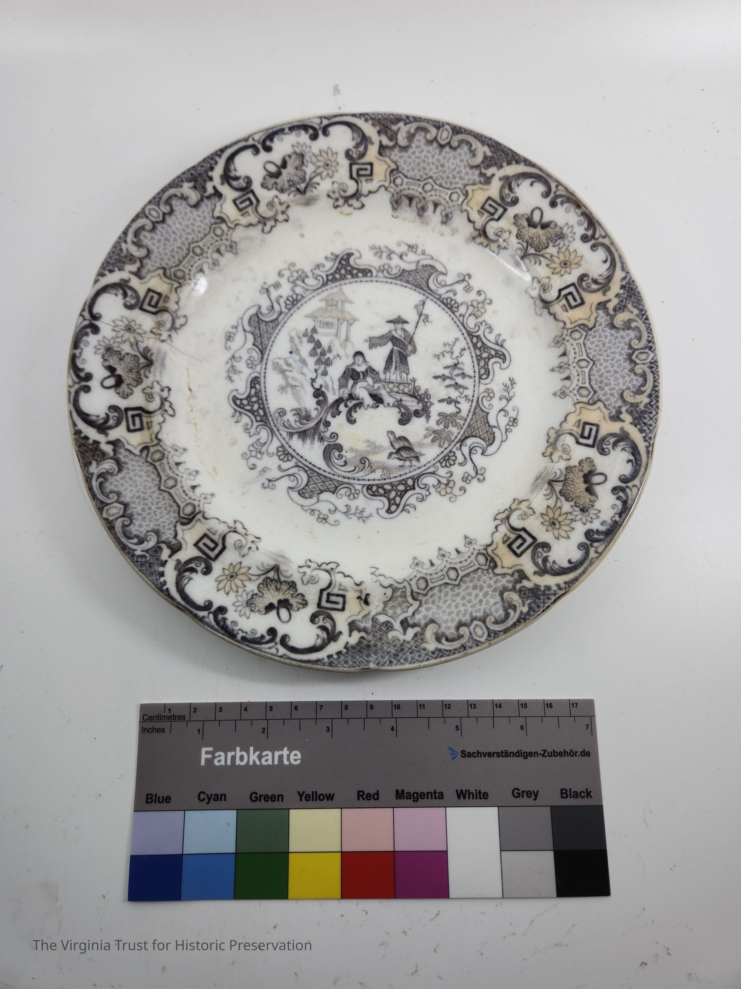One of 14 luncheon plates. Part of a dinner service in "Mandarin" pattern. Brown lustre and grey with a central circular reserve of a Chinese scene, the border decorated with scrolls, pseudo-Chinese motifs and flowers. English.Dimensions