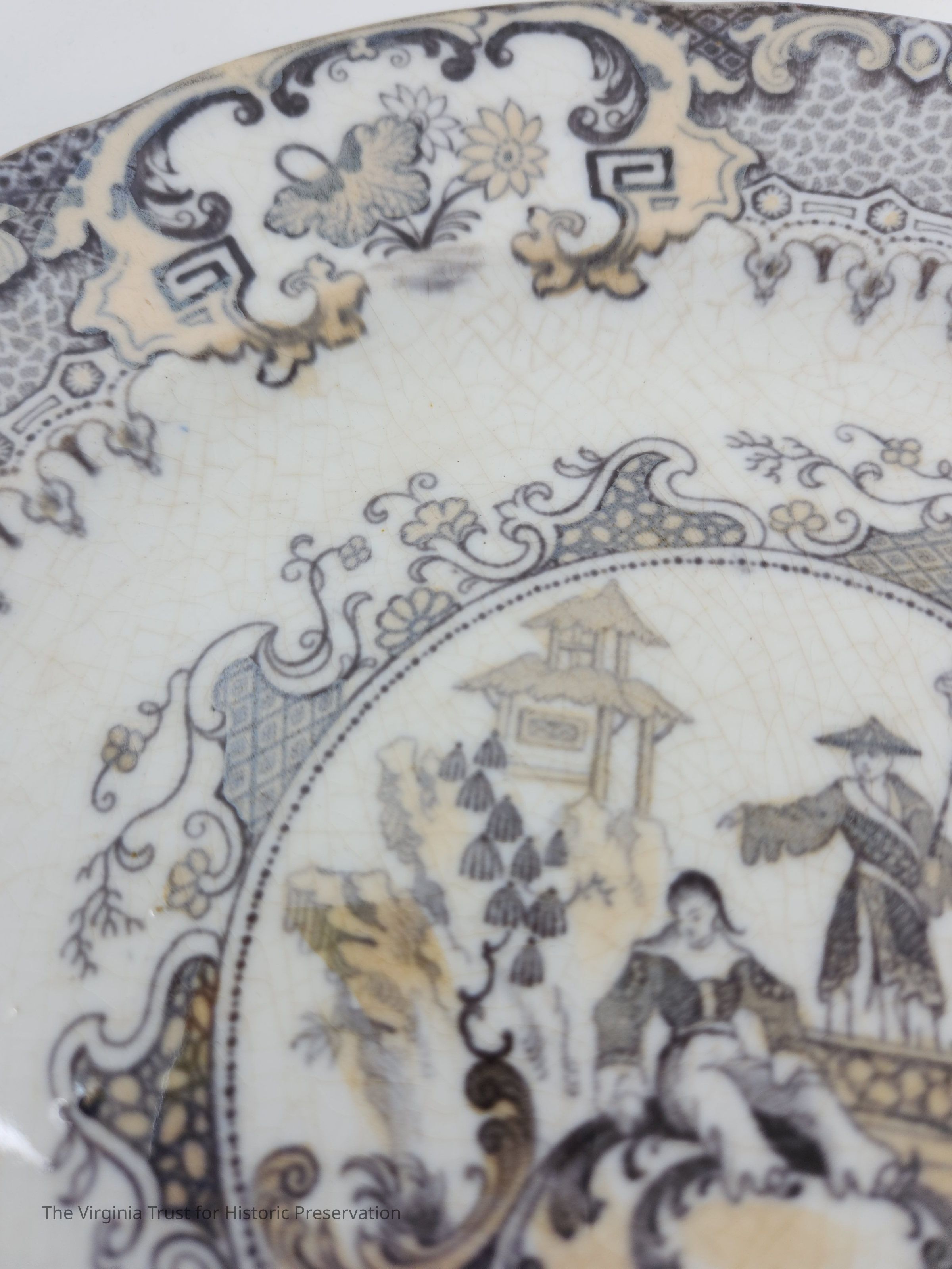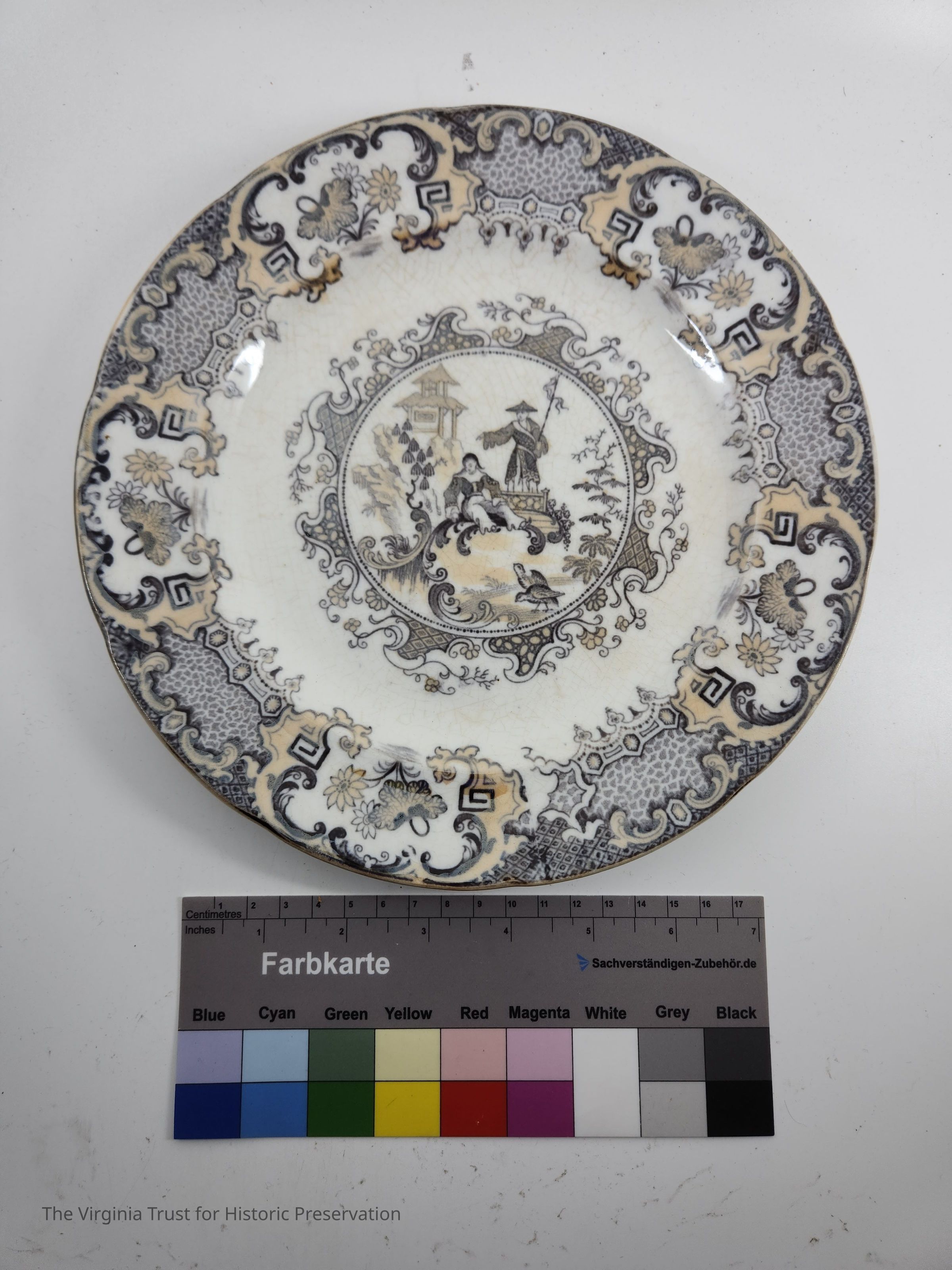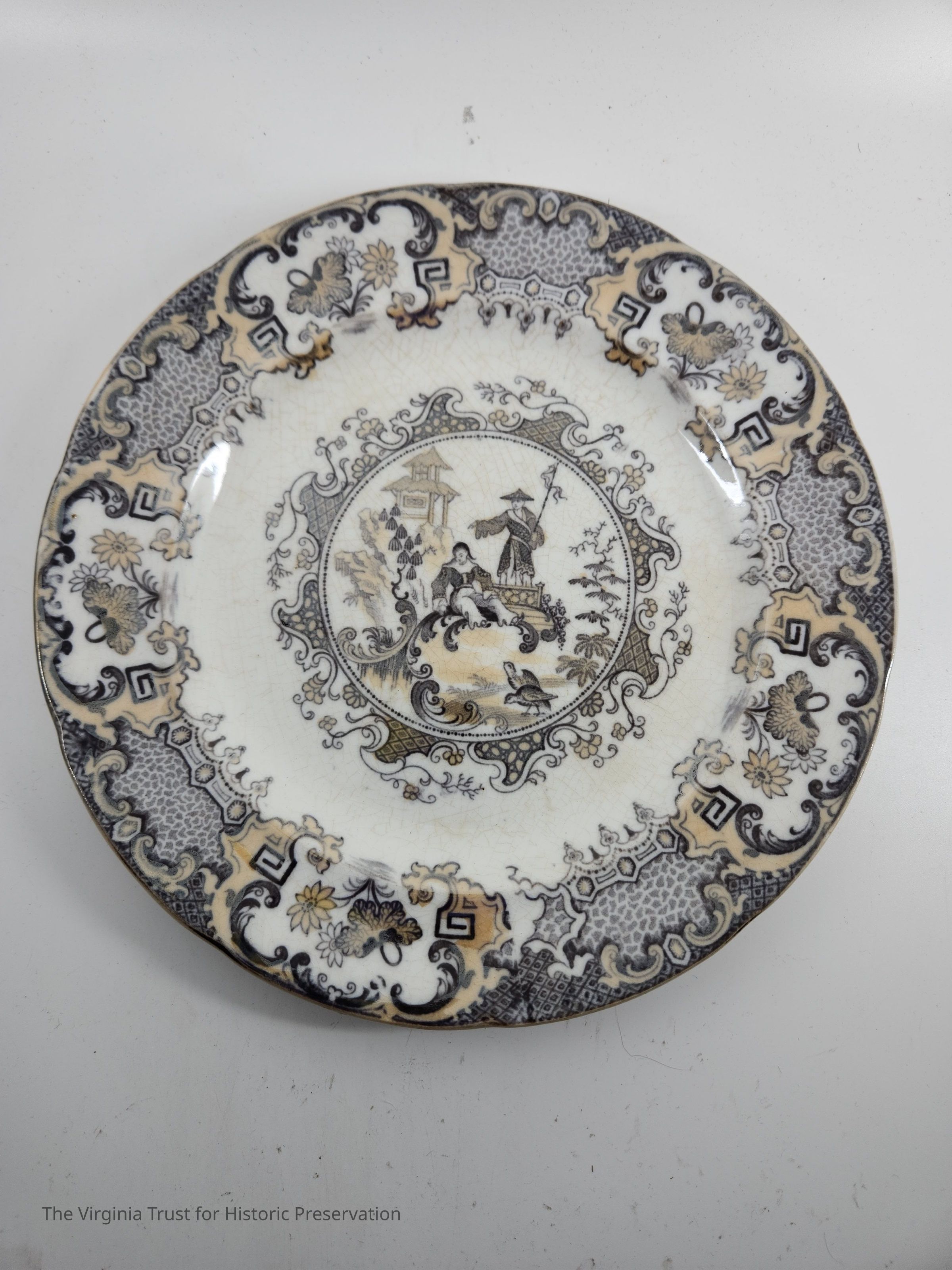 One of 14 luncheon plates. Part of a dinner service in "Mandarin" pattern. Brown lustre and grey with a central circular reserve of a Chinese scene, the border decorated with scrolls, pseudo-Chinese motifs and flowers. English.Dimensions