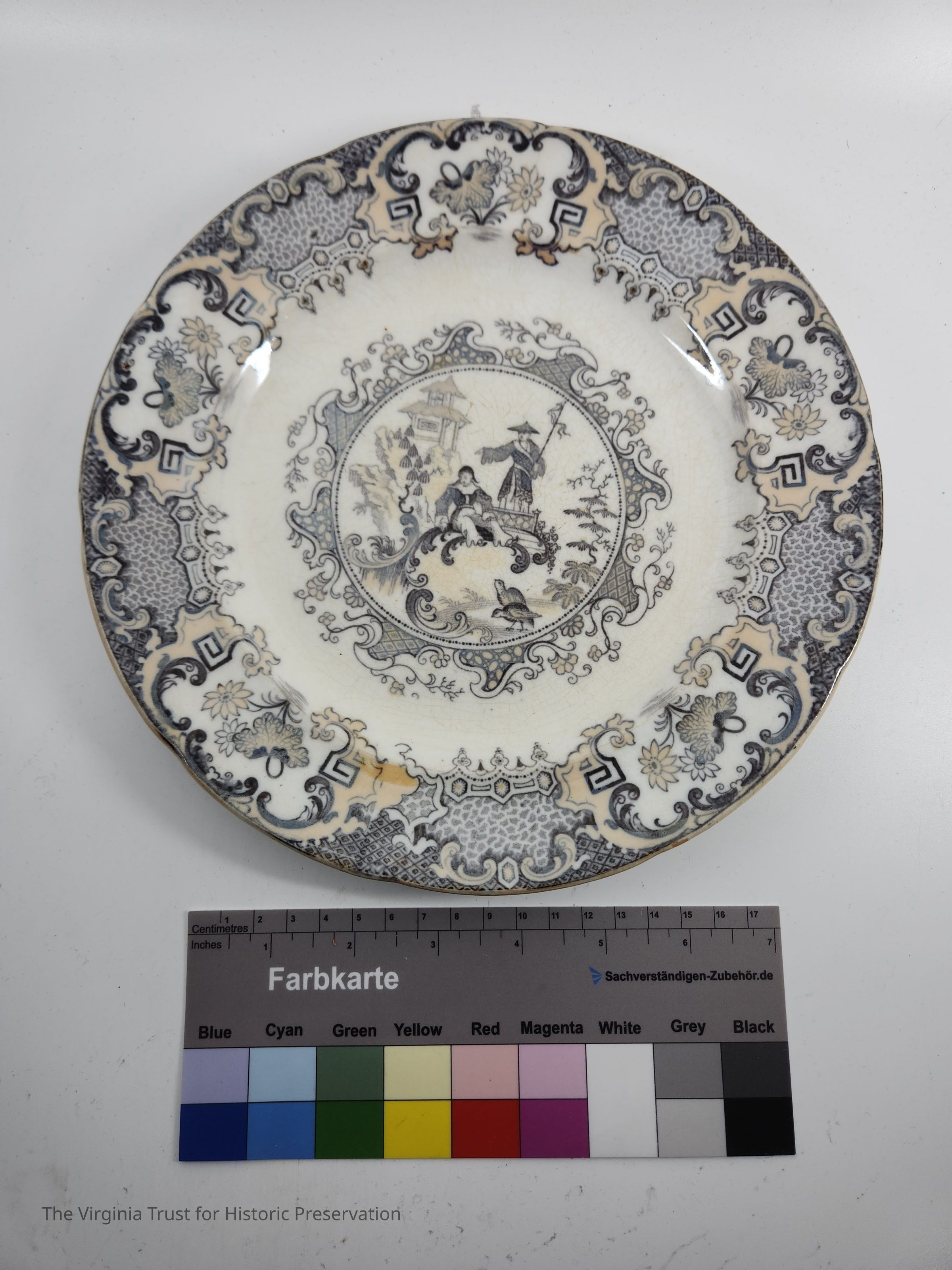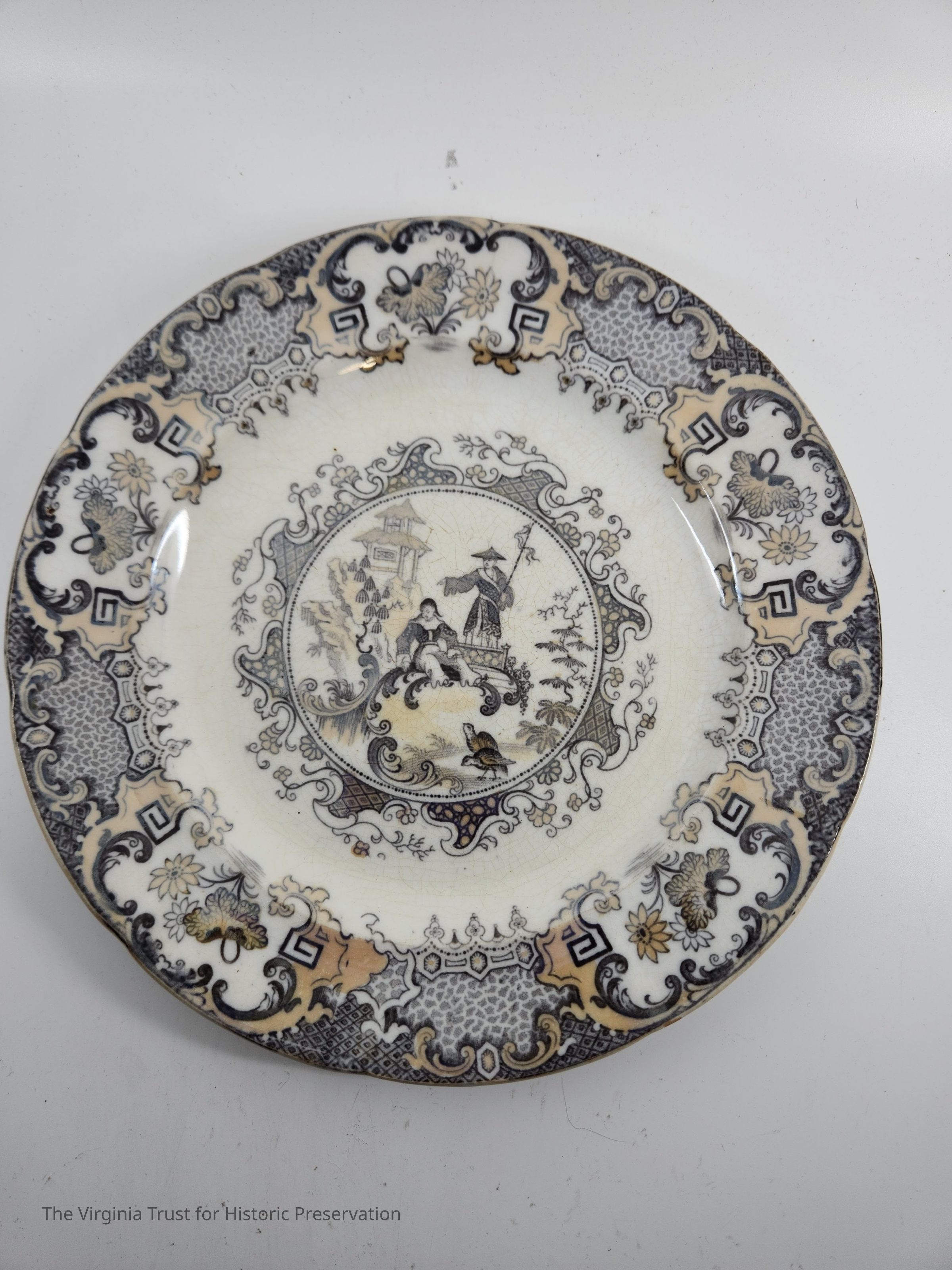 One of 14 luncheon plates. Part of a dinner service in "Mandarin" pattern. Brown lustre and grey with a central circular reserve of a Chinese scene, the border decorated with scrolls, pseudo-Chinese motifs and flowers. English.Dimensions