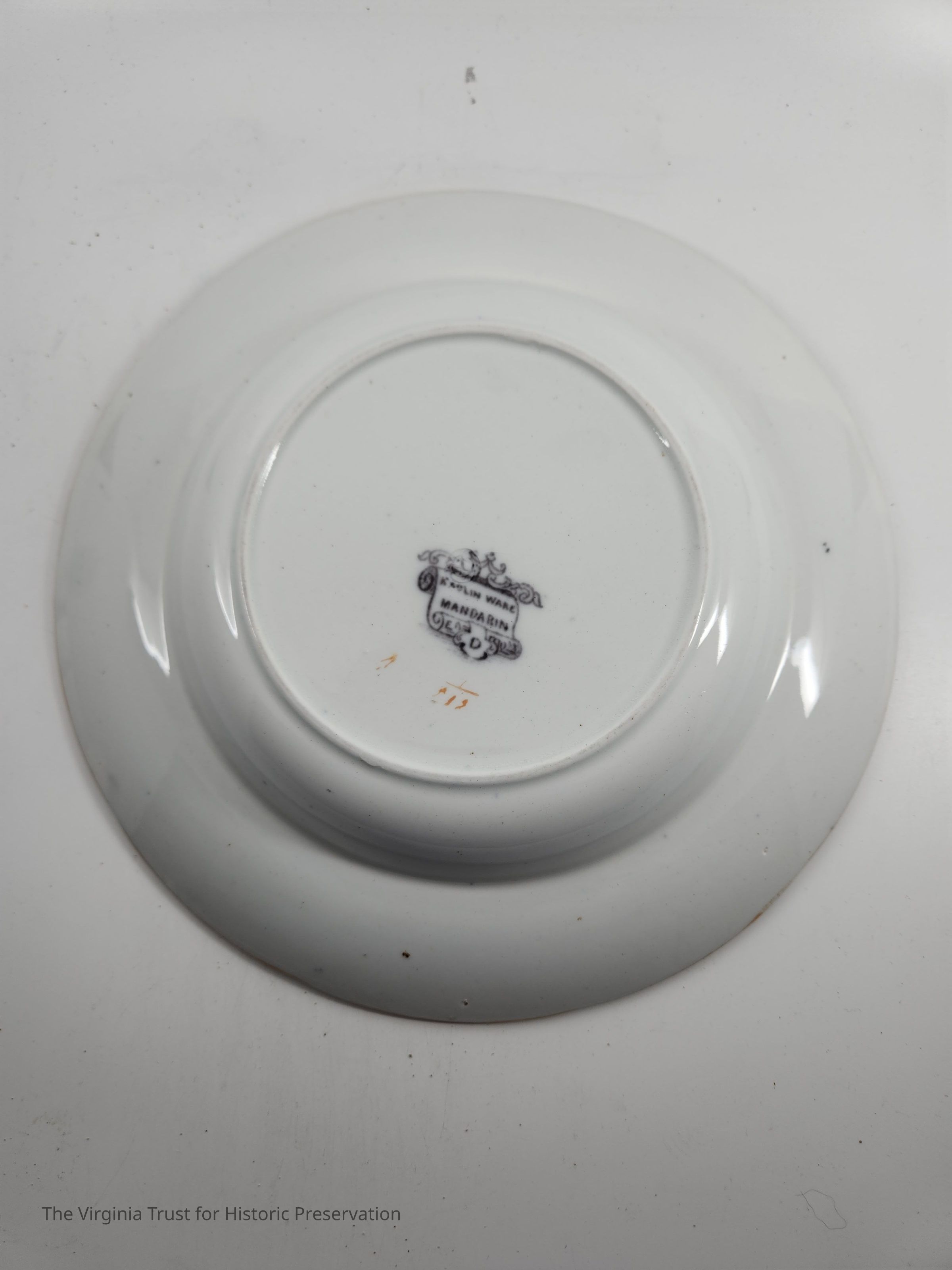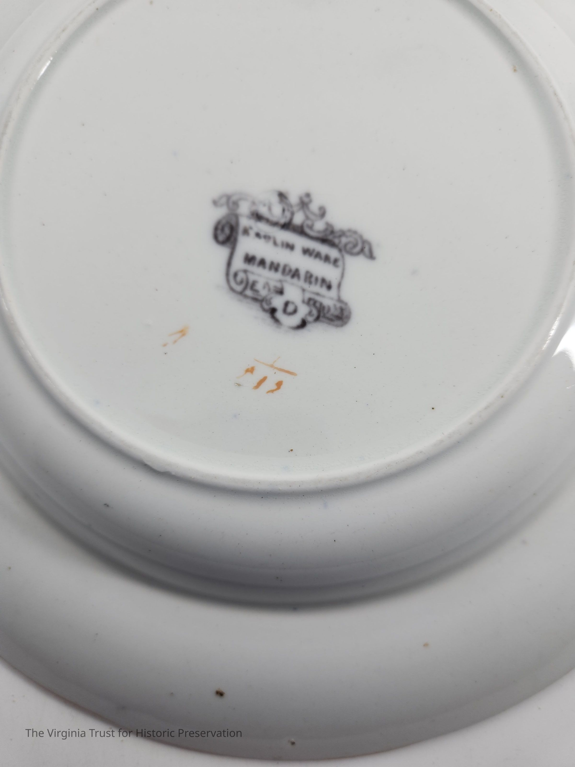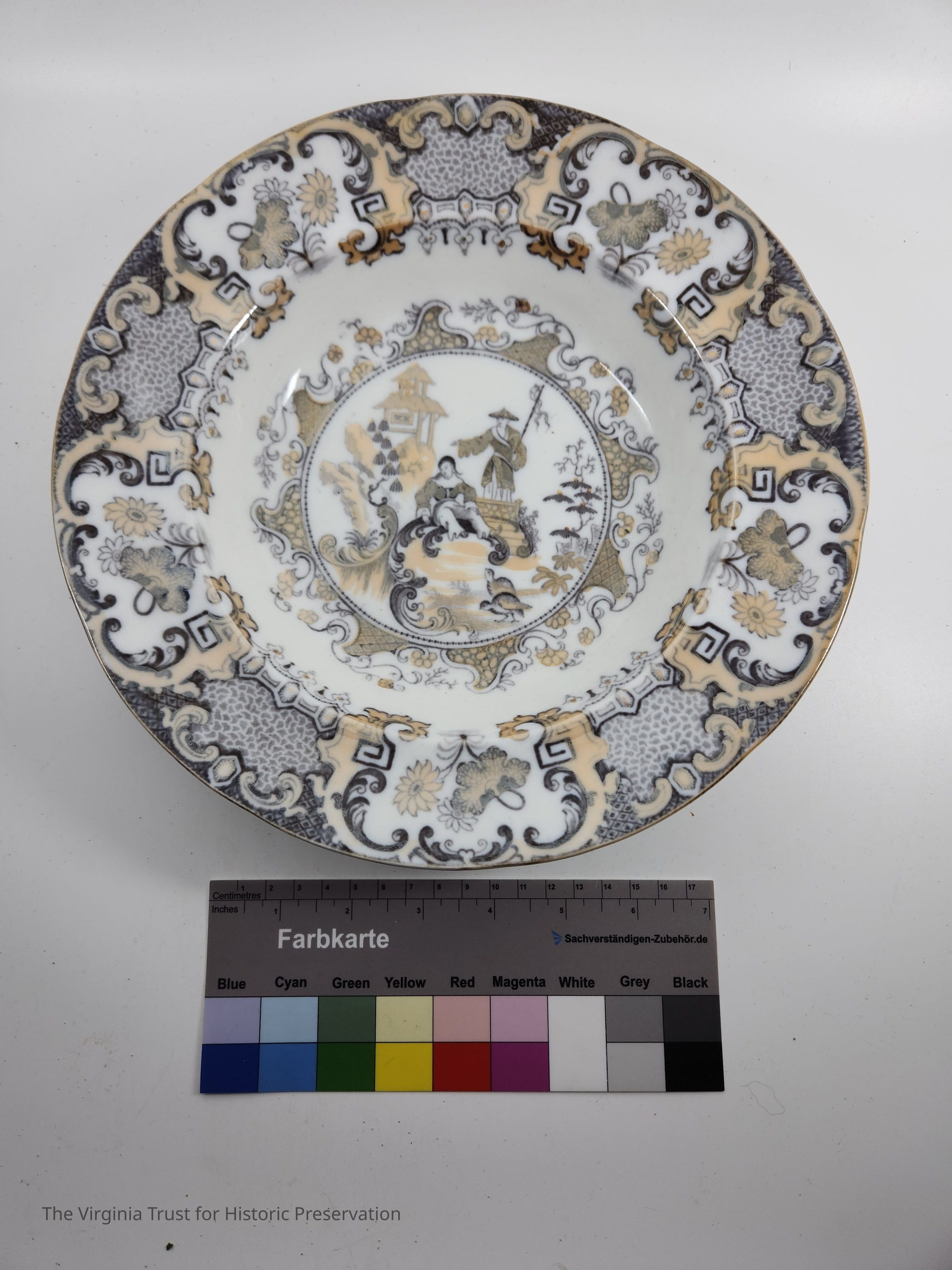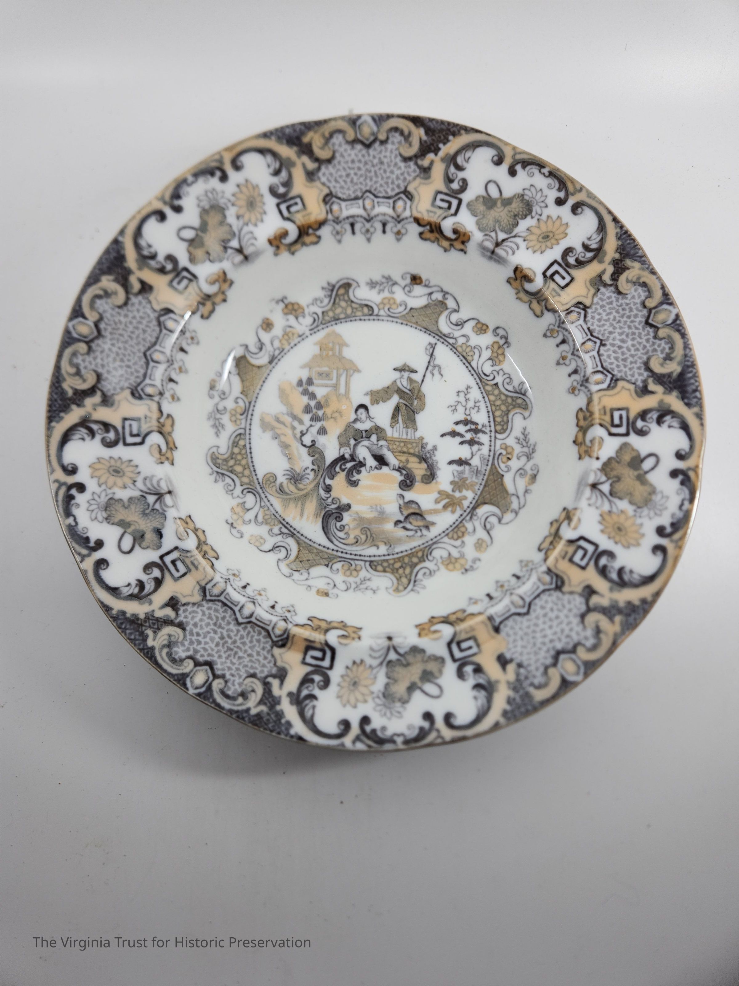 One of 5 soup bowls. Part of a dinner service in "Mandarin" pattern. Brown lustre and grey with a central circular reserve of a Chinese scene, the border decorated with scrolls, pseudo-Chinese motifs and flowers. English.Dimensions