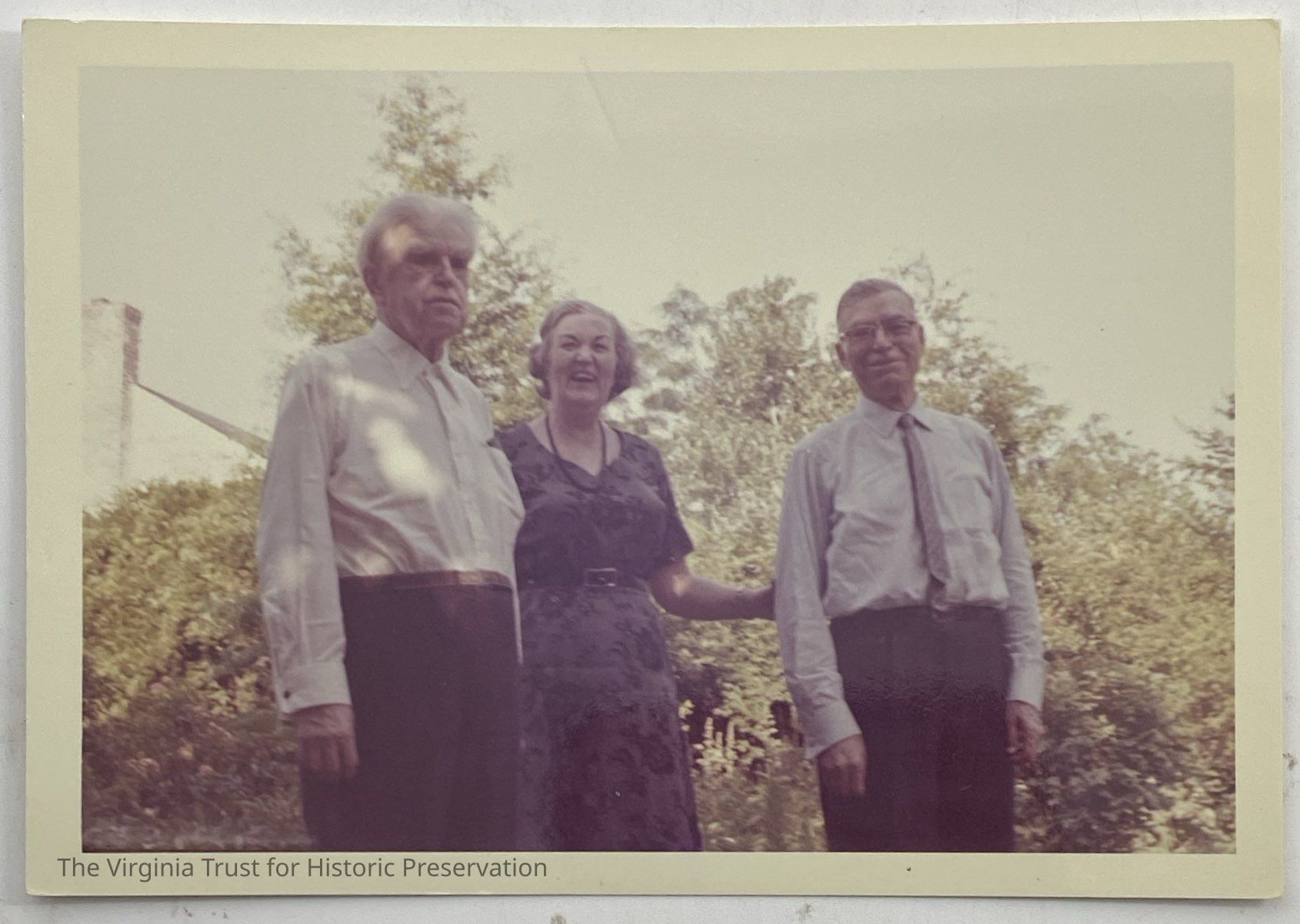 Color photograph of John L. Lewis standing with a woman (Ms Edith C?) and man wearing glasses. Lewis stands to the left and faces away from camera while the other two look at camera. Most likely standing in the Lee-Fendall garden during the Lewis residence. Trees and adjacent house in the background. White border with straight edges.