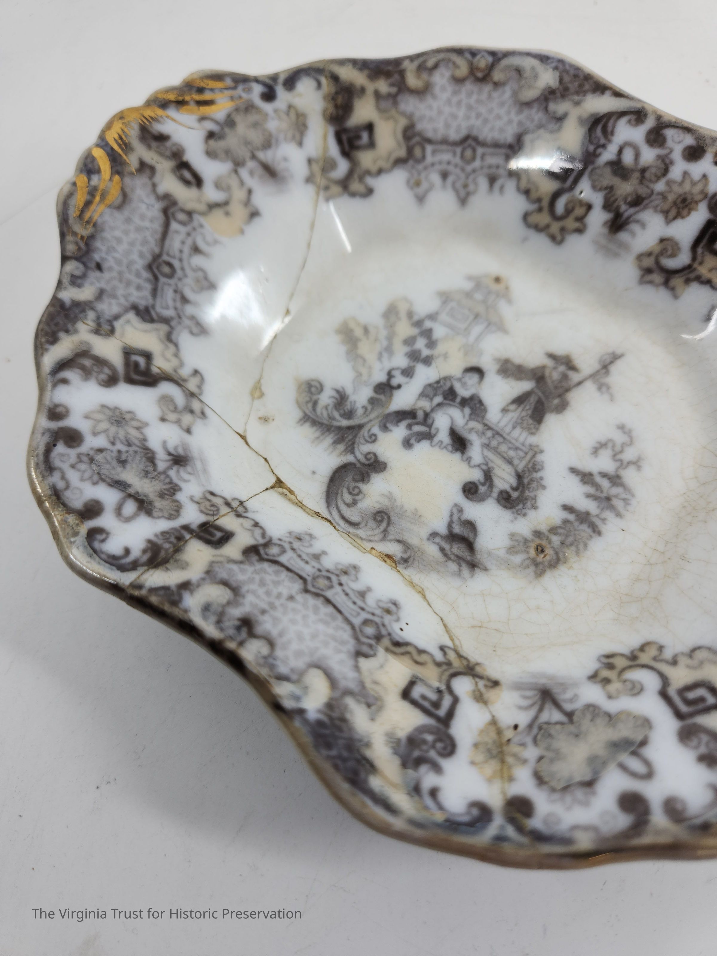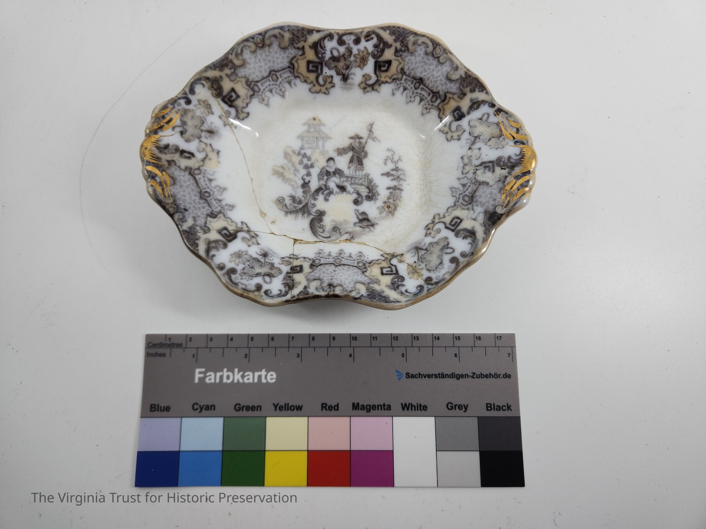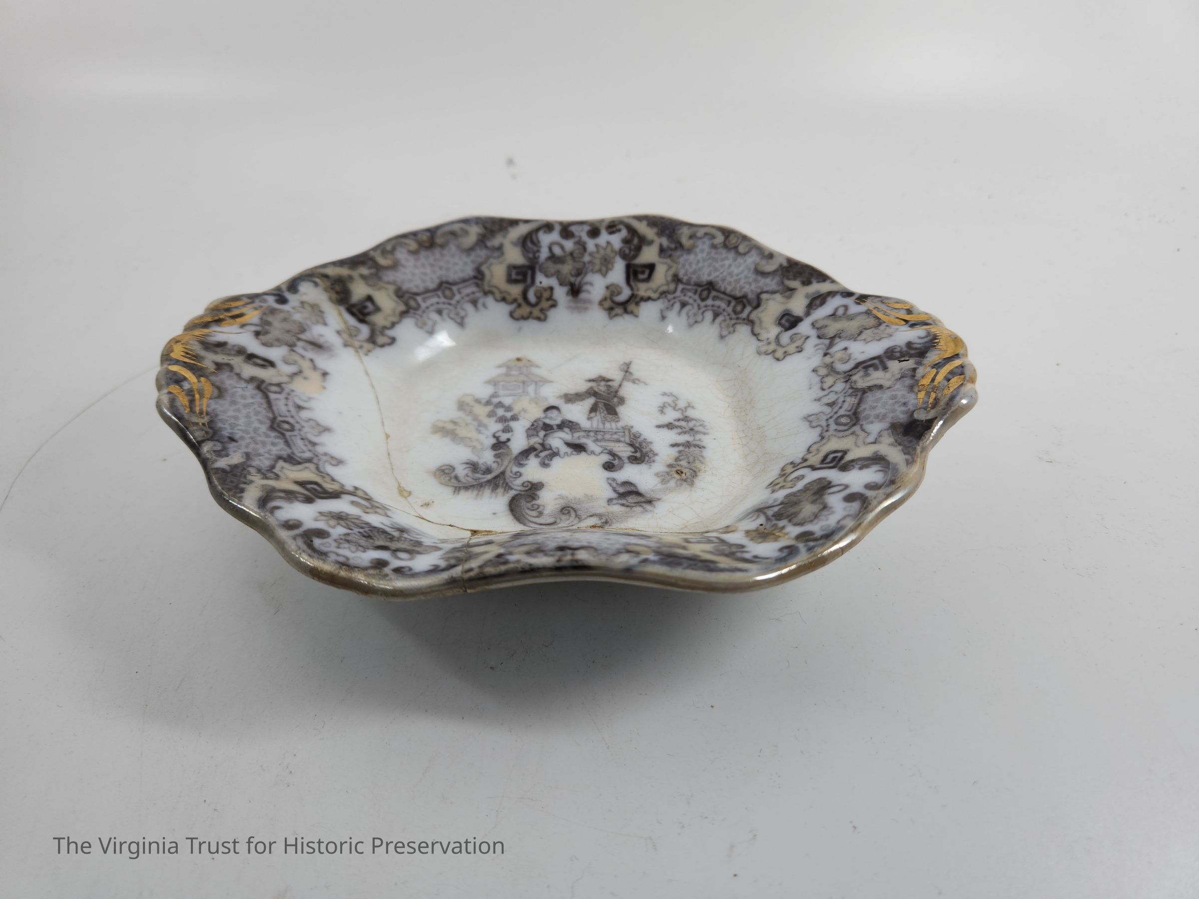 Relish Dish. Part of a dinner service in "Mandarin" pattern. Brown lustre and grey with a central circular reserve of a Chinese scene, the border decorated with scrolls, pseudo-Chinese motifs and flowers. English.Dimensions