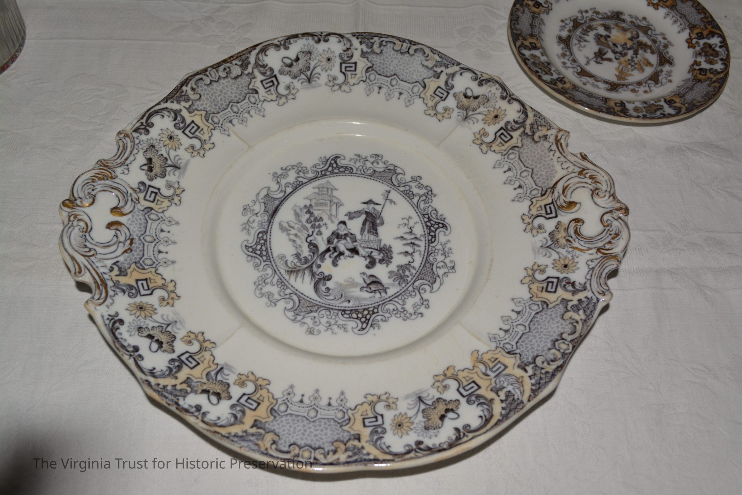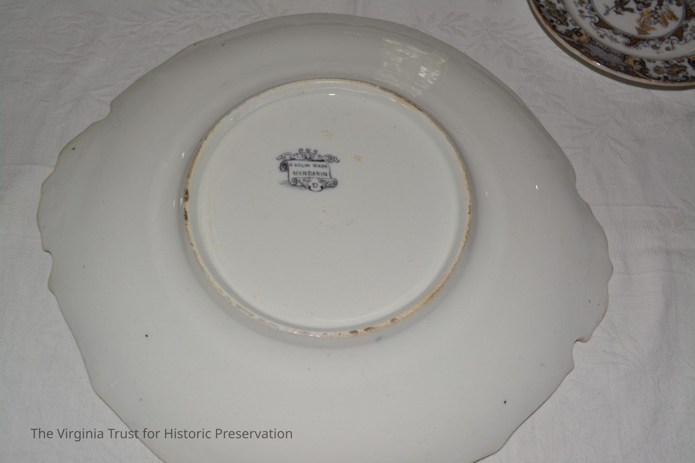 Tureen tray for the soup tureen, 1991.014XX. Part of a dinner service in "Mandarin" pattern. Brown lustre and grey with a central circular reserve of a Chinese scene, the border decorated with scrolls, pseudo-Chinese motifs and flowers. English.