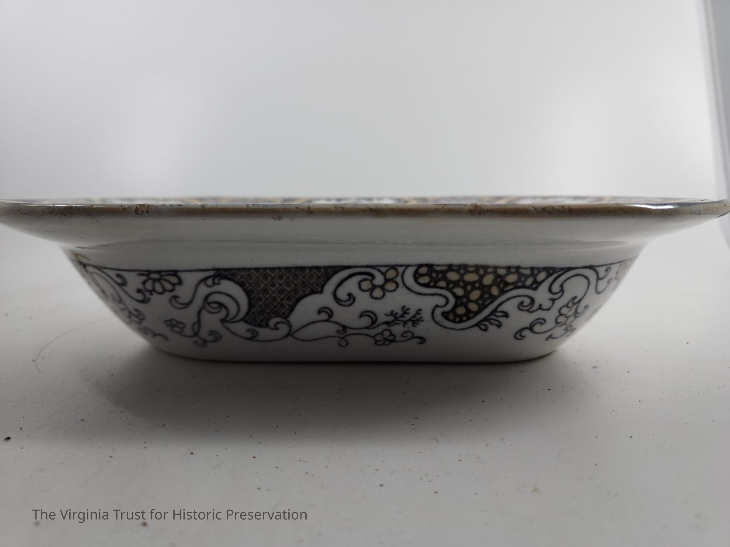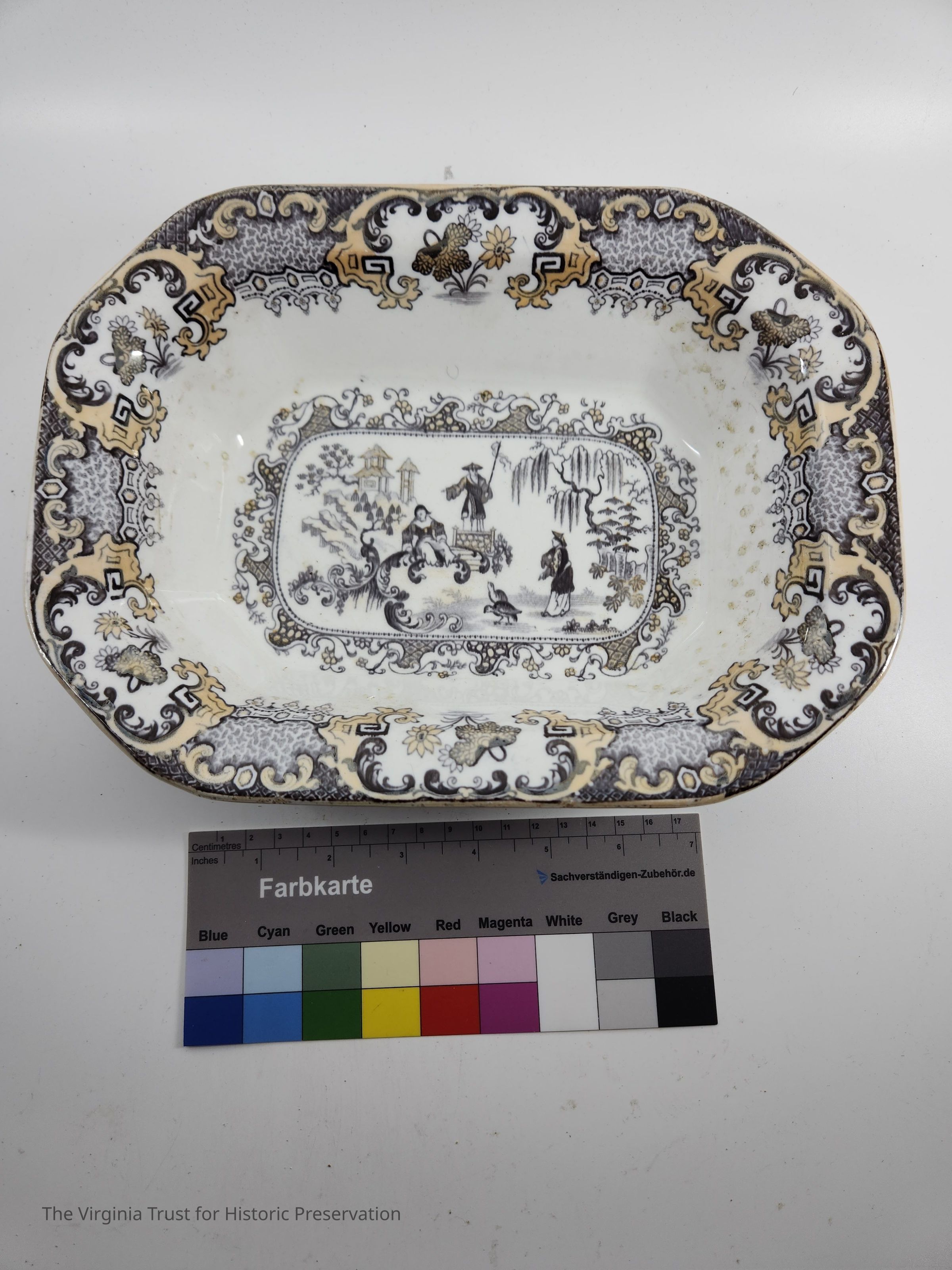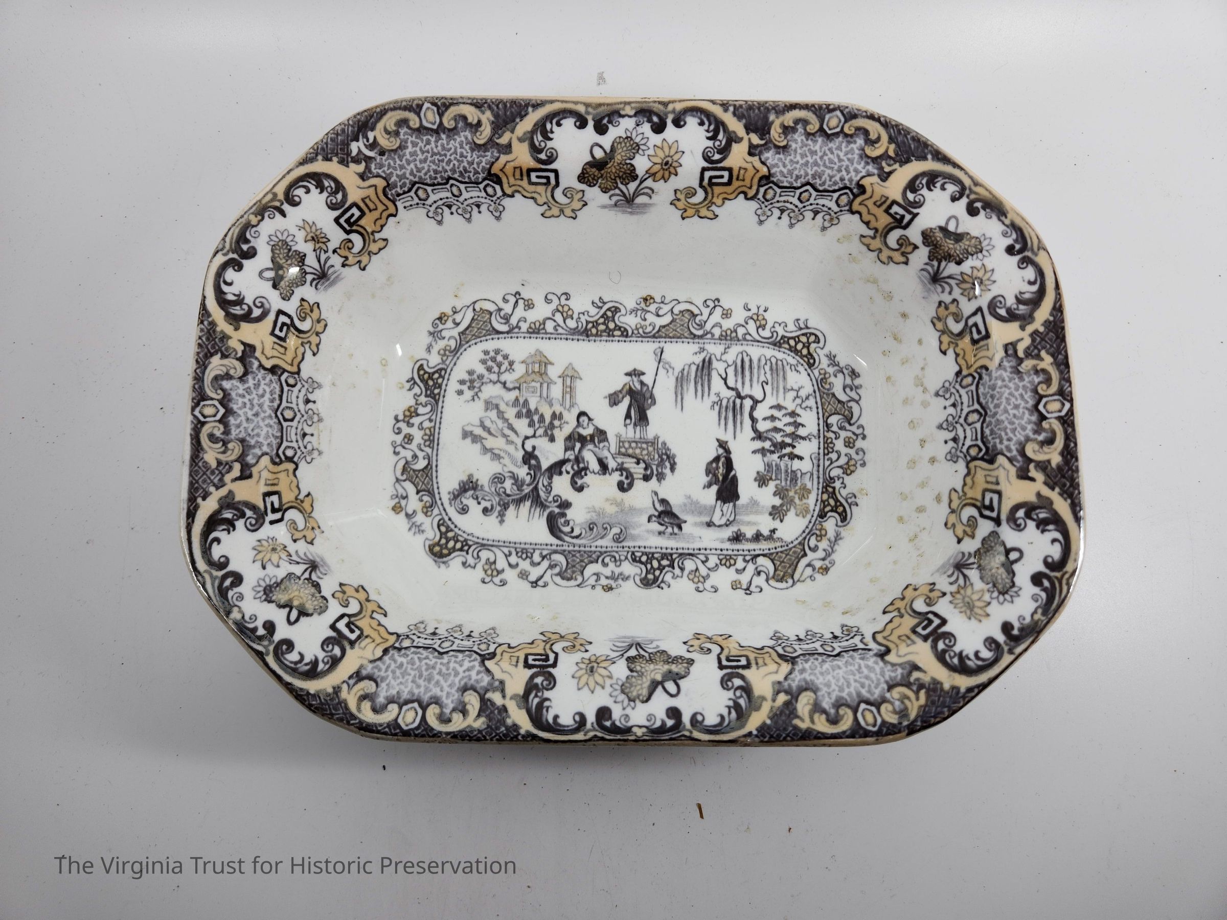 Vegetable dish. Part of a dinner service in "Mandarin" pattern. Brown lustre and grey with a central circular reserve of a Chinese scene, the border decorated with scrolls, pseudo-Chinese motifs and flowers. English.Dimensions