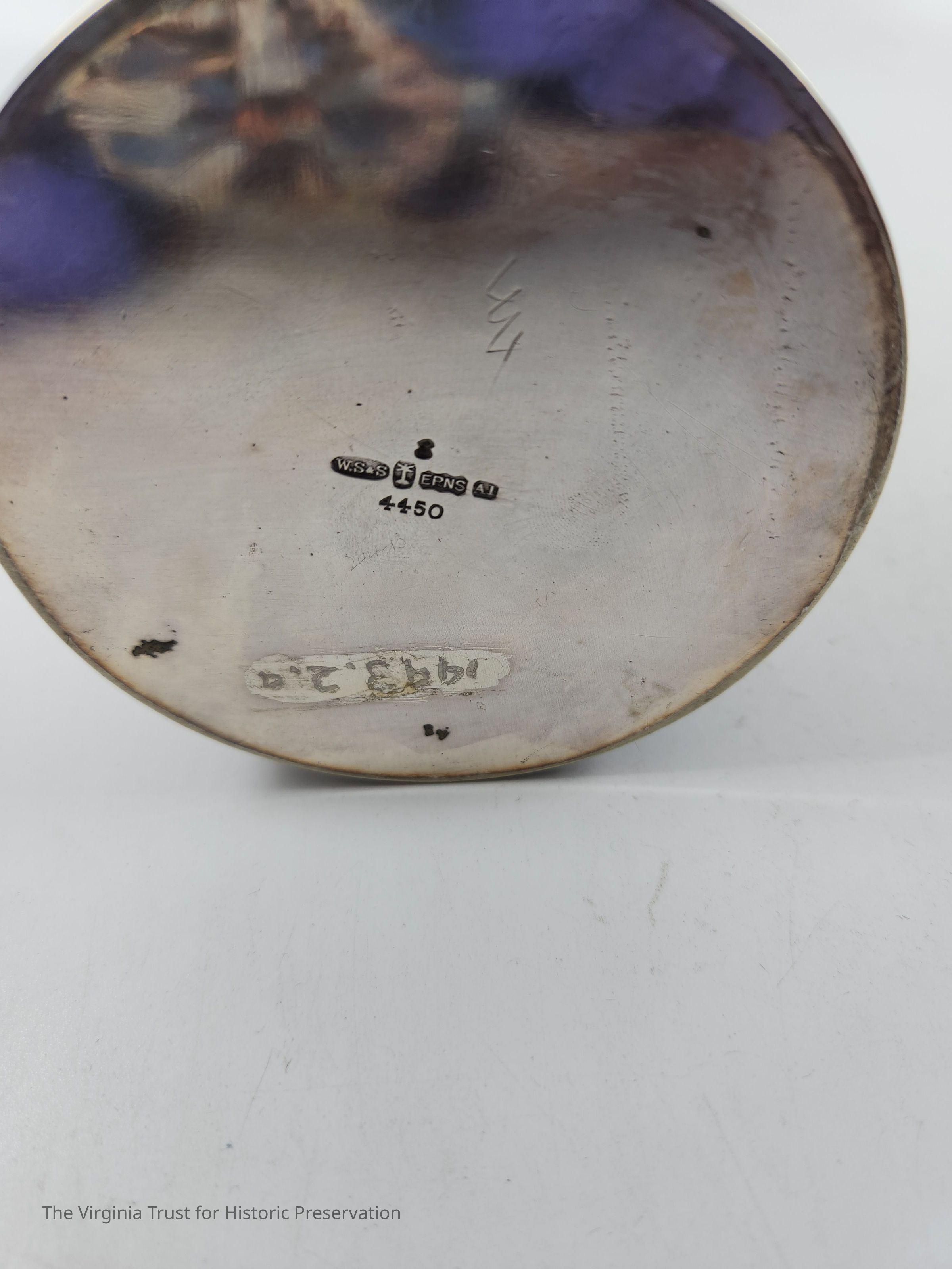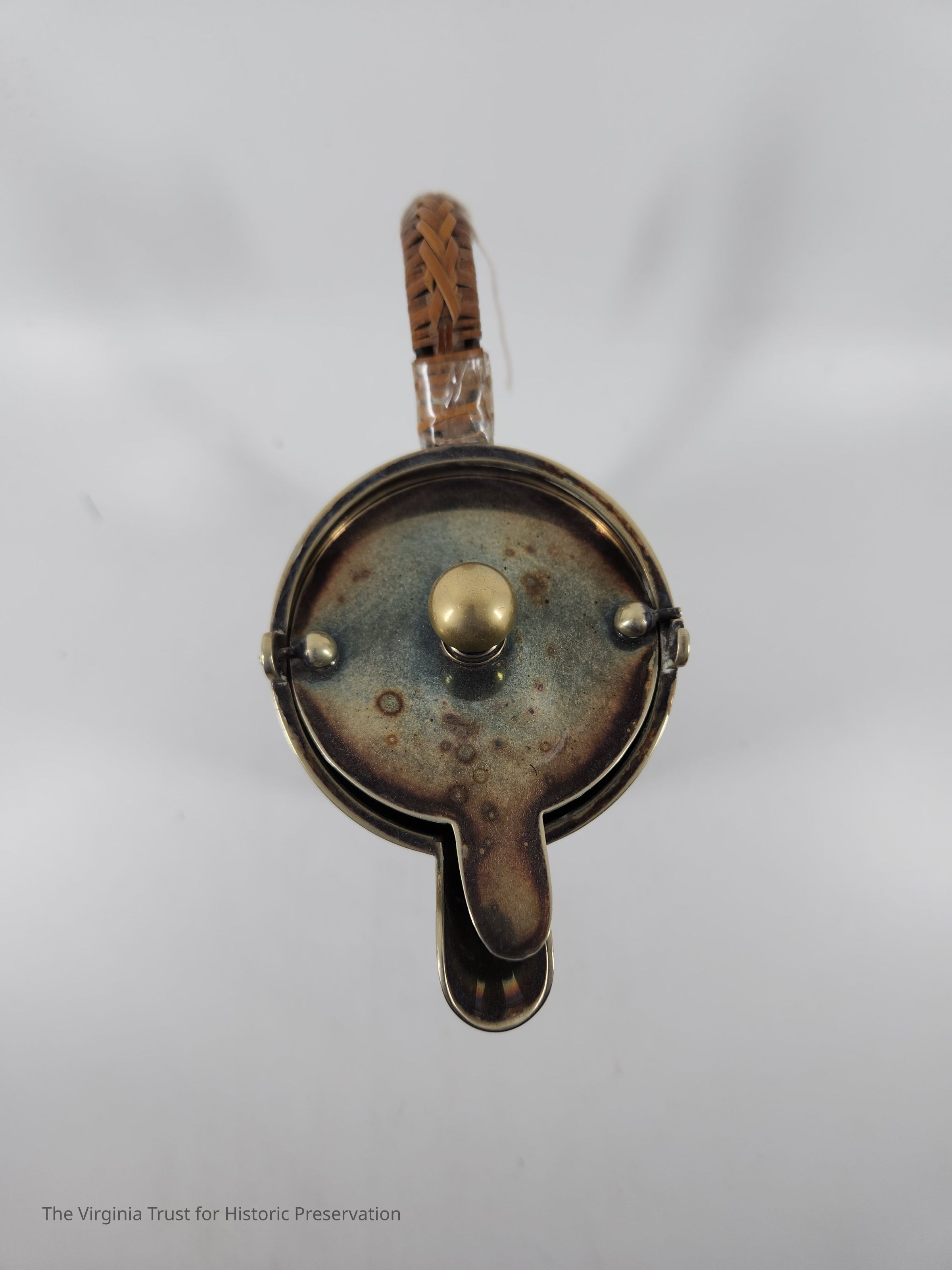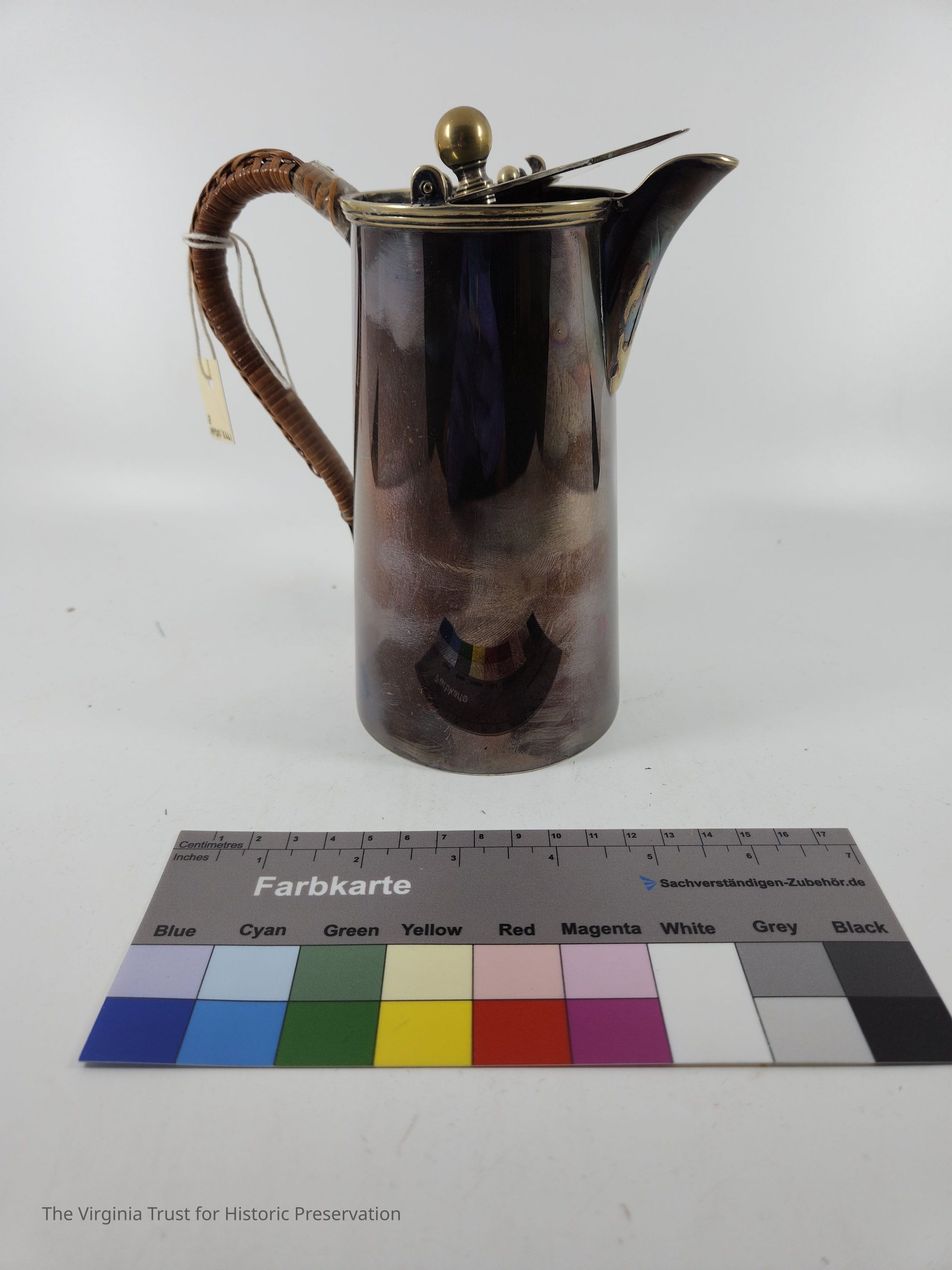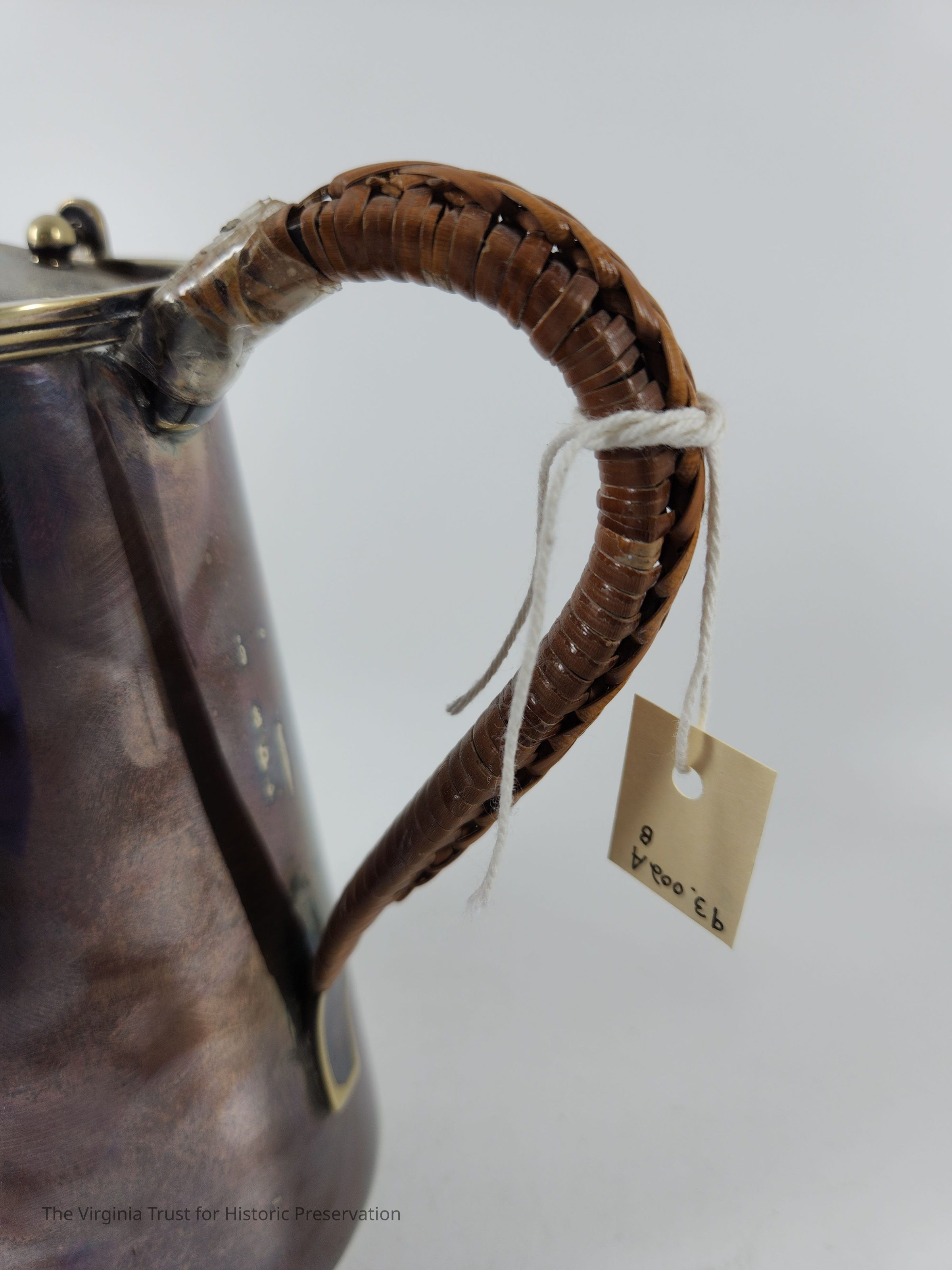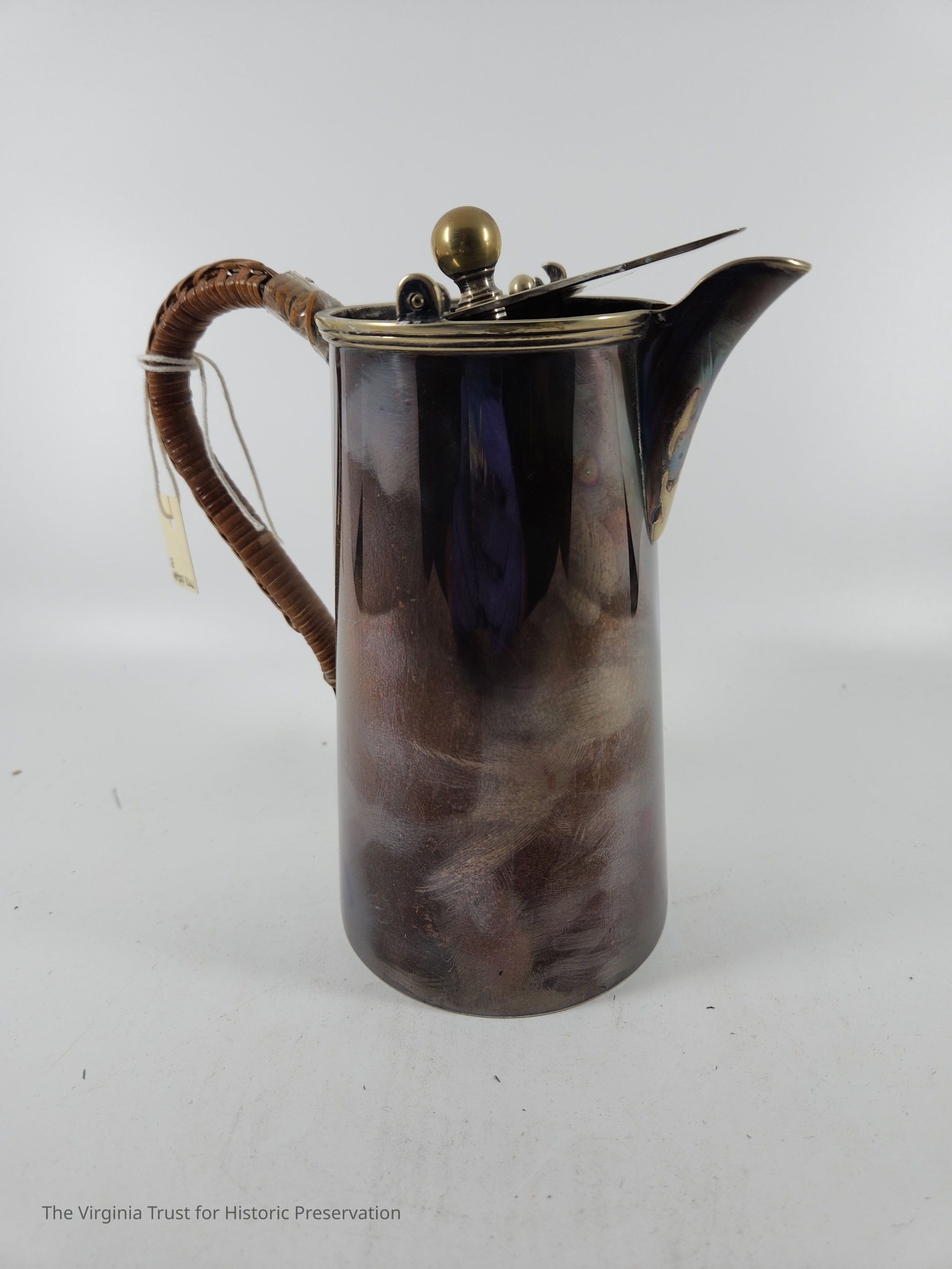 Sterling silver chocolate pot with separate pivoting lid and matching tan and brown fabric bag. Handle: Metal "trough" filled with wood and covered by woven rattan which is loose and repaired with scotch tape. Hallmark: "WSS EPN5 AJ" "4450."