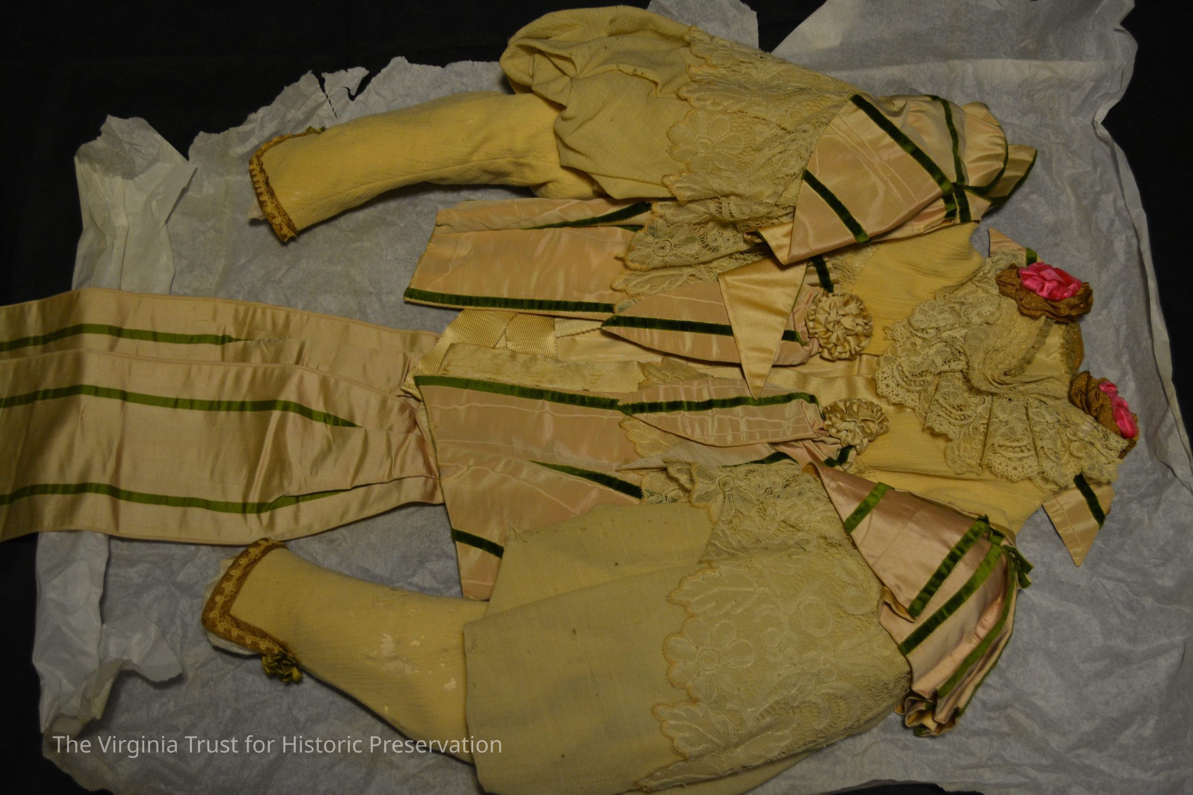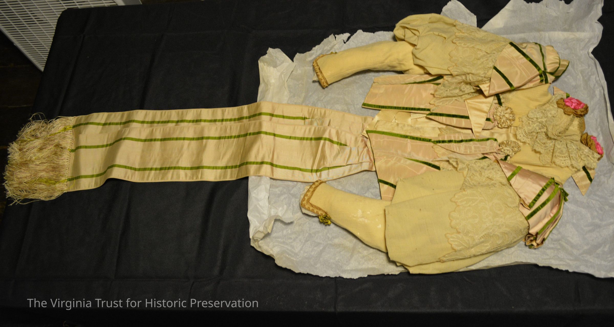 White and pale pink bodice. High Victorian style. Has puffy sleeves and a lot of trim work including green edged pink ribbons and bows. And bright pink velvet flowers. Large bow with ribbons hangs from the back. Metal hook clasps. File says 1890s wedding dress - soft heavy gauze skirt. Ornate bodice with front closure, "Gibson" sleeves, and rainbow trim.