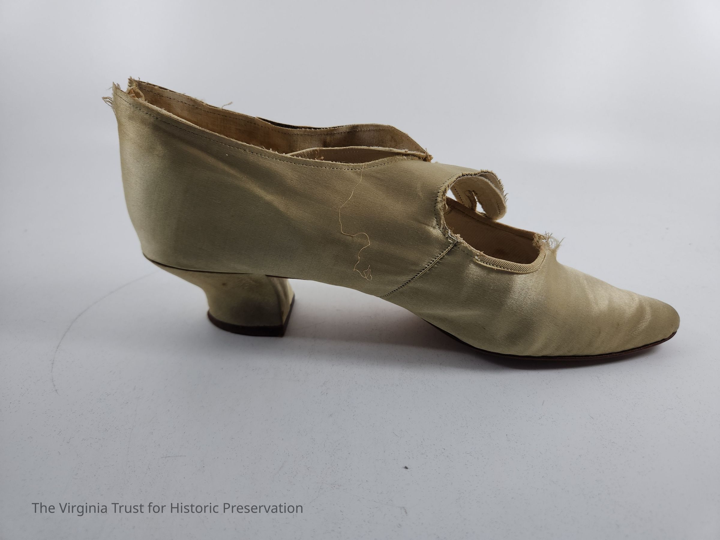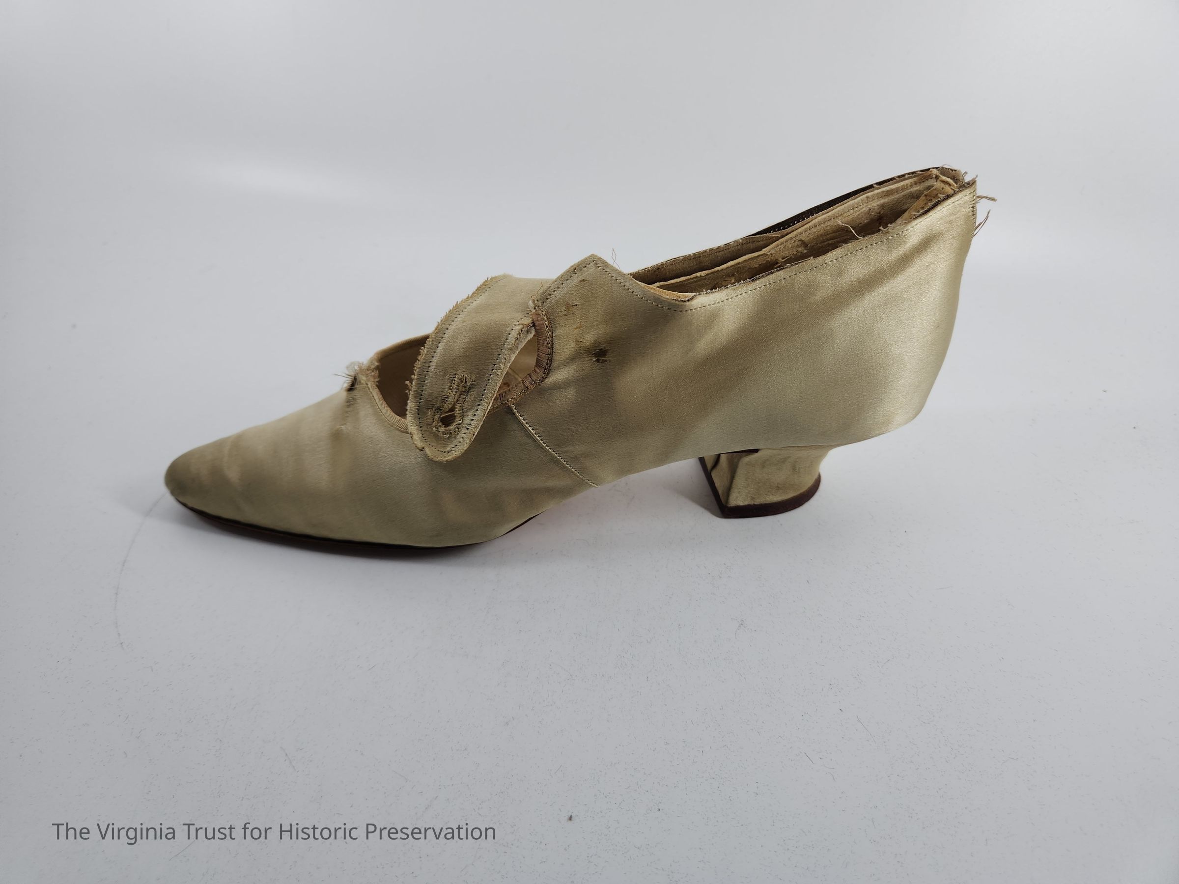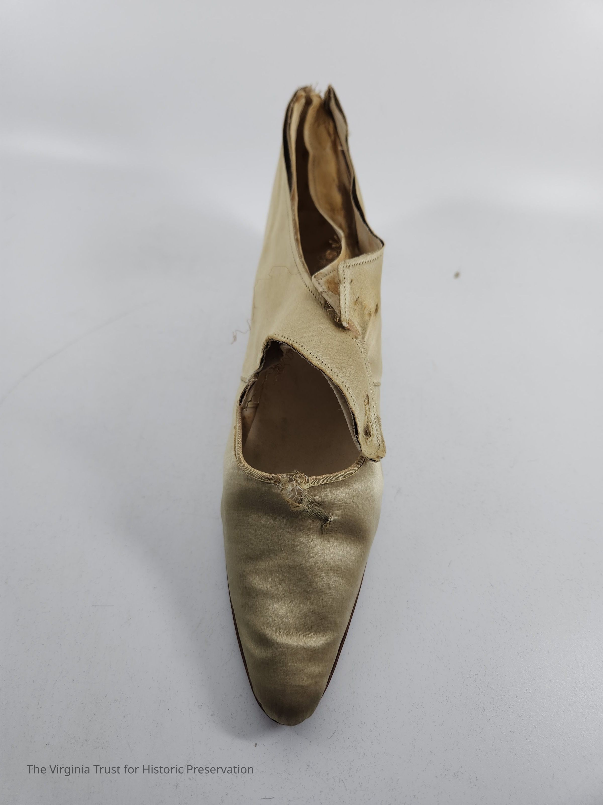 Pair of light green sating wedding slippers. Shoes received with shoe horns.