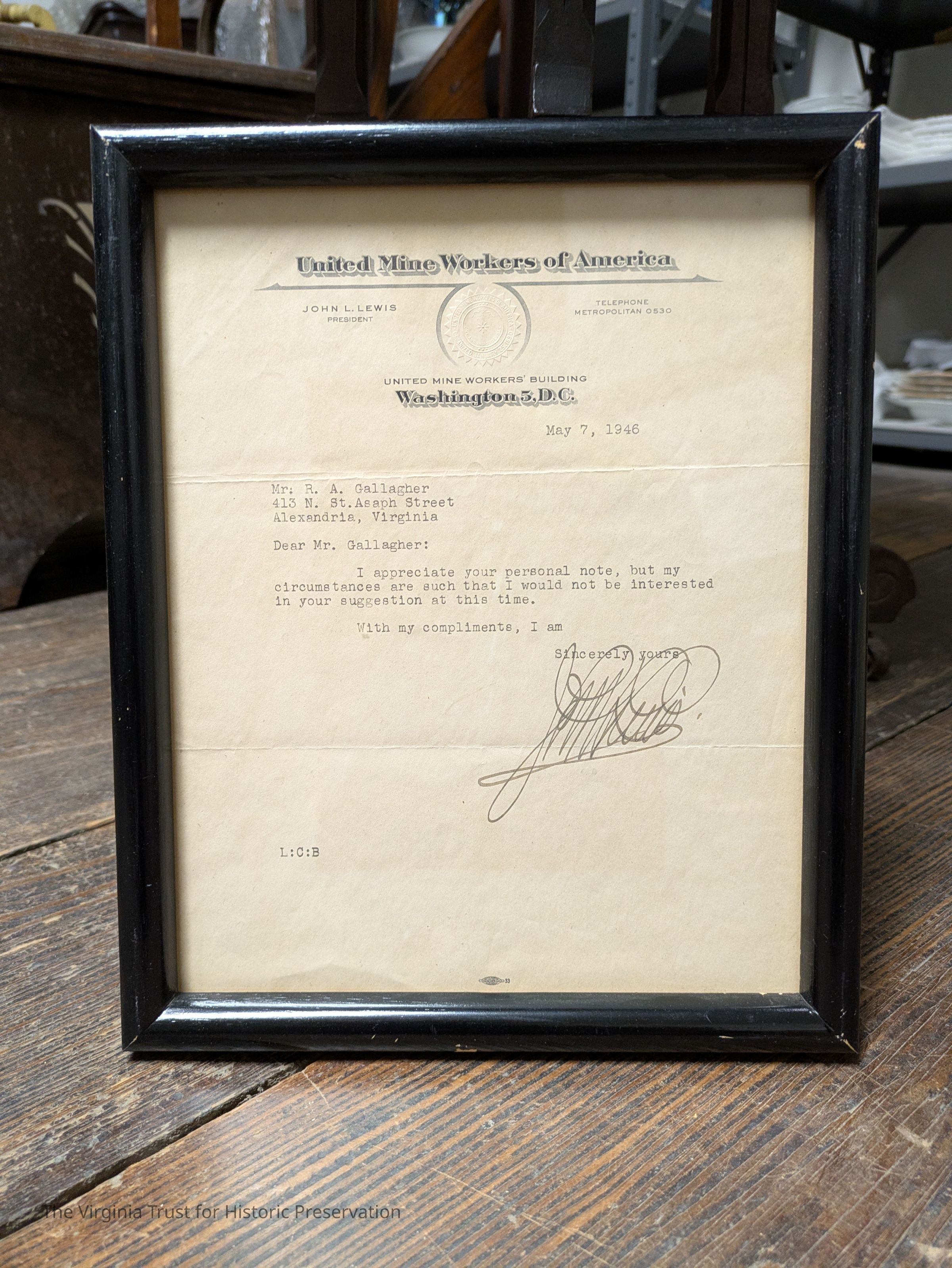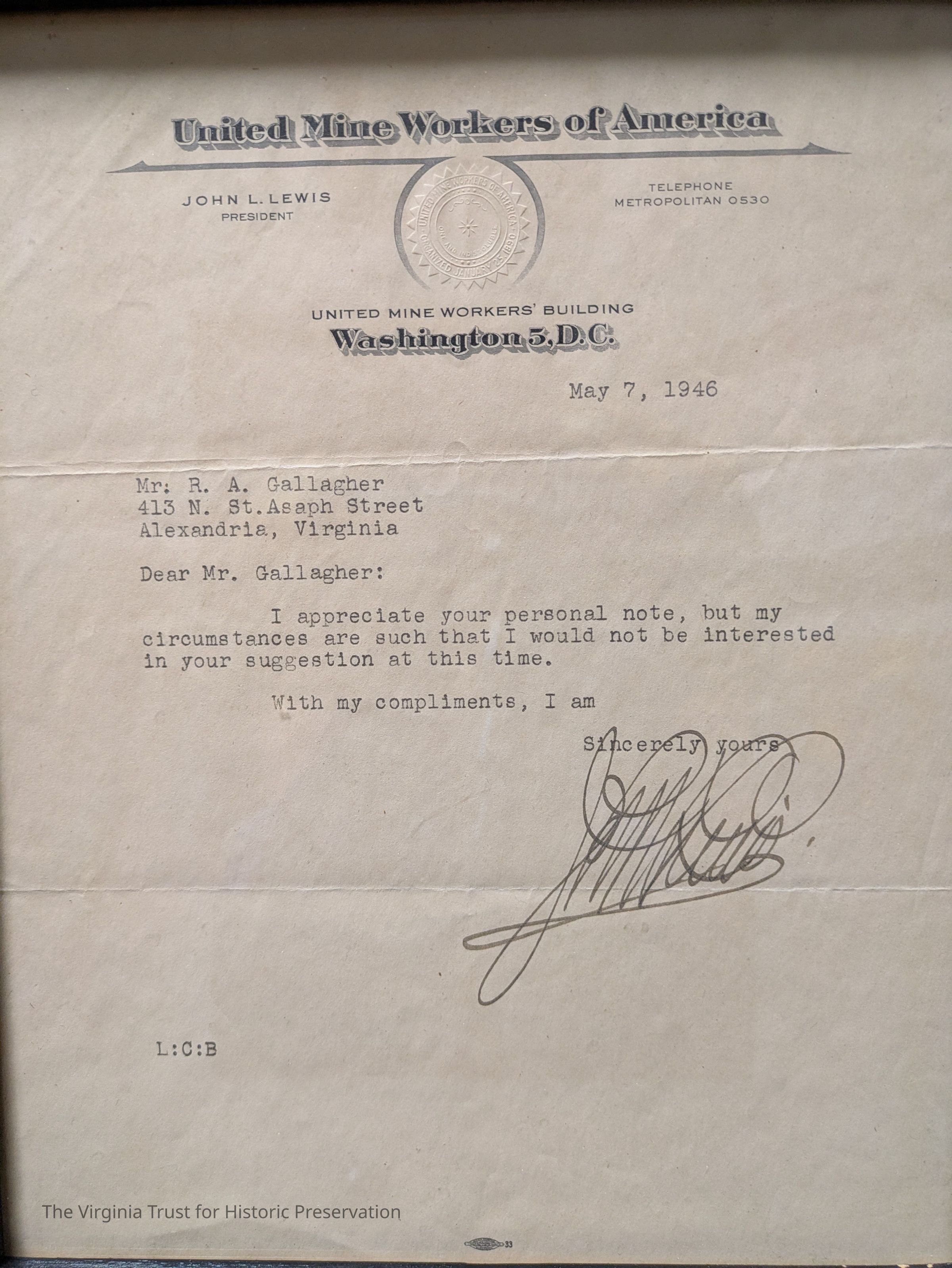 Letter signed by John L. Lewis on United Mine Worker's stationery. Dated 7 May 1946.