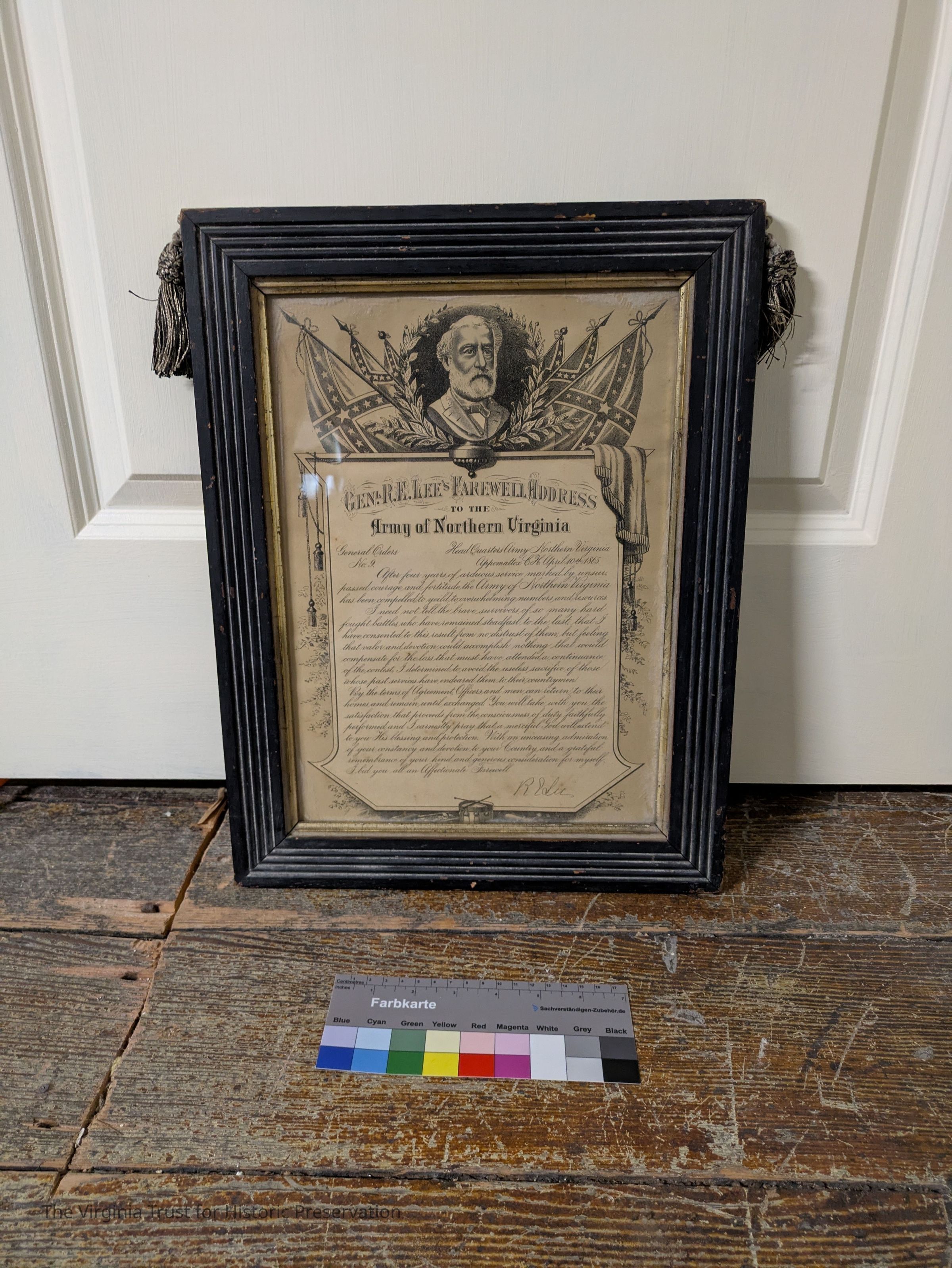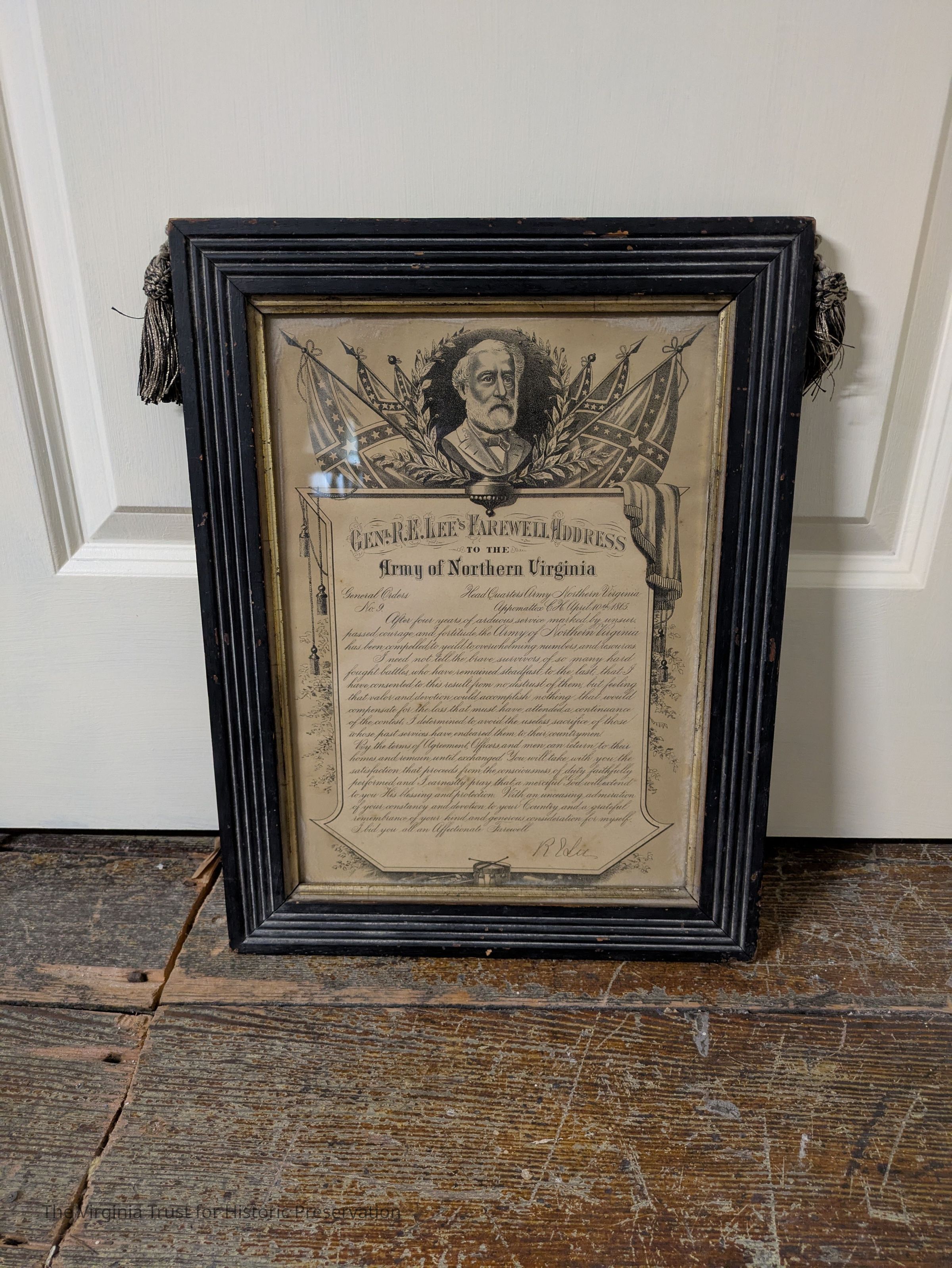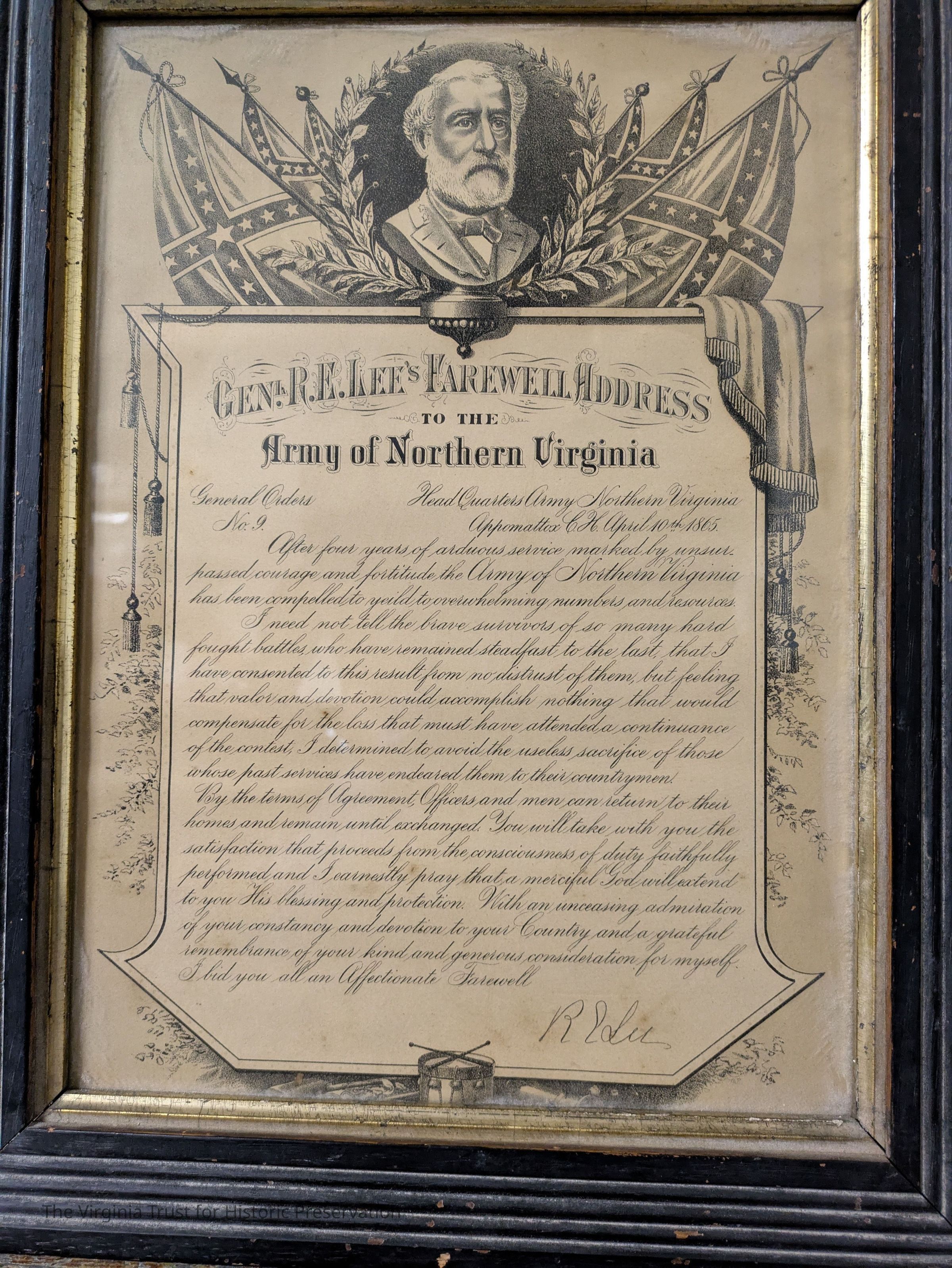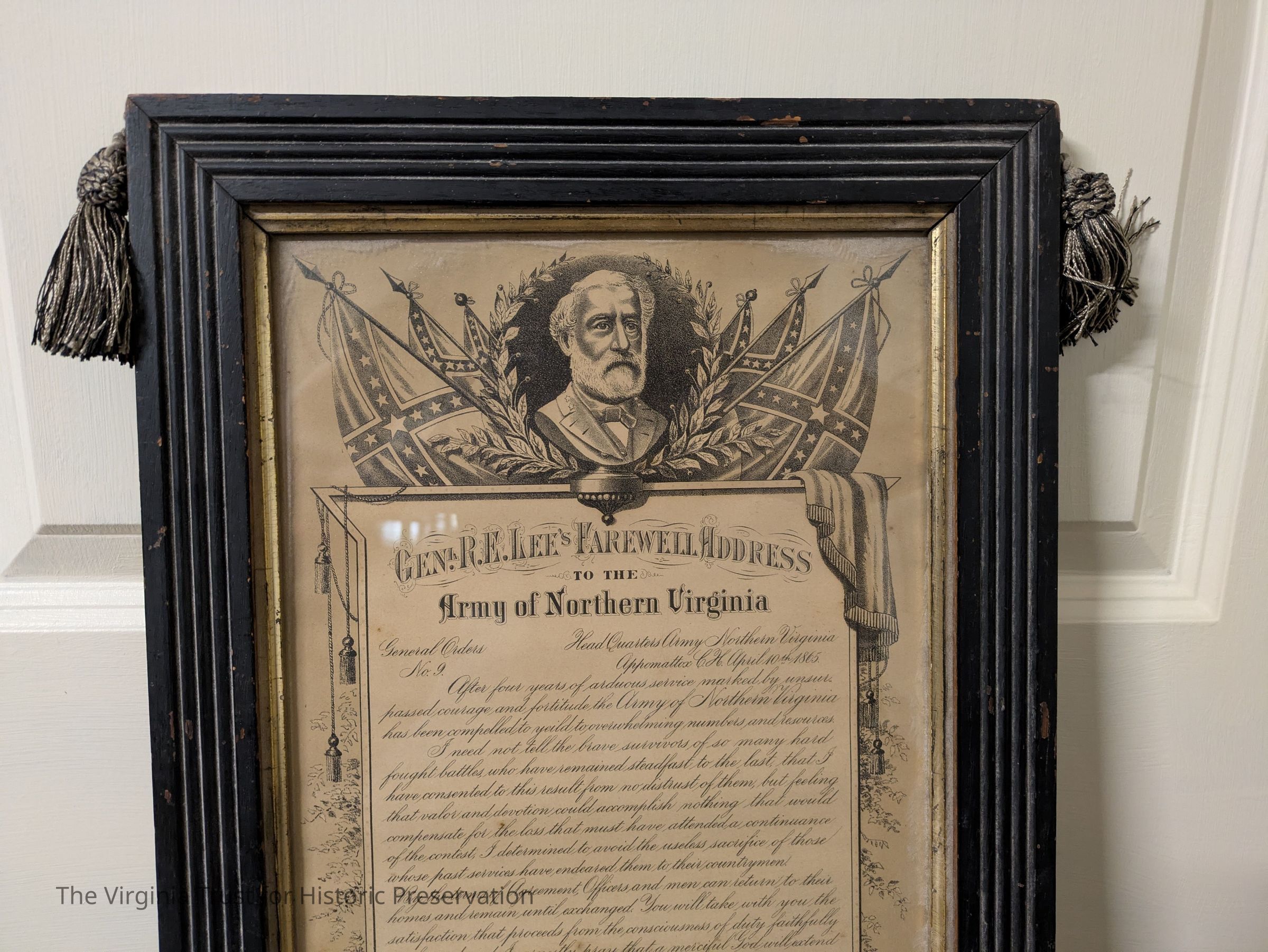 Lee's Farewell Address (General Order No. 9) in frame with hanging decorative tassels at the top.