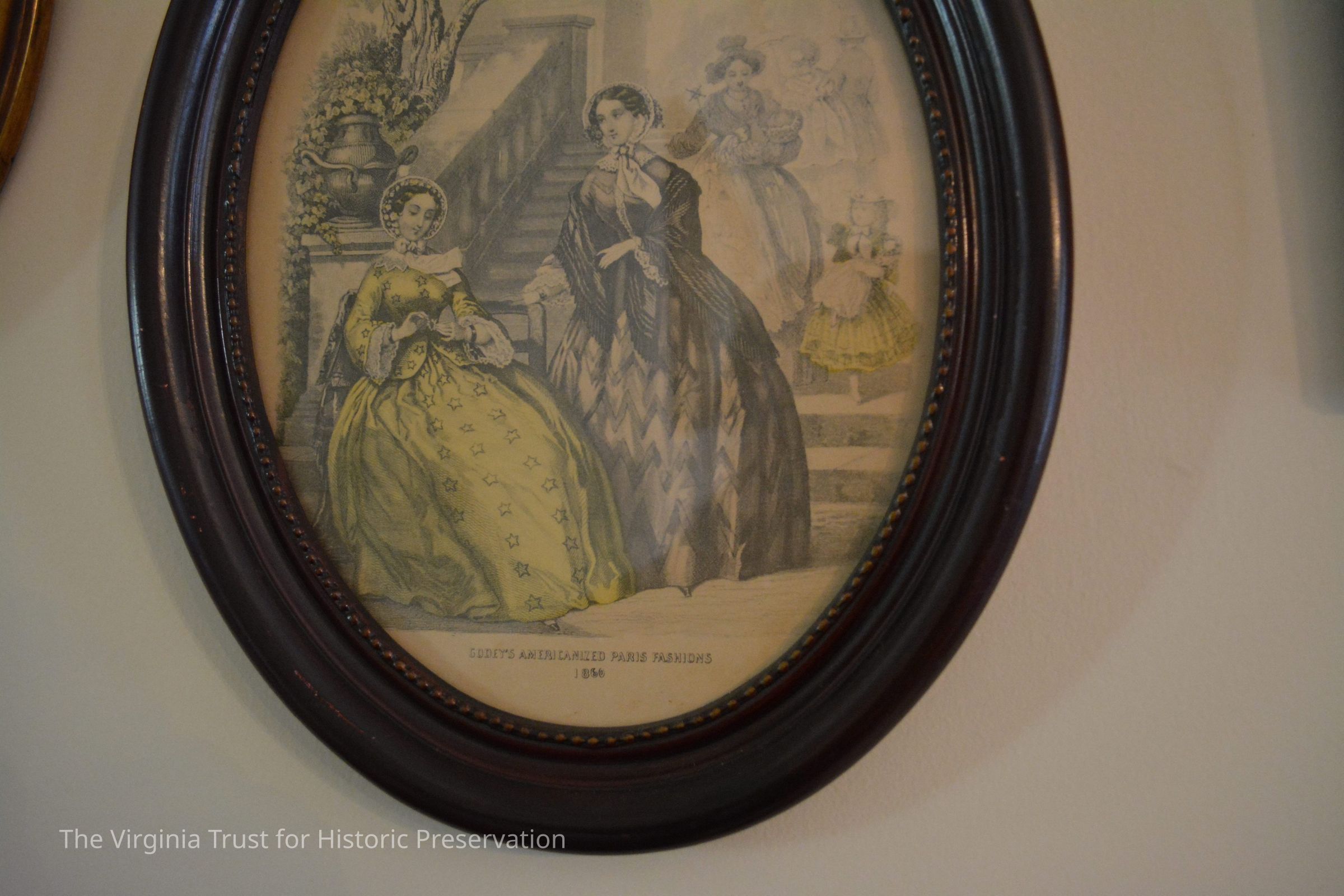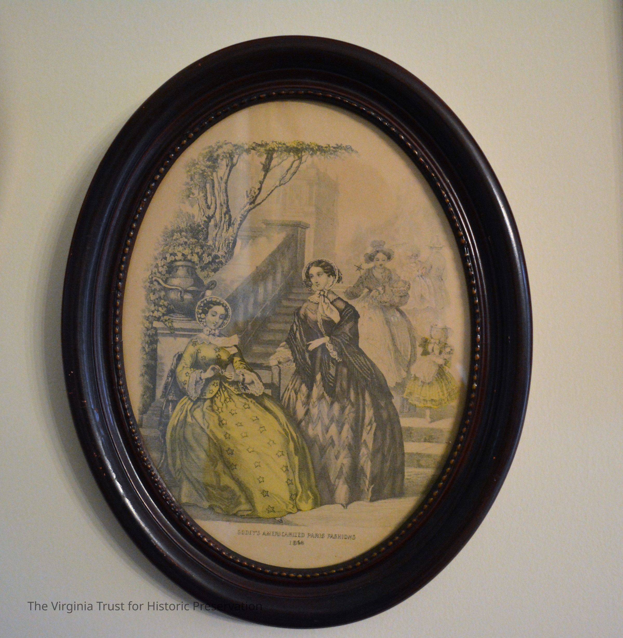 Oval shaped wooden frame holds print reading "Godey's Amercanized Paris Fashions." Depicts 2 fashionable women in foreground; two women, one man, one child in background. Some color. 1860 print.Dimensions