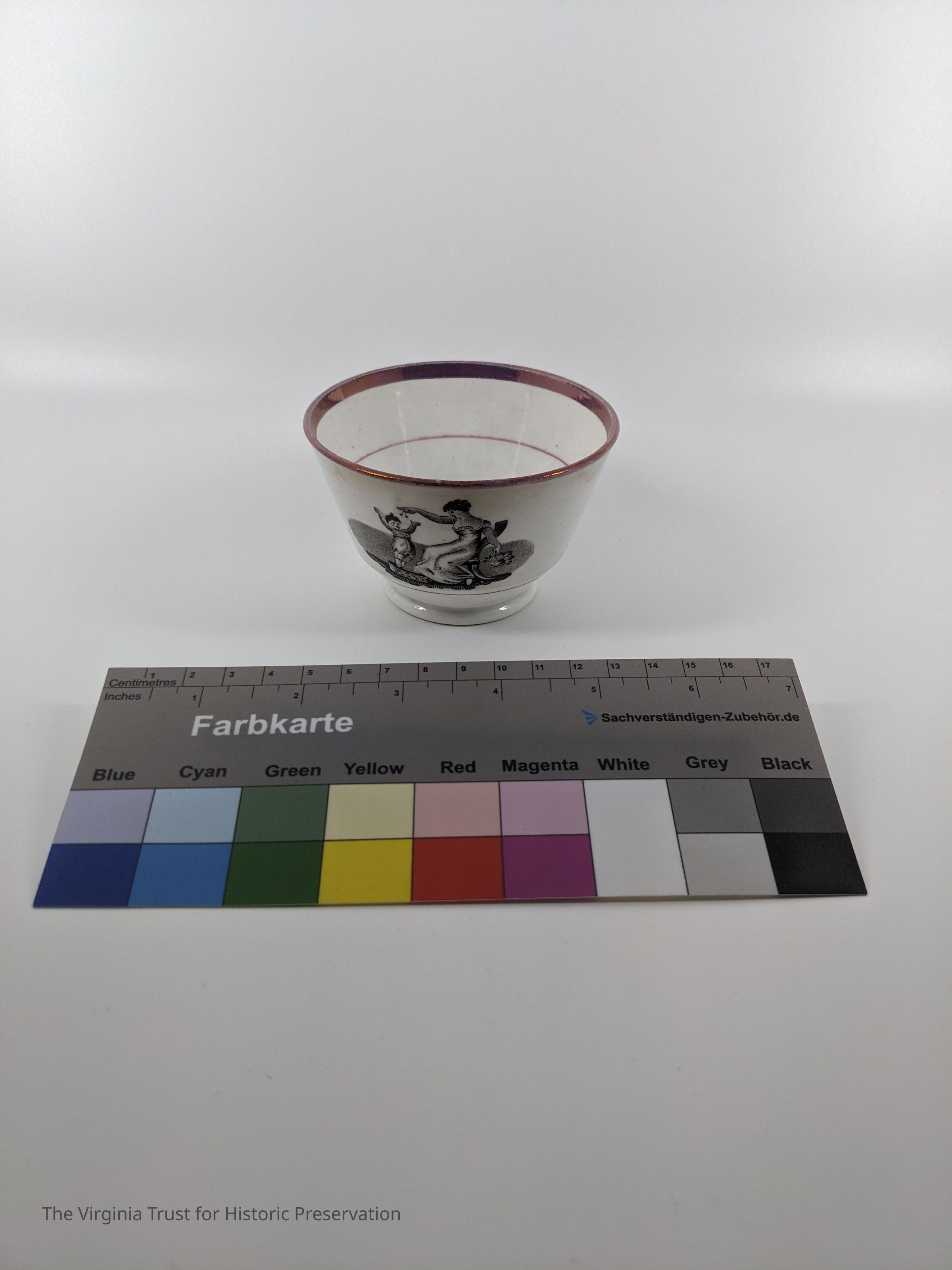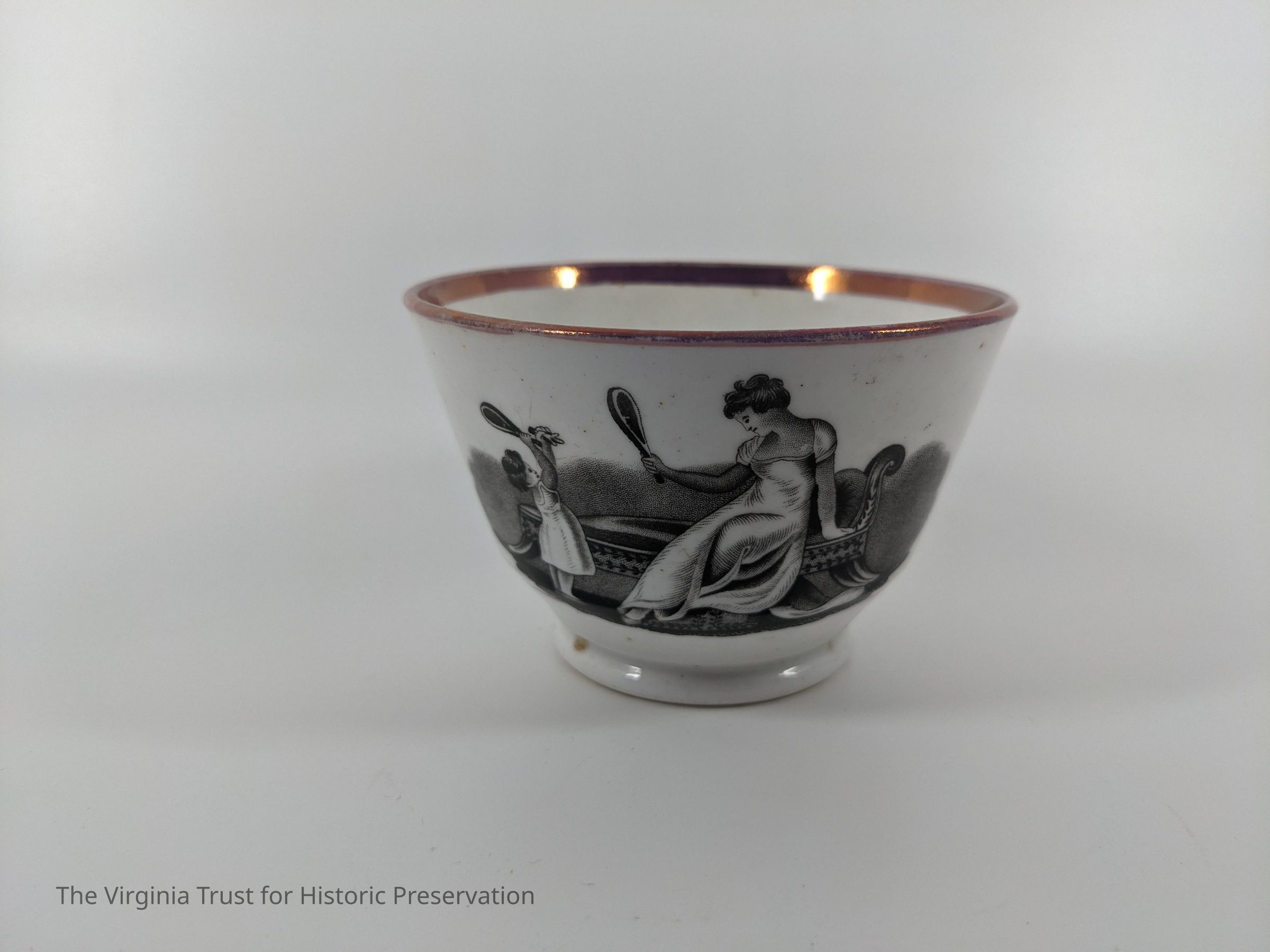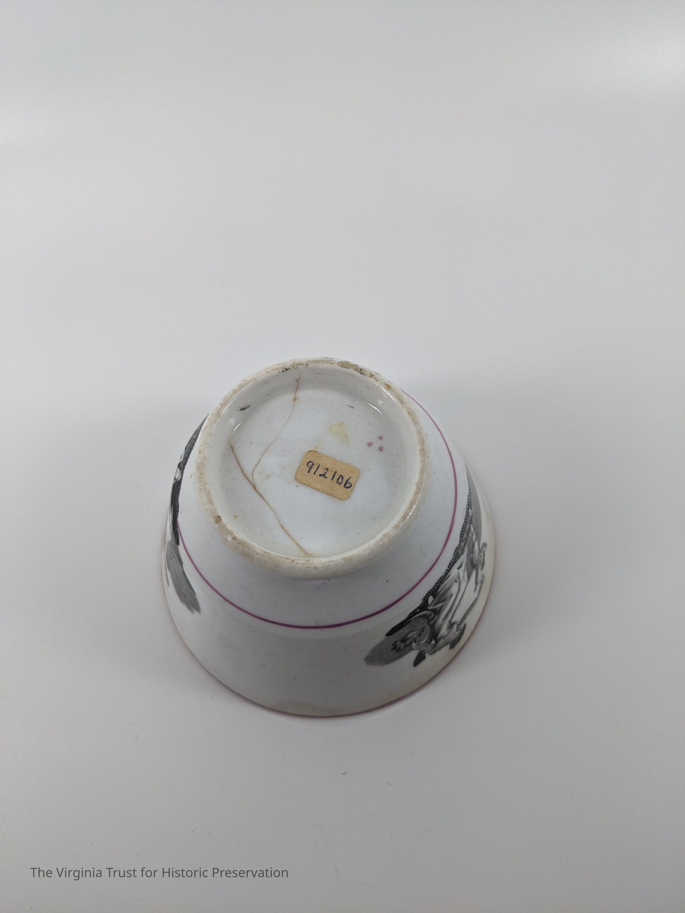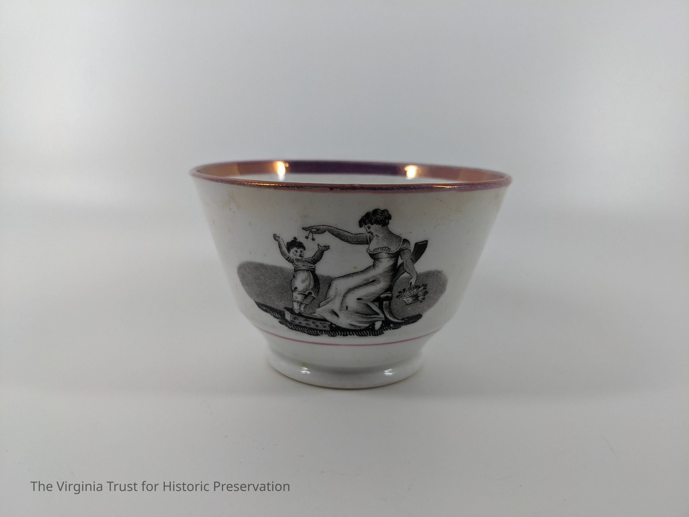 Small cup without handles. White with black transferware images of woman with child. Purple rim. Sticker on bottom: 912106.