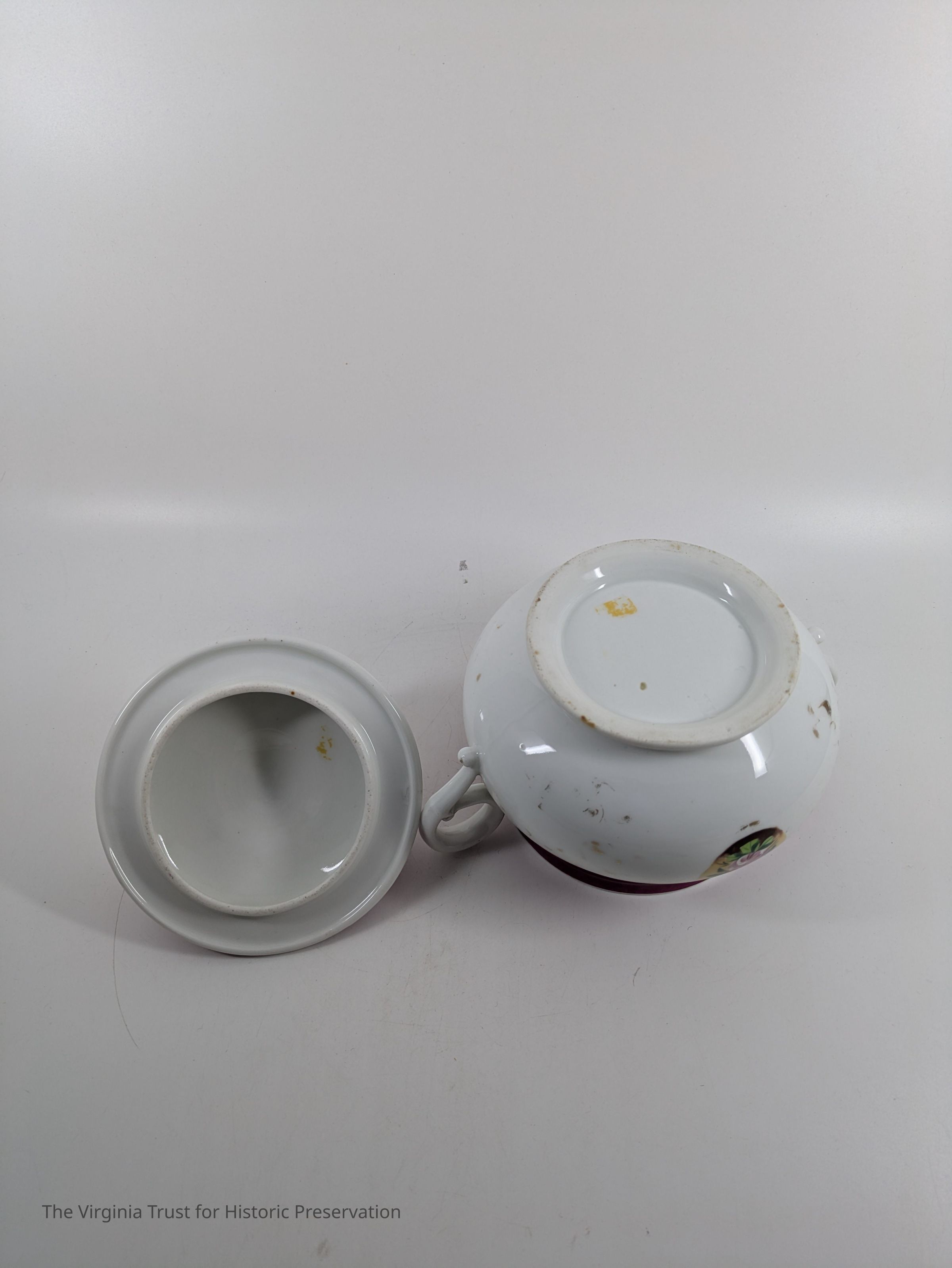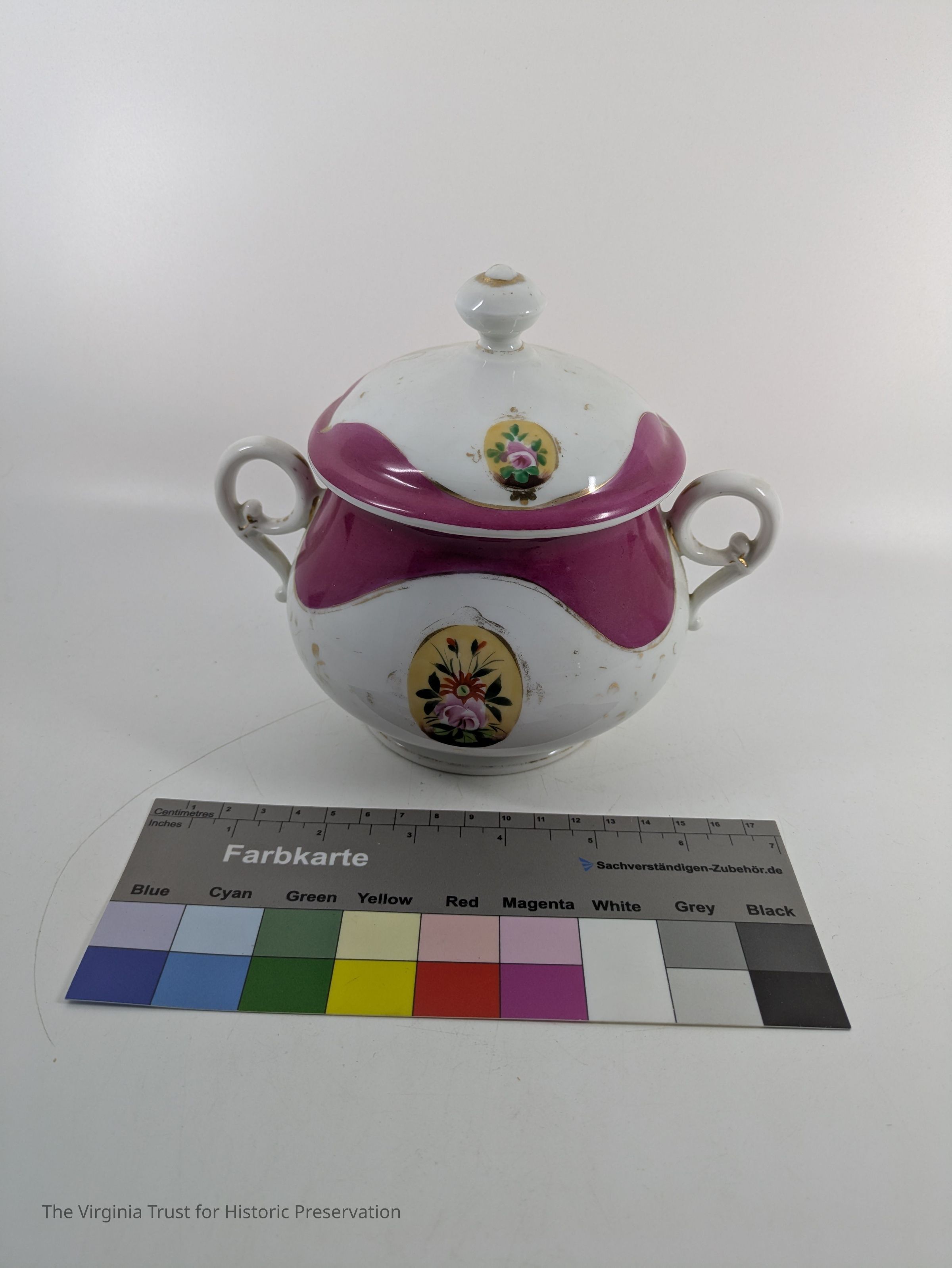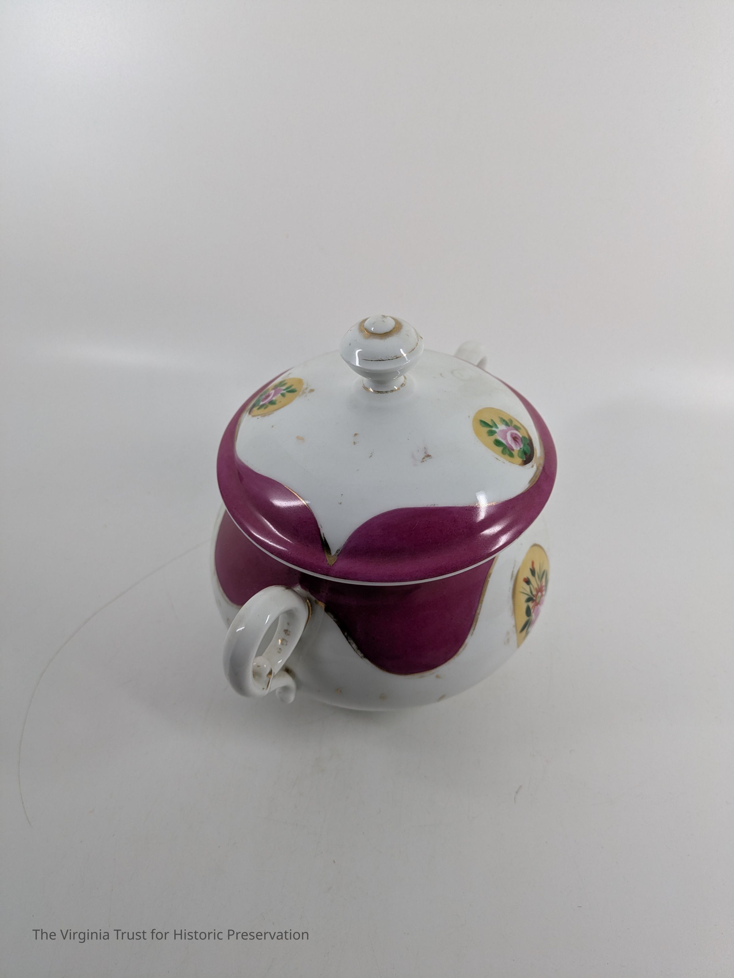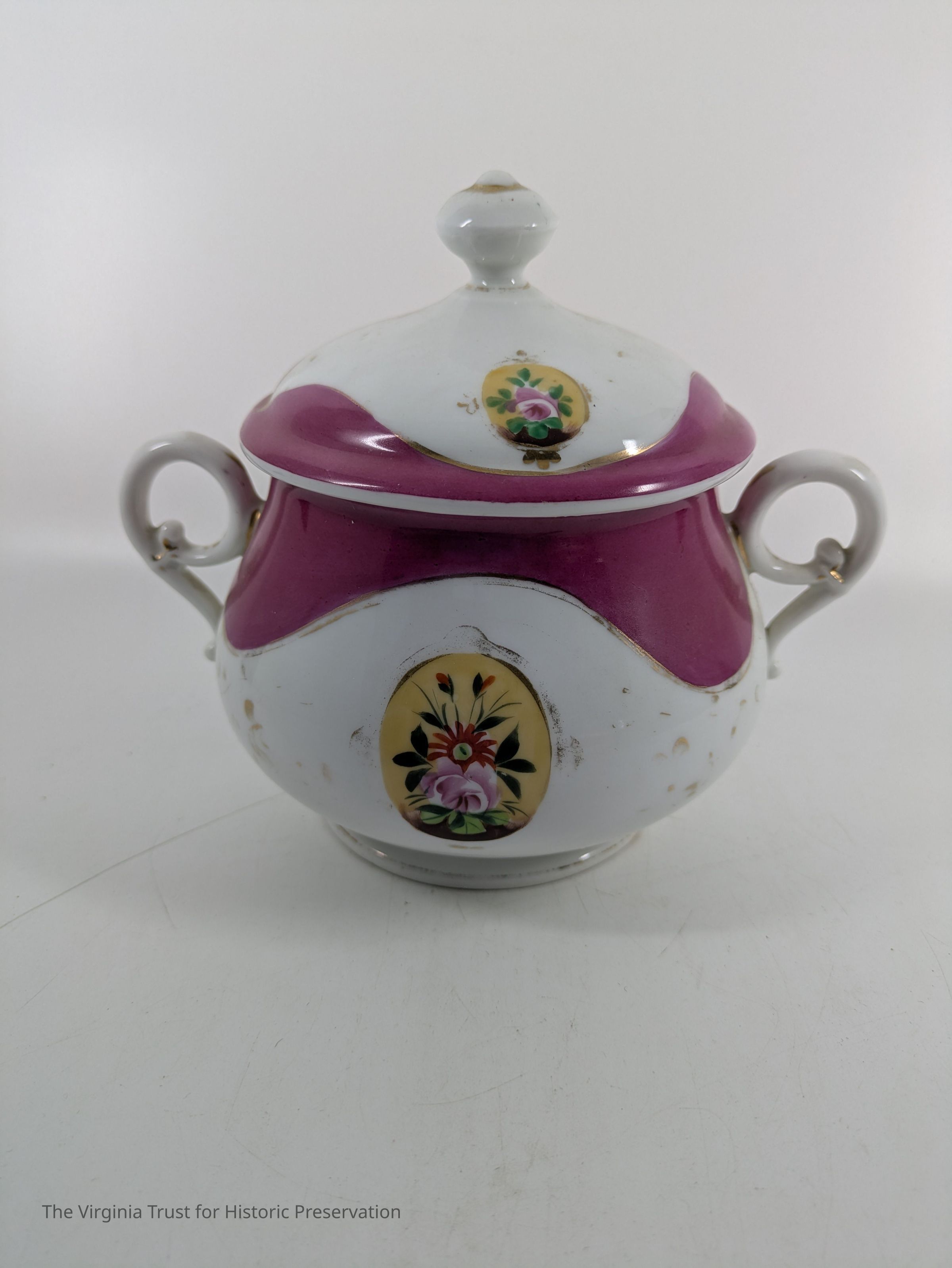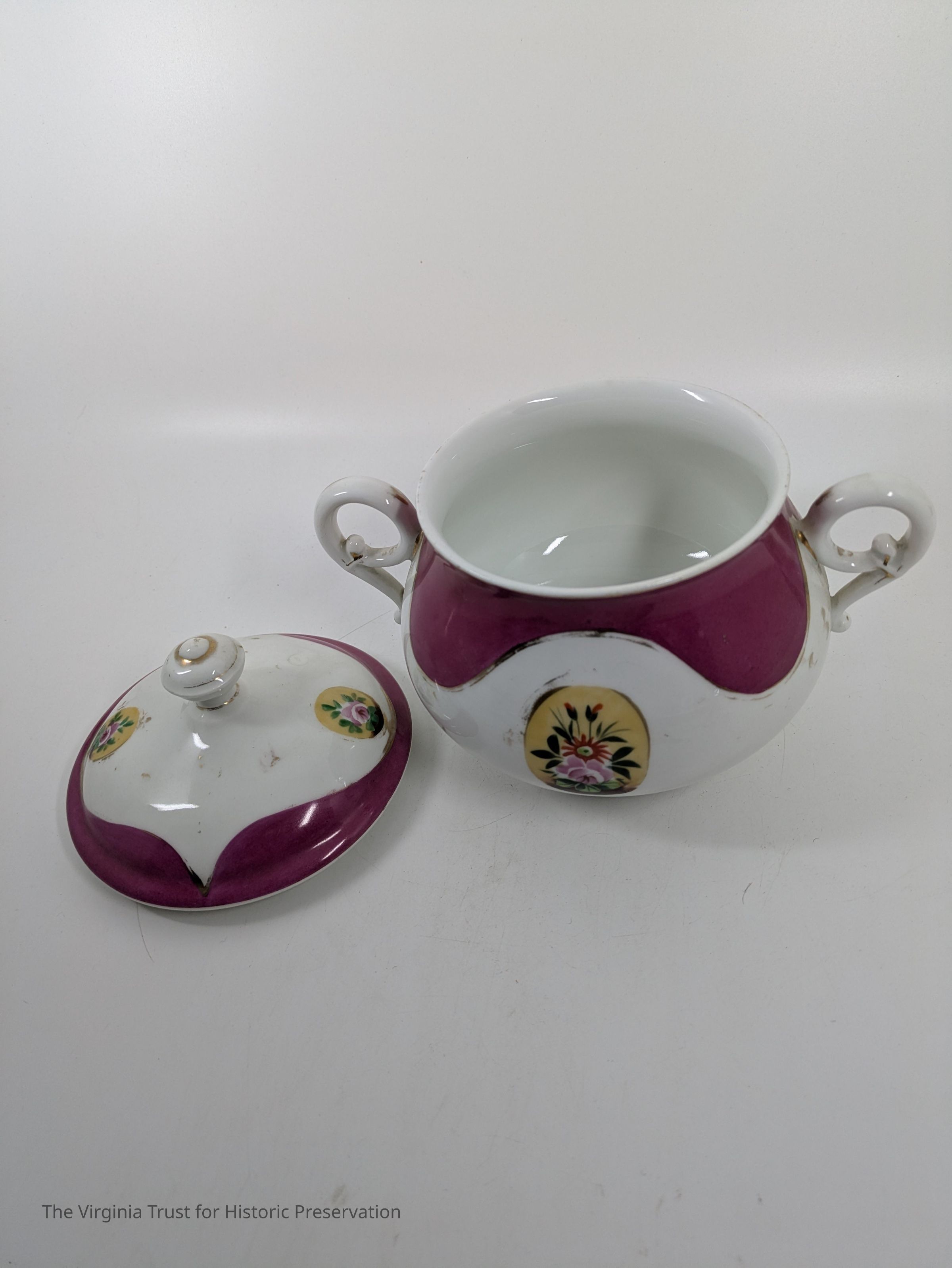 Plum and white sugar bowl with pink and red flower detail. Lid has pink floral detail.