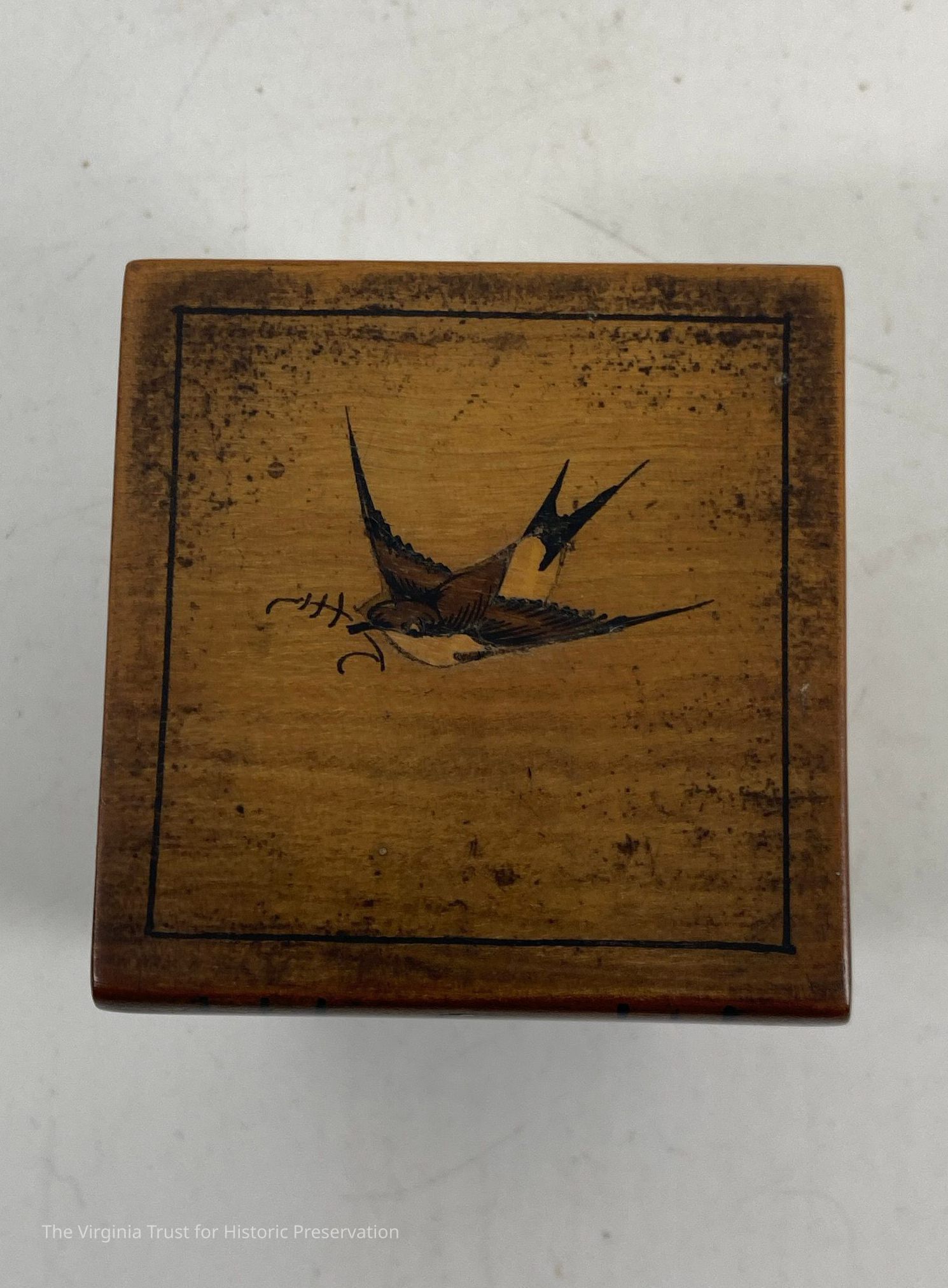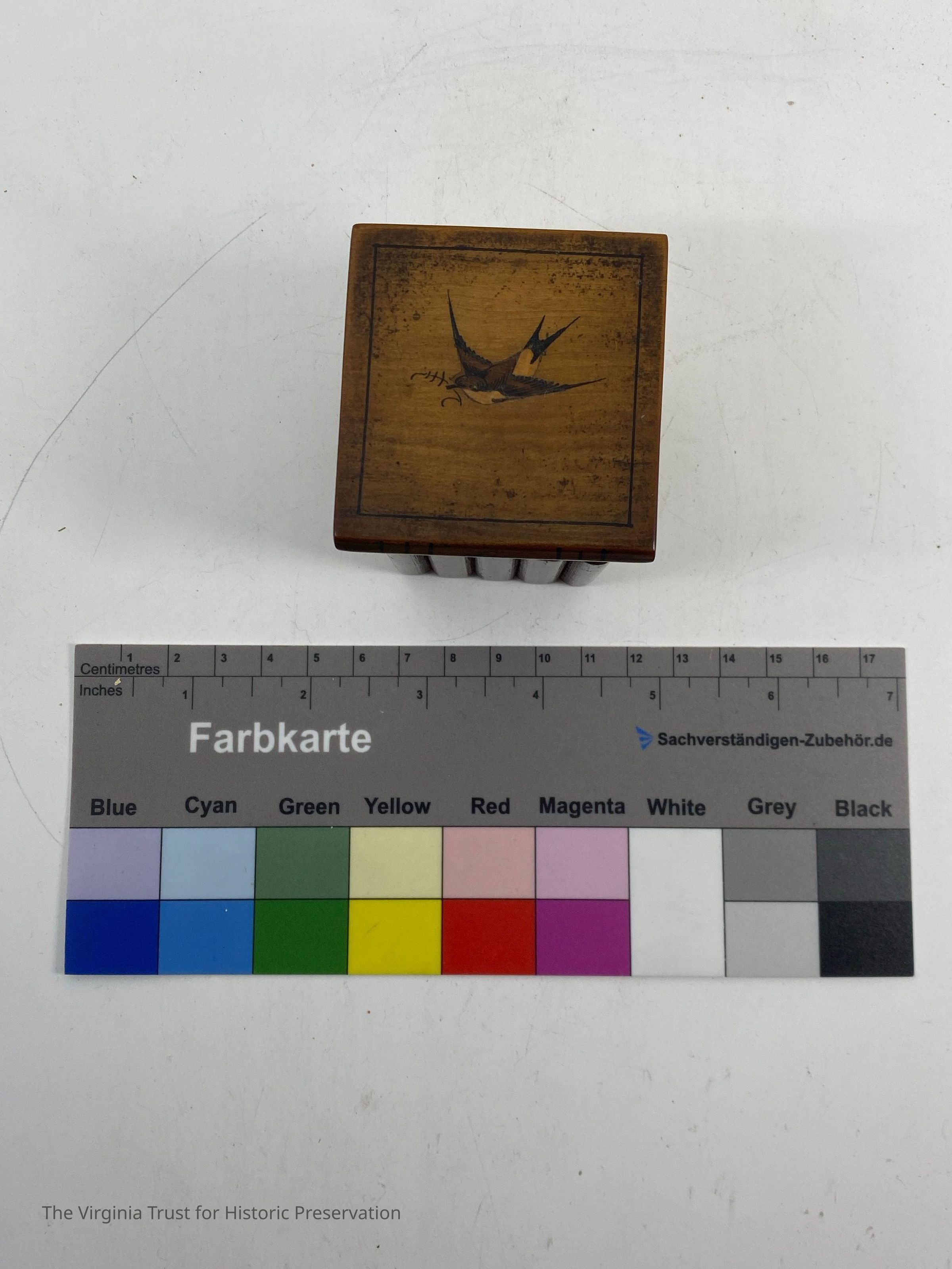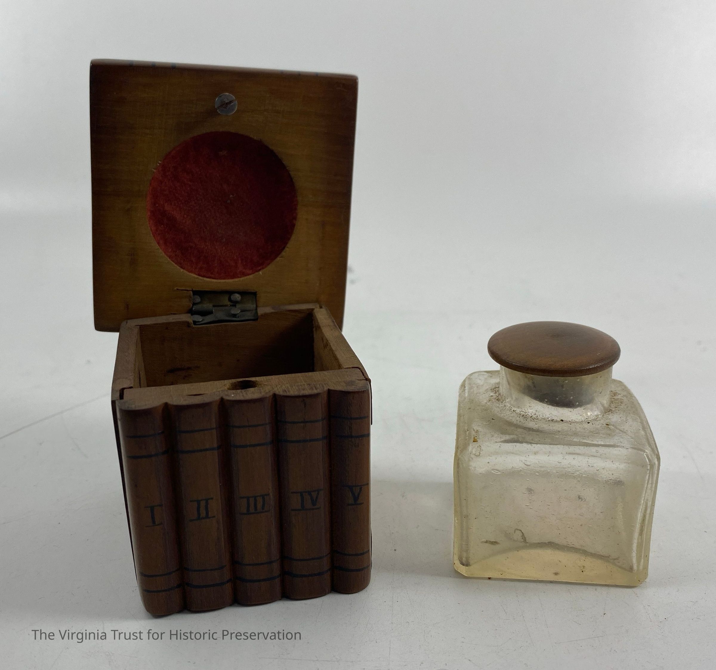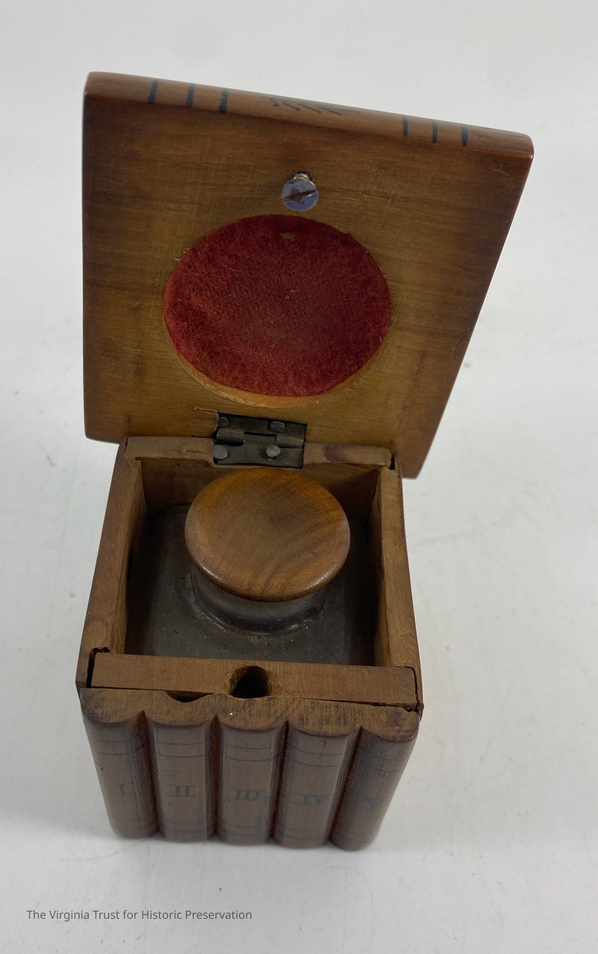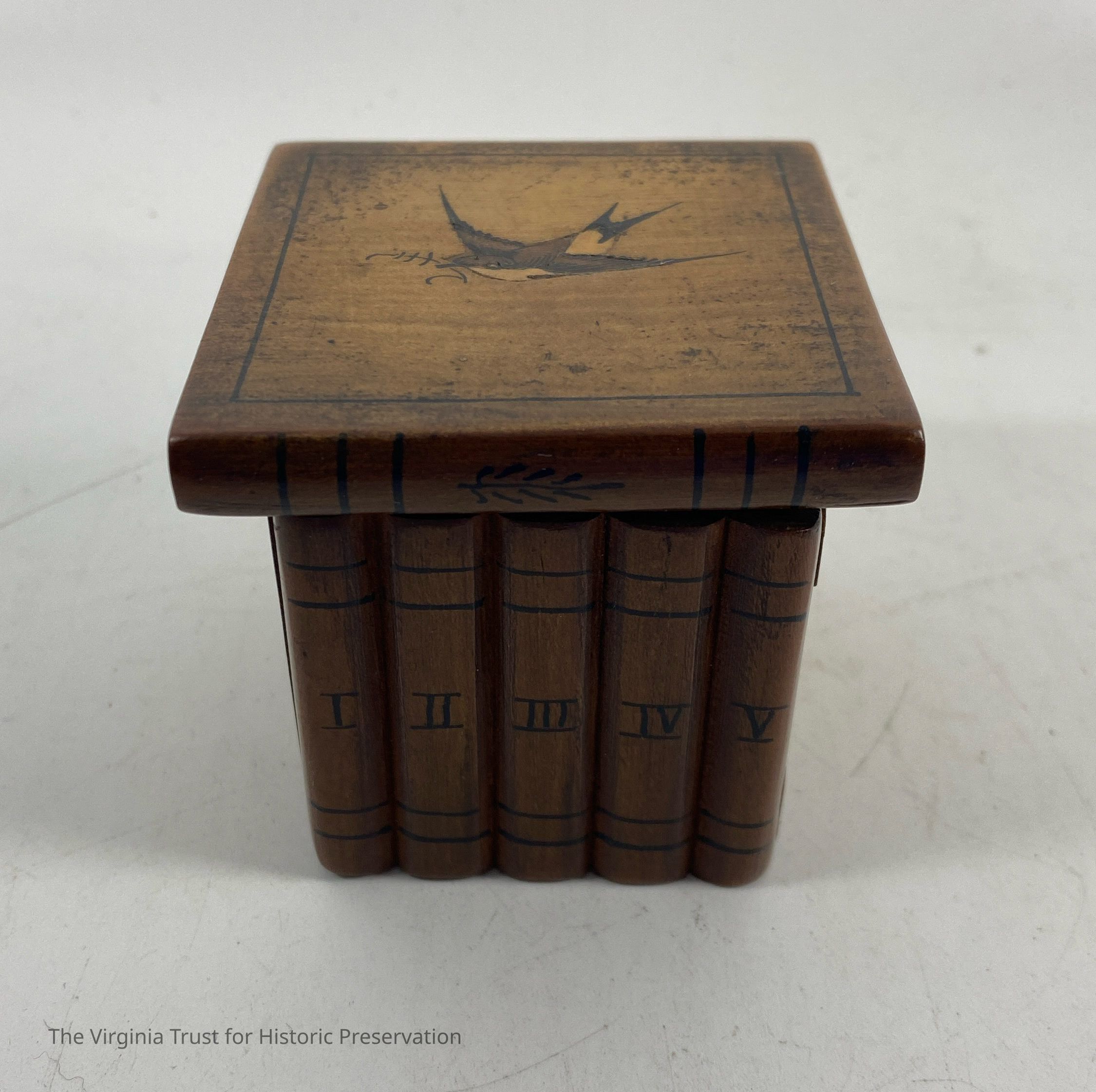 Small hinged box with bird inlay. Contains glass inkwell. Box made to look like volumes I-V of books.