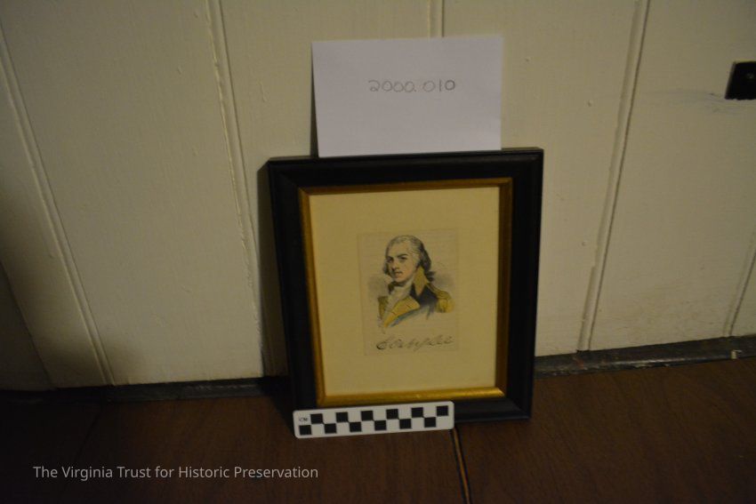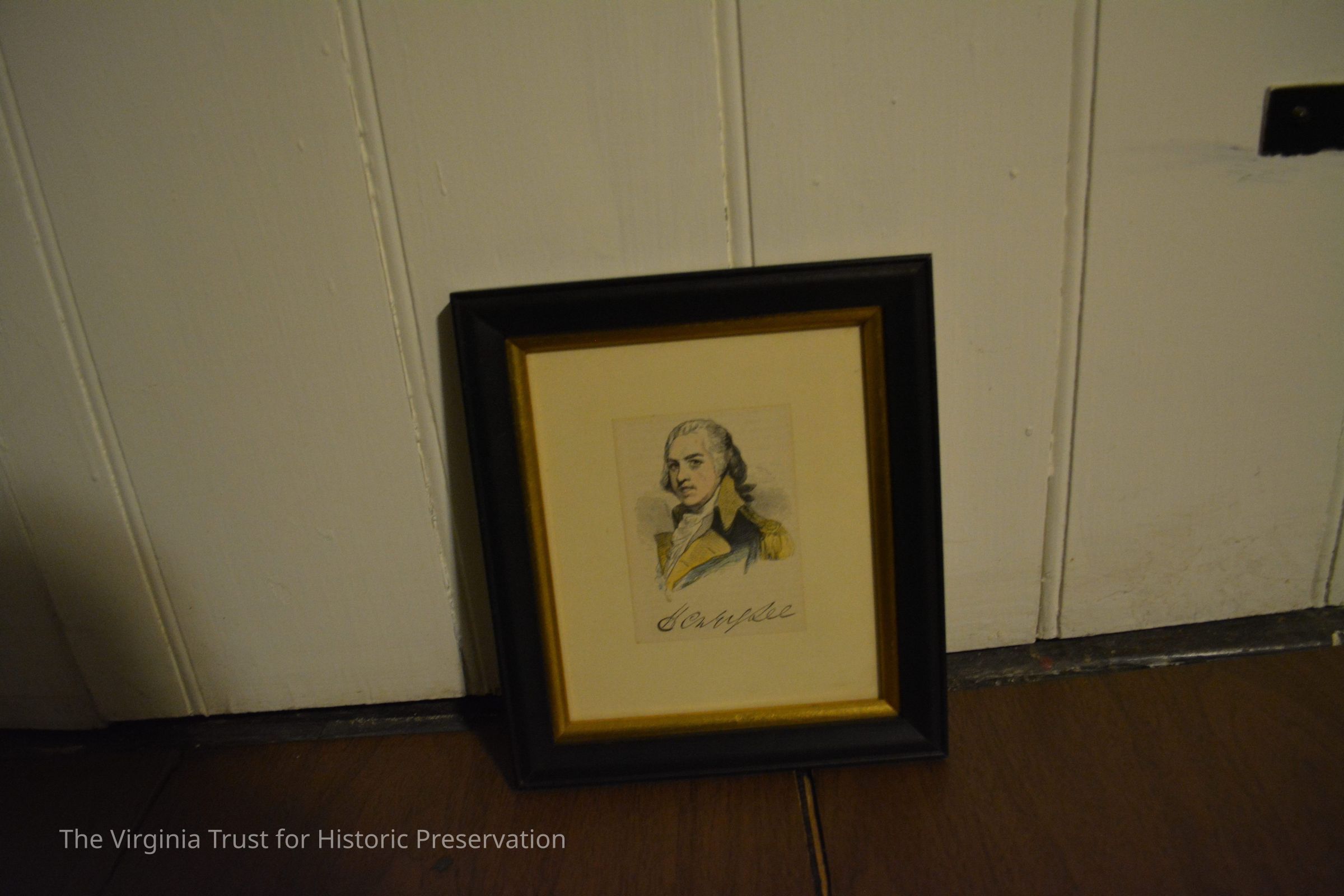 Colored ink drawing depicting Gen. "Light Horse" Harry Lee. White background. Black and gold frame.