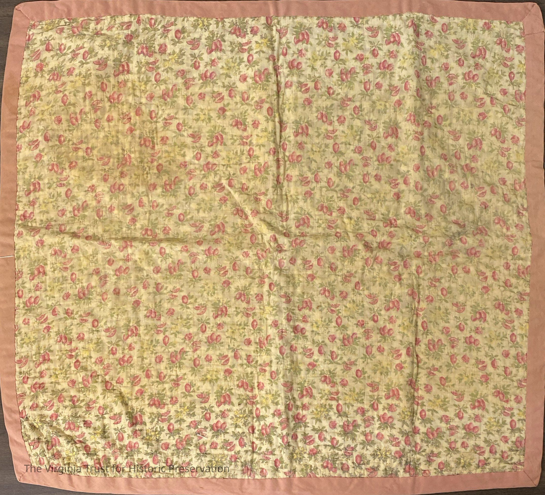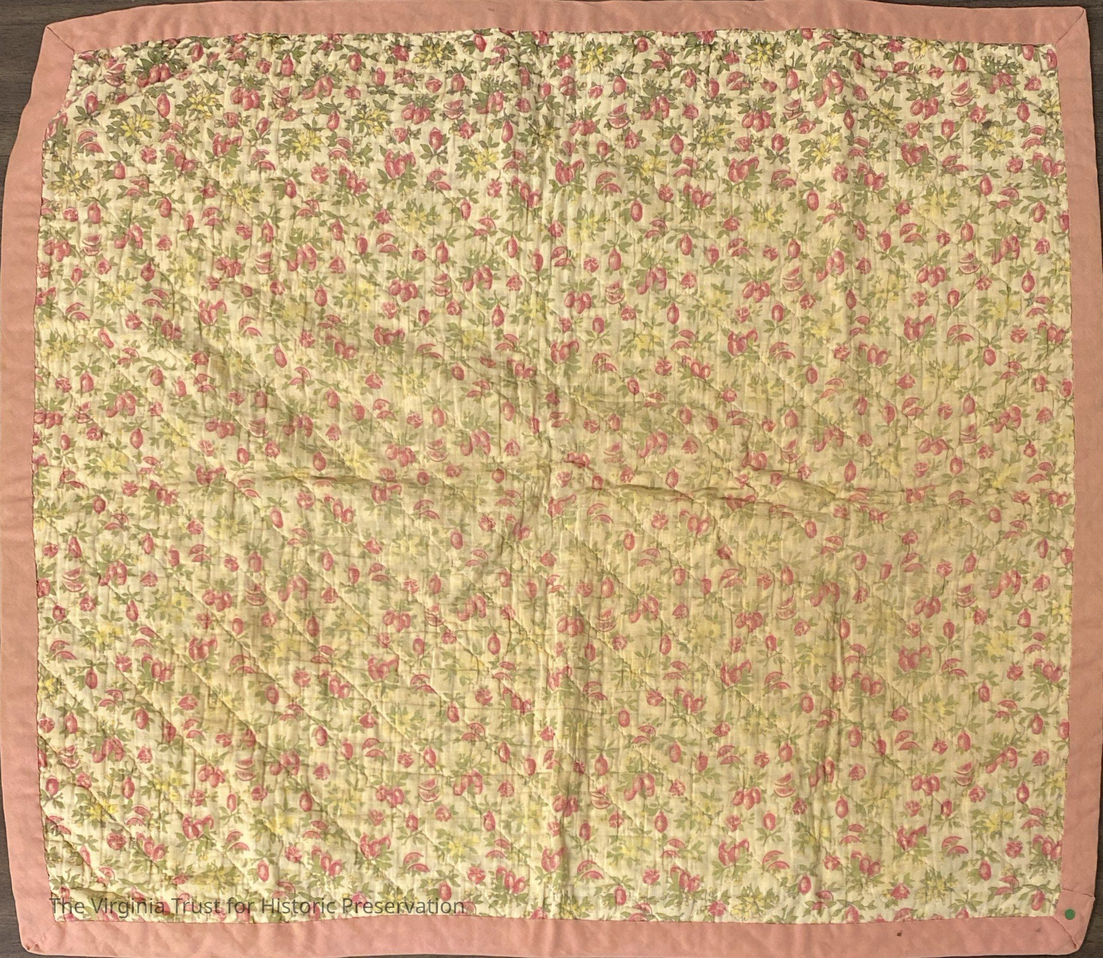 Square quilt with pink border, pink lemon and yellow flower design in center on either side. Center faded, but edges of interior design in good condition. quilt with flowers.