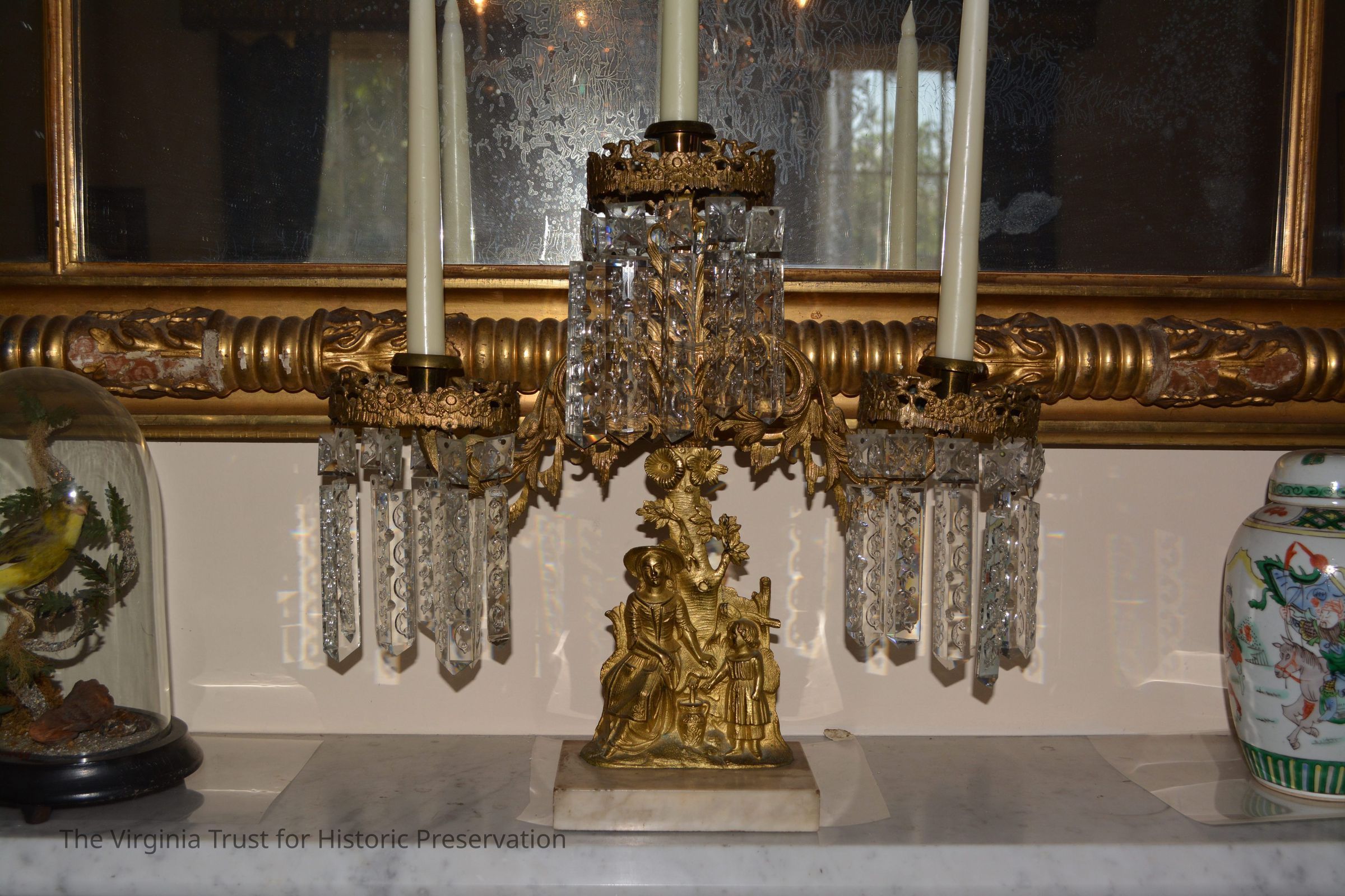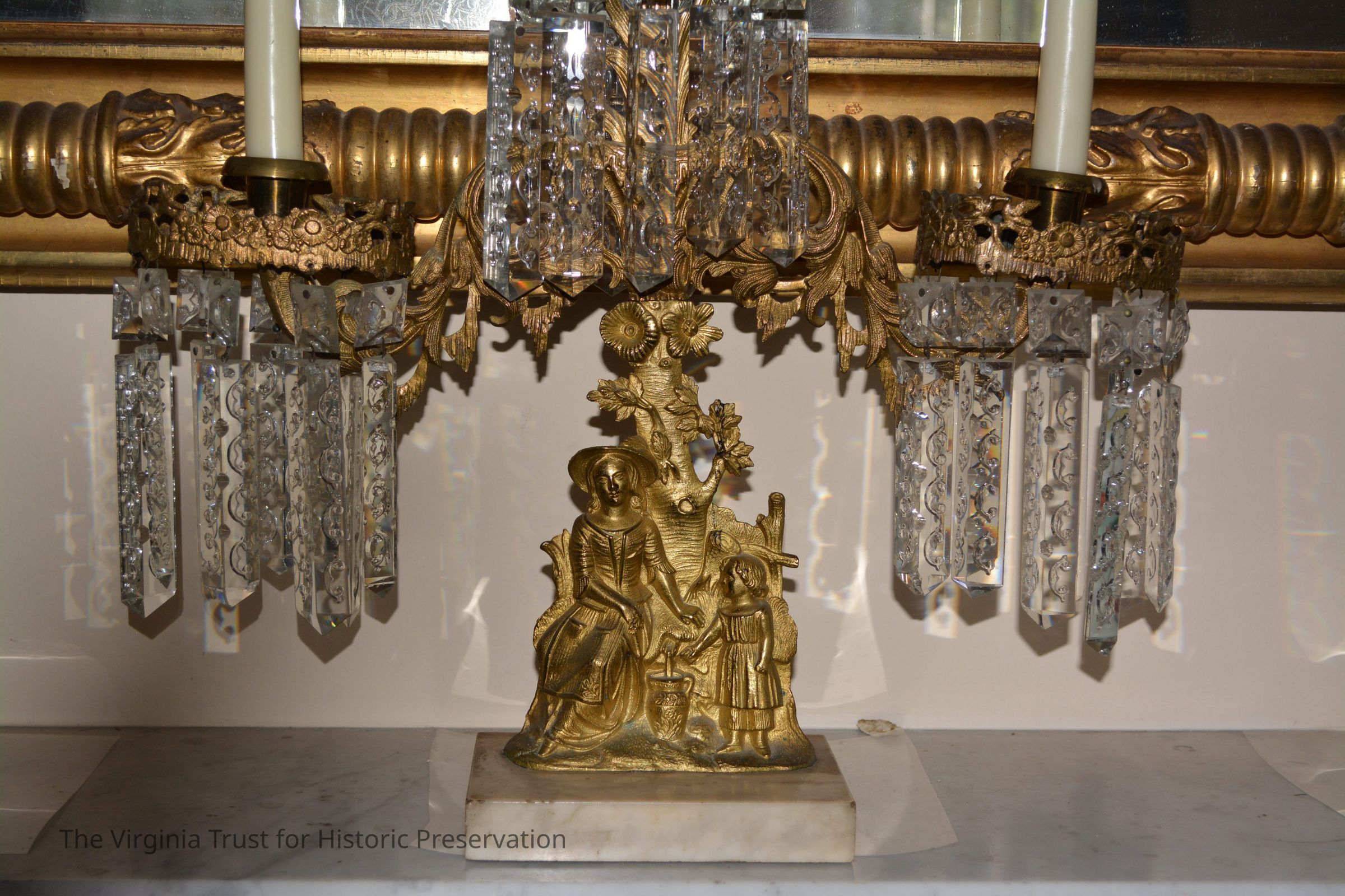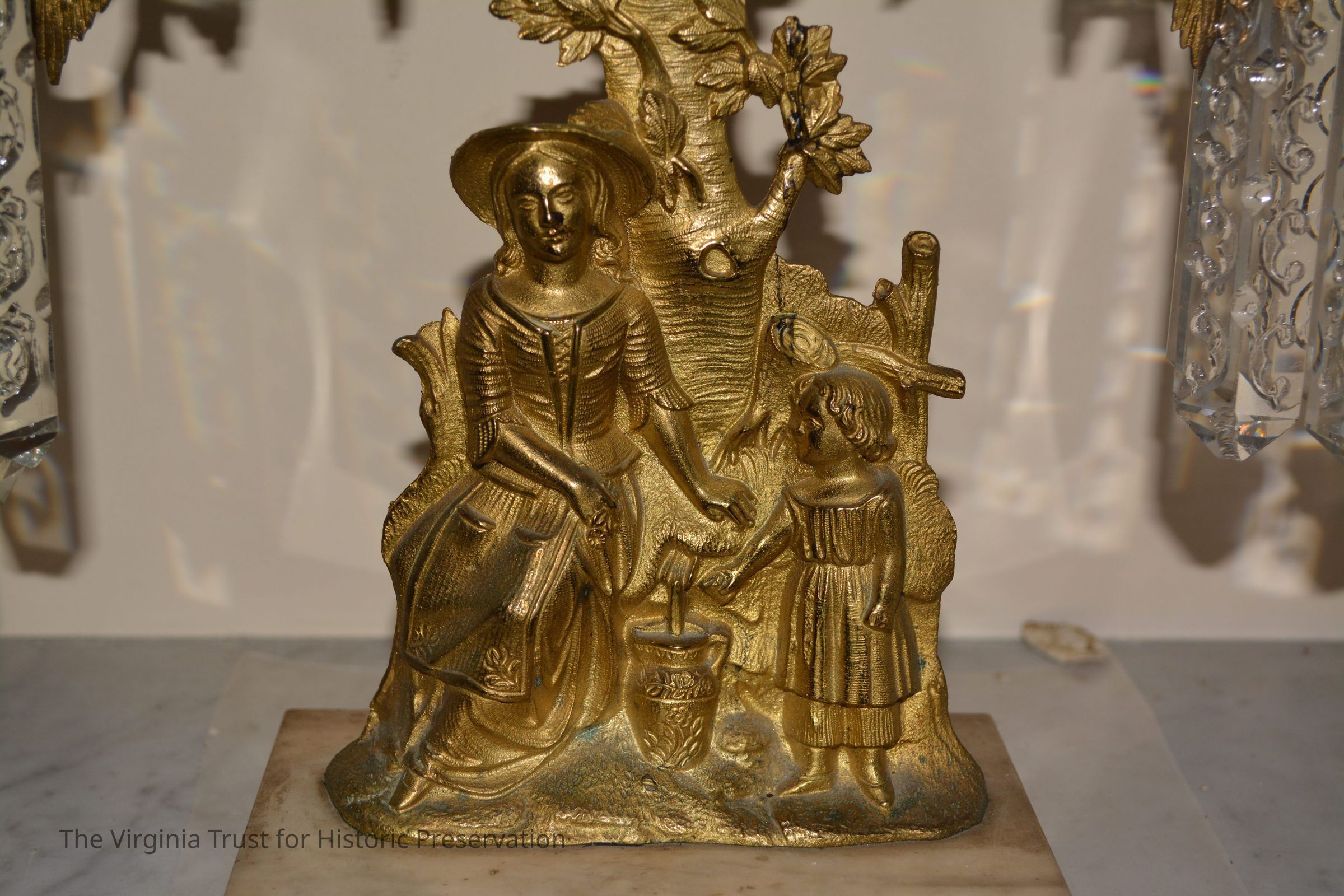Gilt brass and cut crystal 3 separate girandole candelabras. Unmarked. Central three-light candelabra has two leafy scrolling arms issuing from the central support, each terminating in nozzle to hold one candle each. The side candlesticks each have one nozzle. Each element has a brass standard cast in high relief depicting a seated mother with a standing child, drawing water from a well that springs from the base of a flowering tree. 40 triangularly faceted (coffin shape) cut crystal lusters (8 surround each nozzle) are suspended from each nozzle. An oval gallery cast with repeated kissing dove motif surrounds the nozzle.Dimensions
