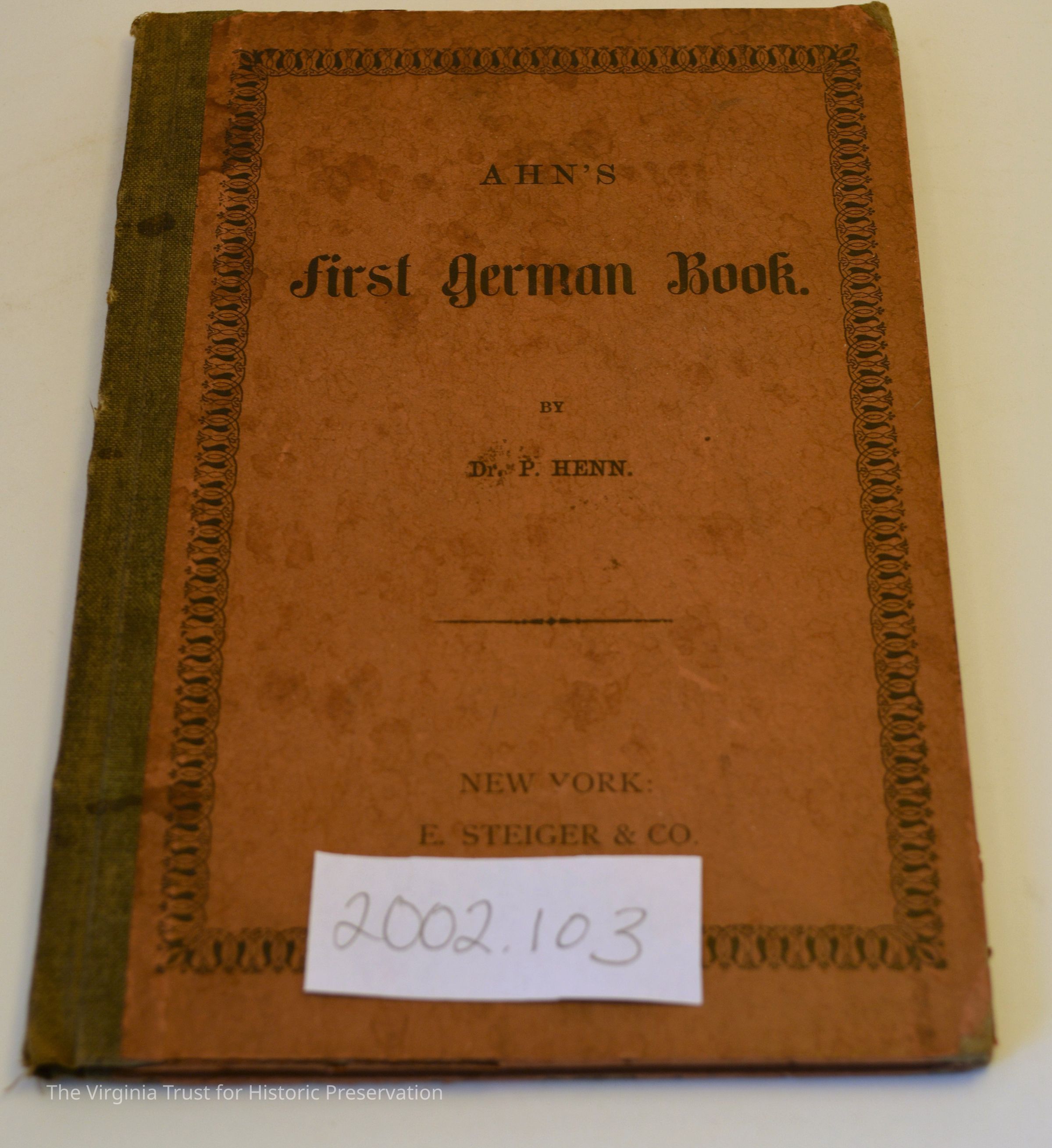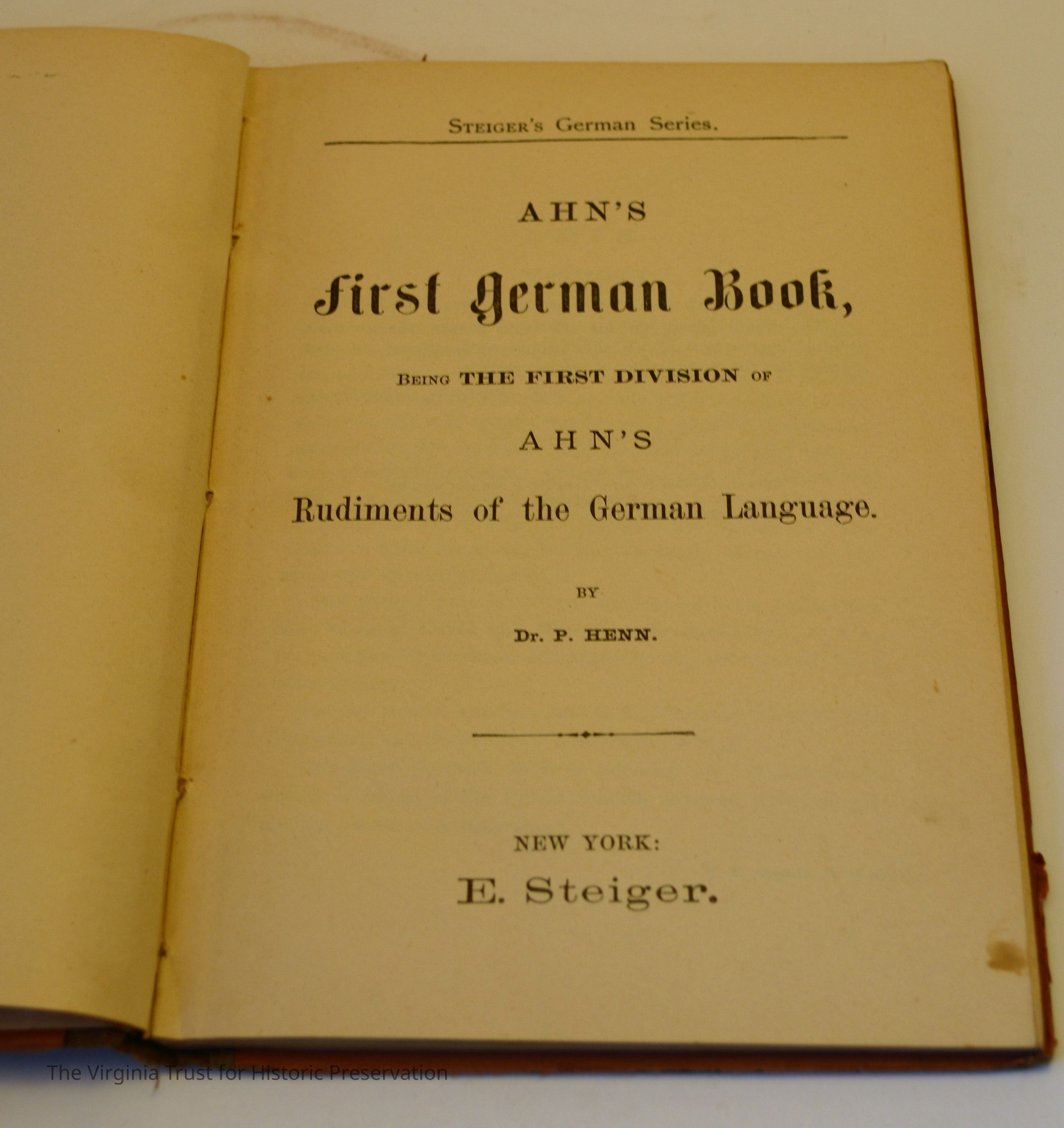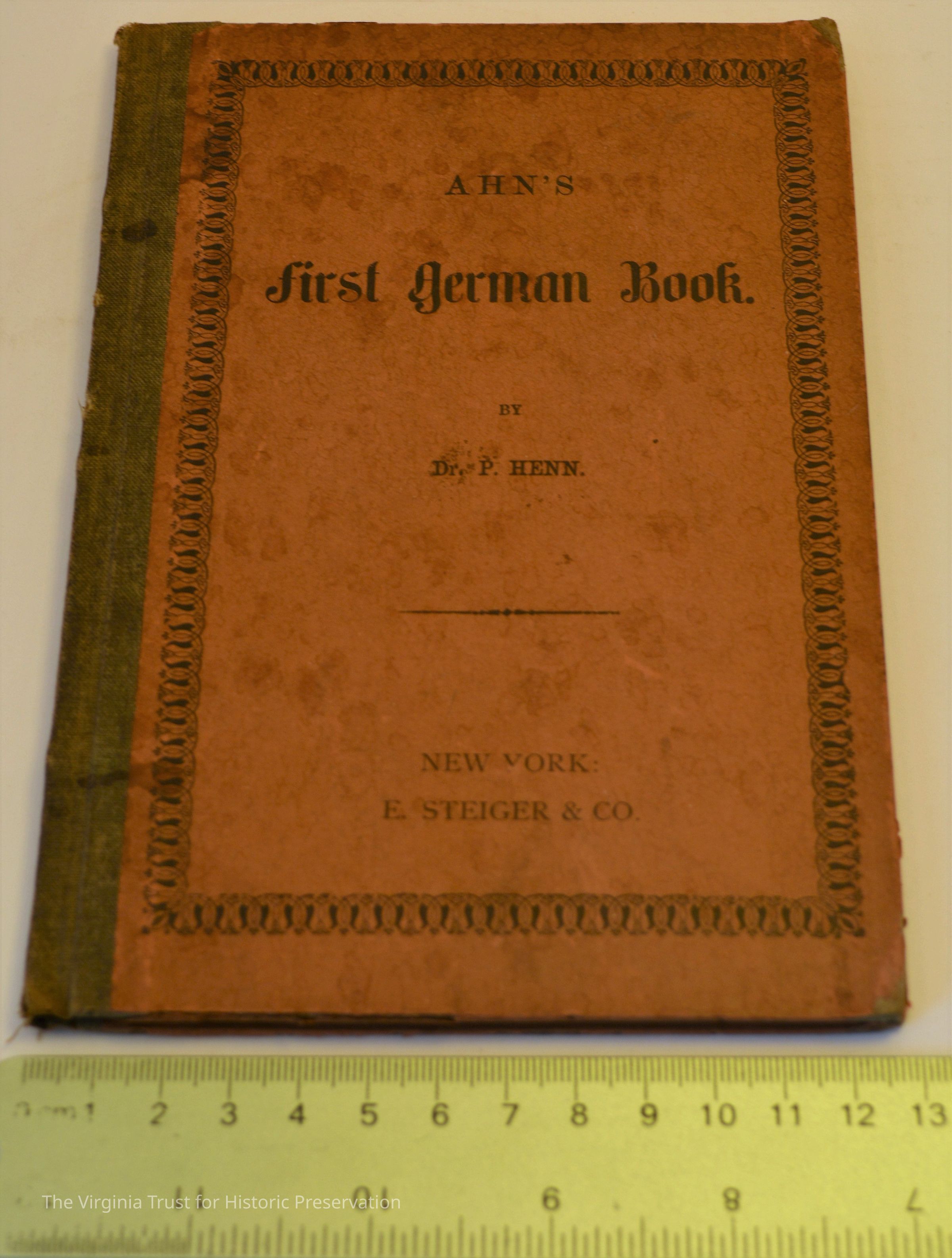 Ahn's First German Book, Being the First Division f Ahn's Rudiments of the German Language. New York: E. Steiger, [no date]. Dr. P. Henn. Paper file is 1986.198.