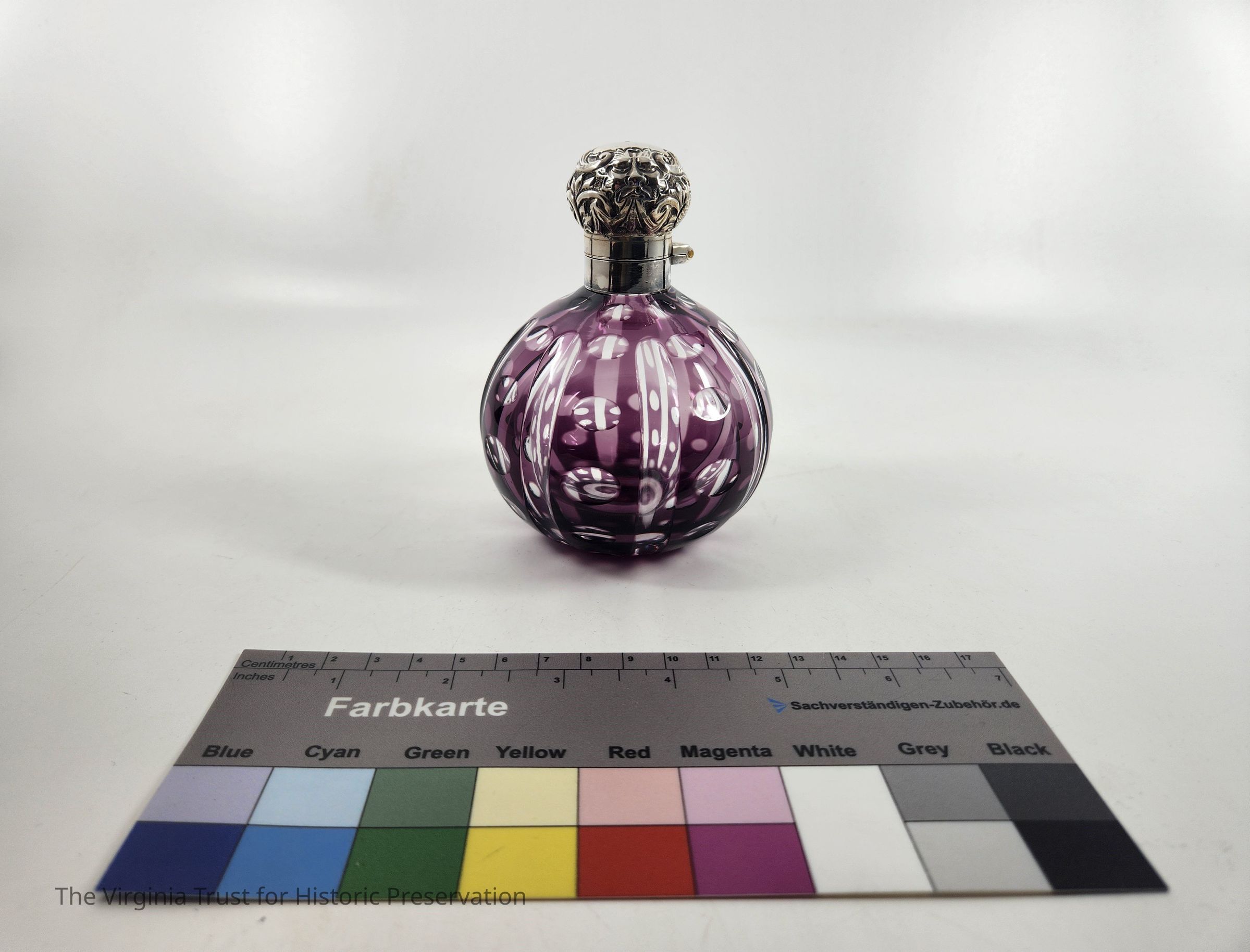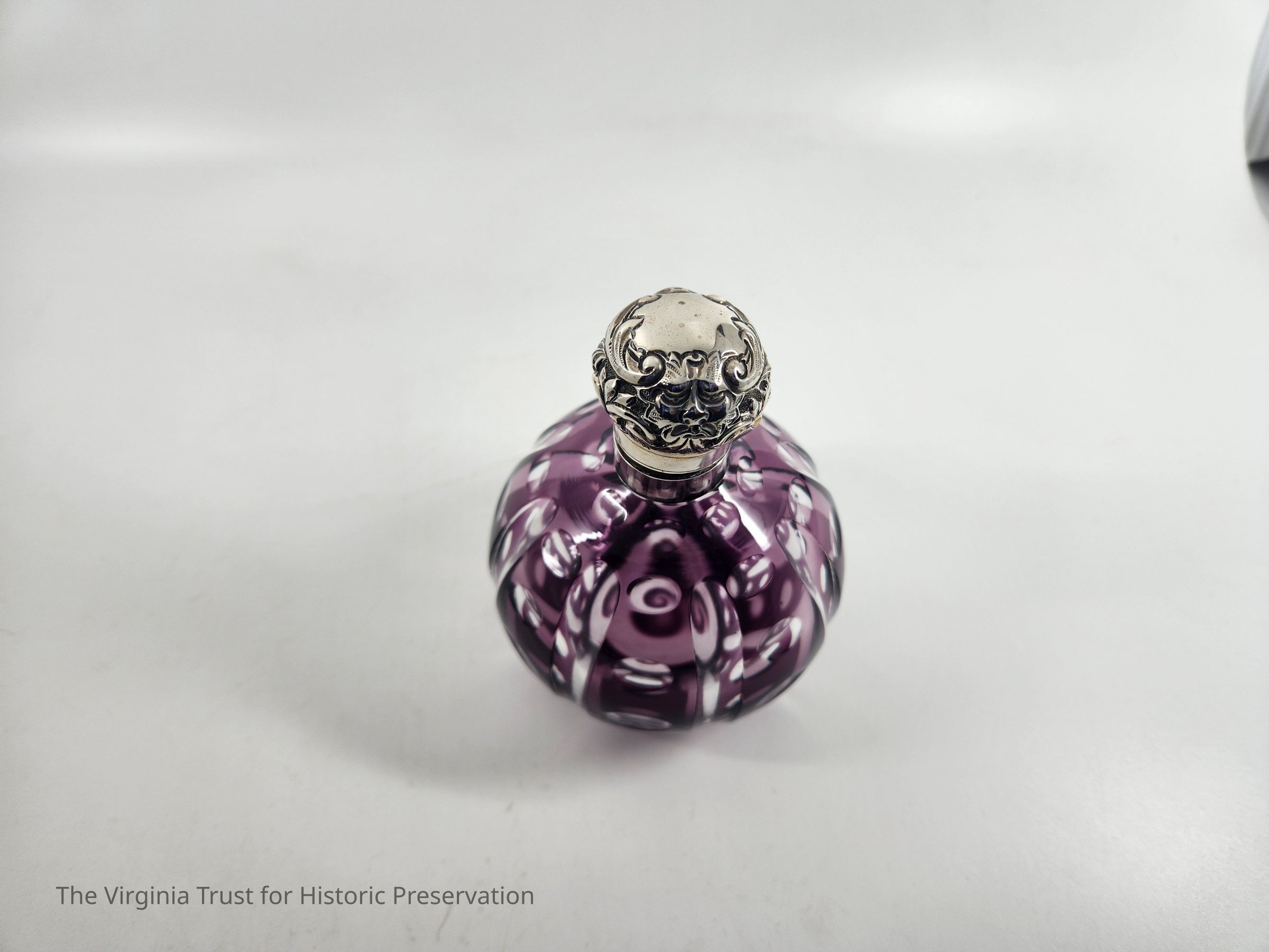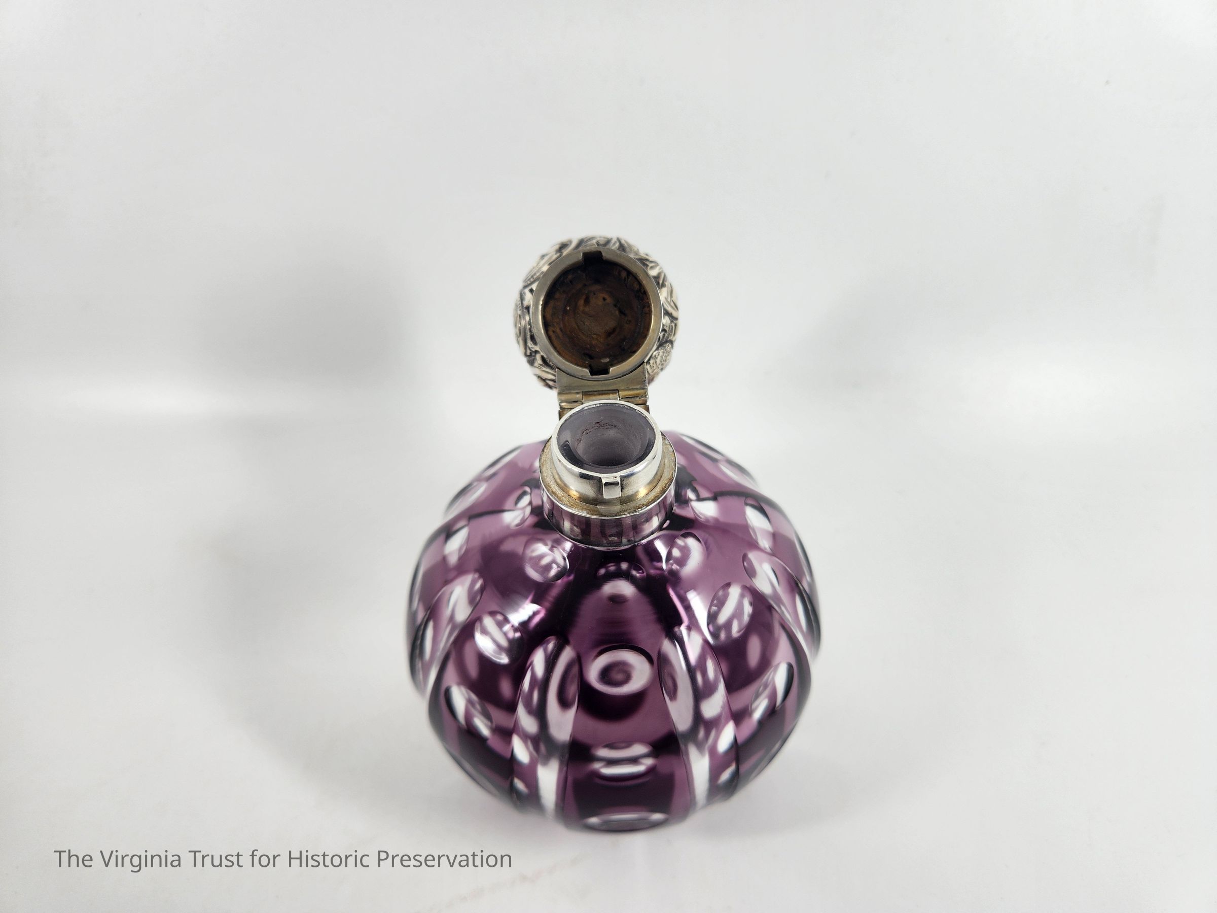 A silver mounted cologne bottle towards the end of the Victorian era. Amethyst colored glass, globed shaped body with a porthole and slice cutting. The bayonet top silver lid is repousse work, has a central cartouche and a cork seal.Dimensions