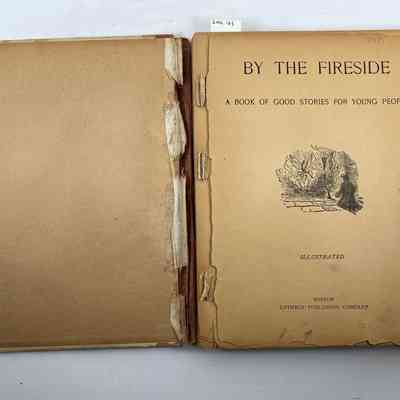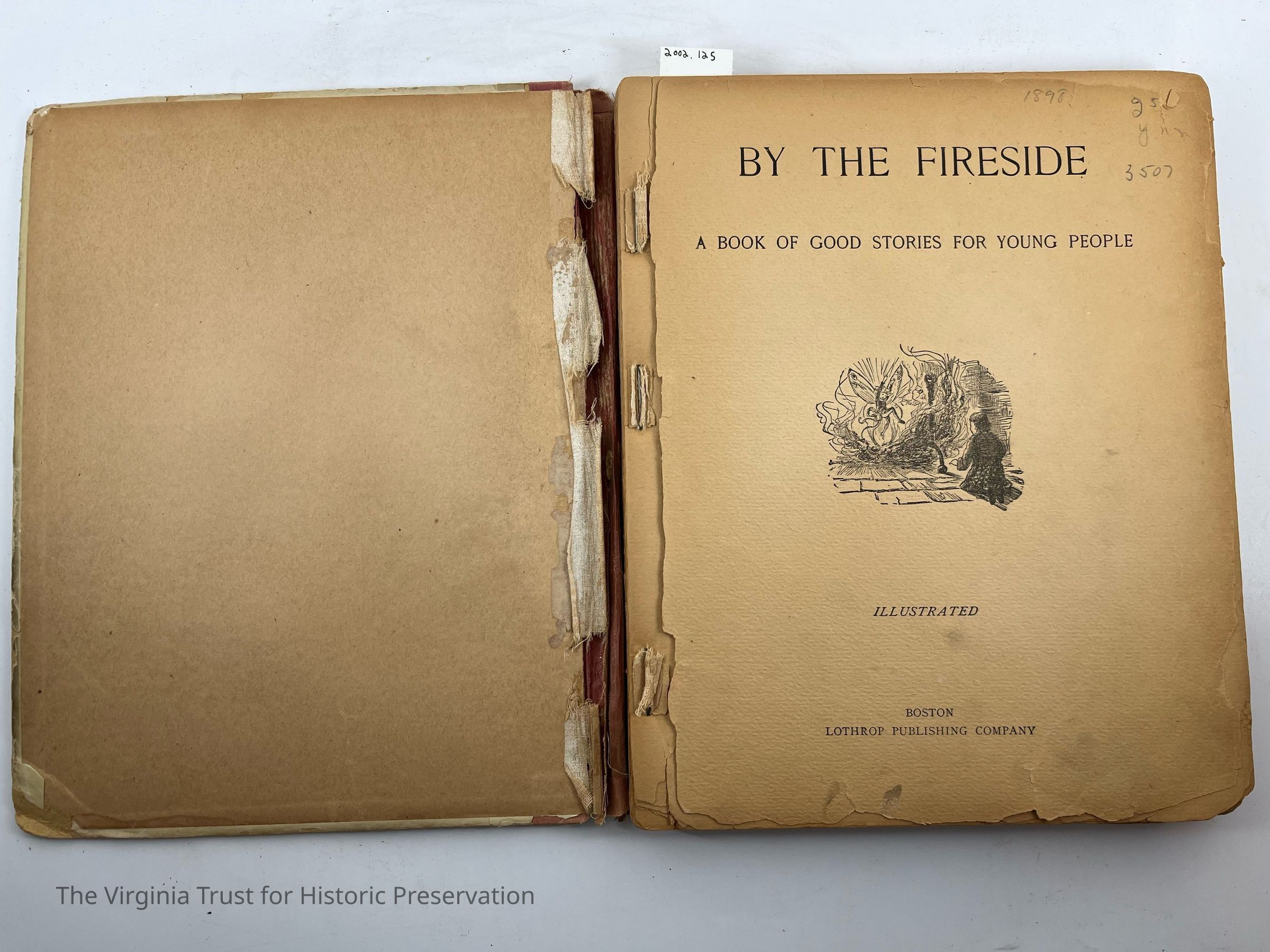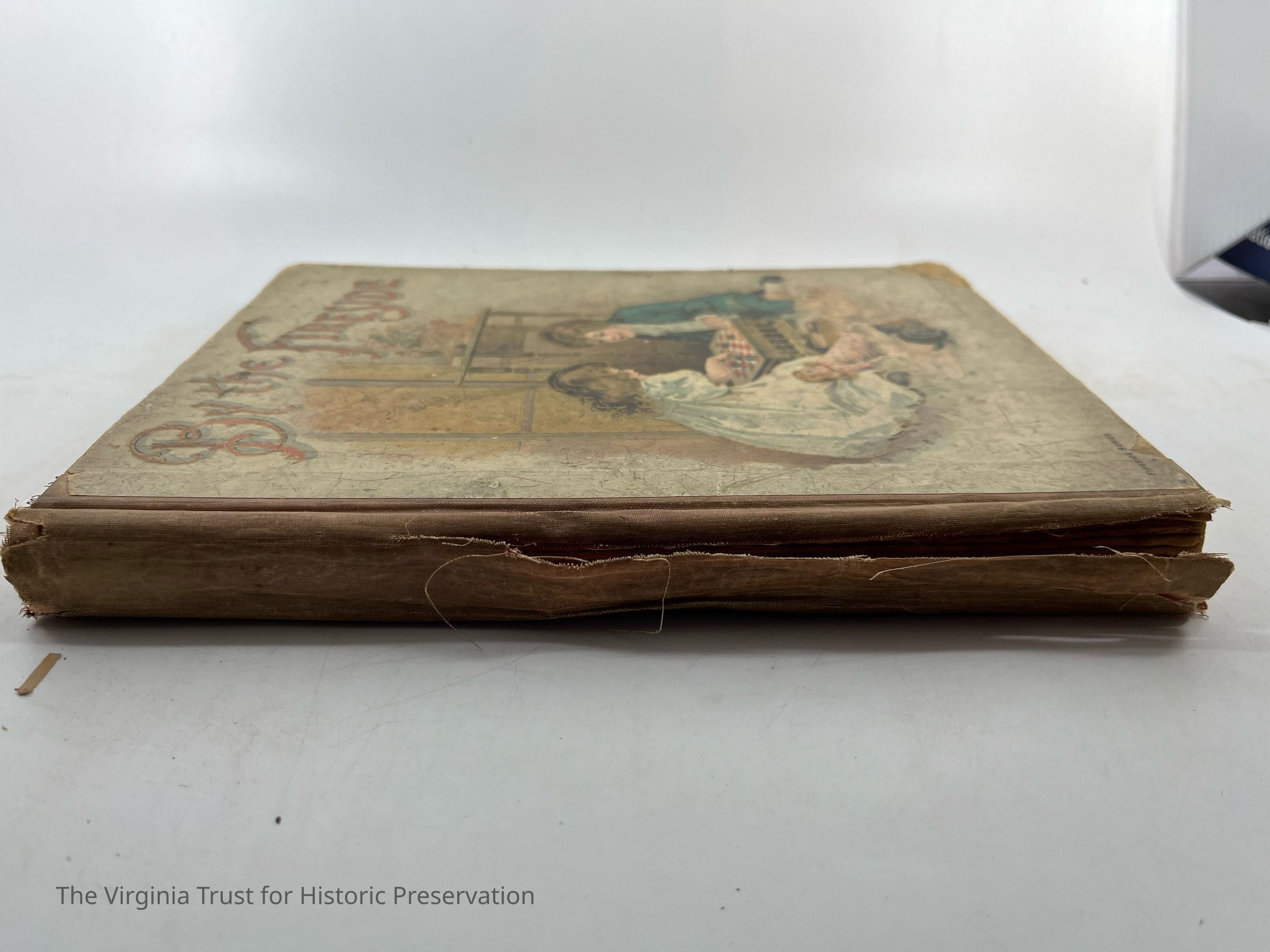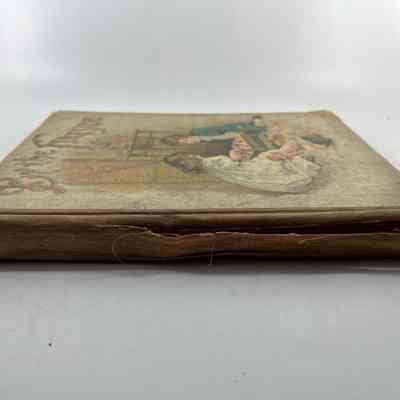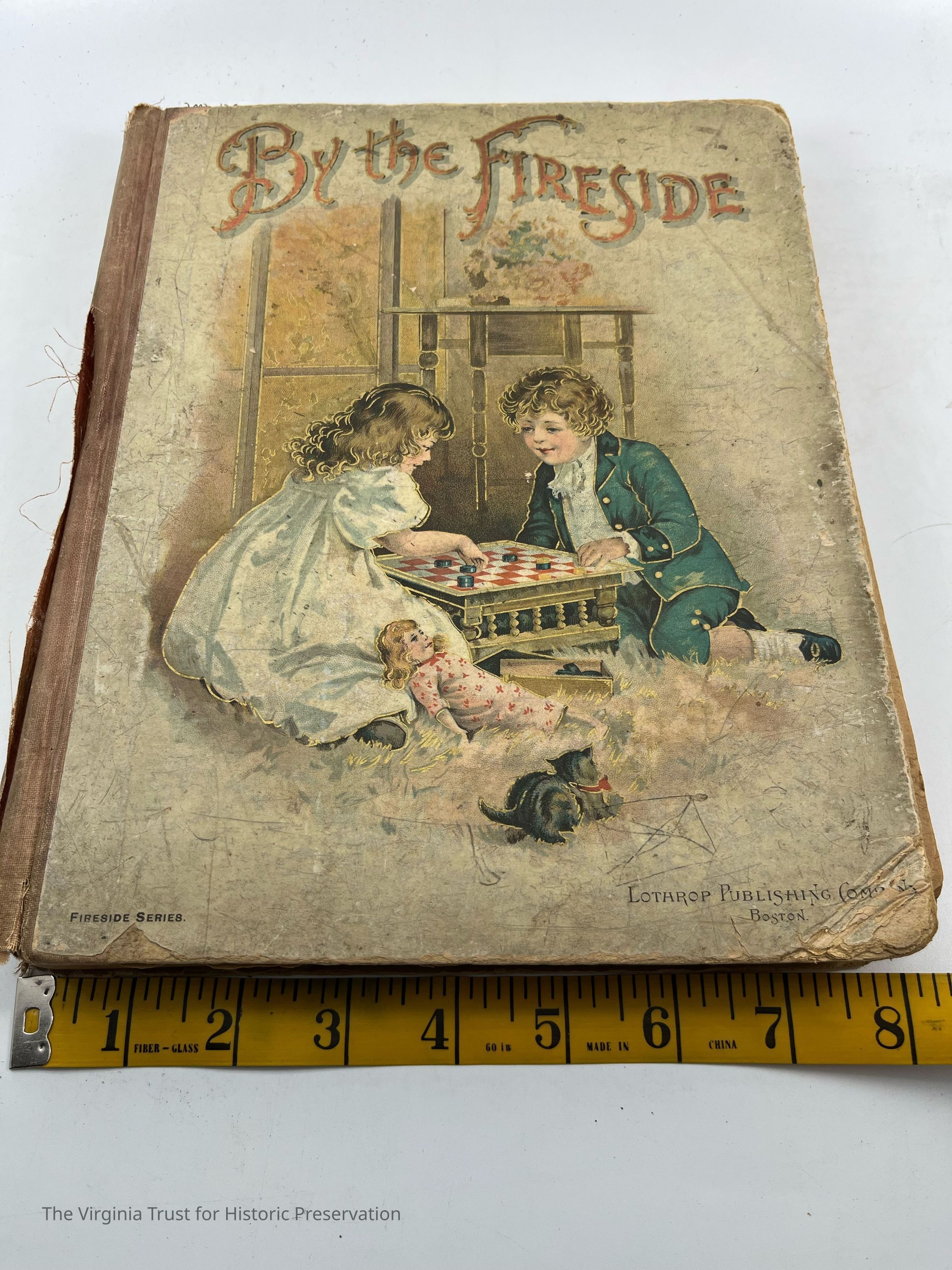 Front cover depicting an image of a young boy and girl playing checkers, loose/detached back cover, fragile binding, worn/unreadable spineDimensions