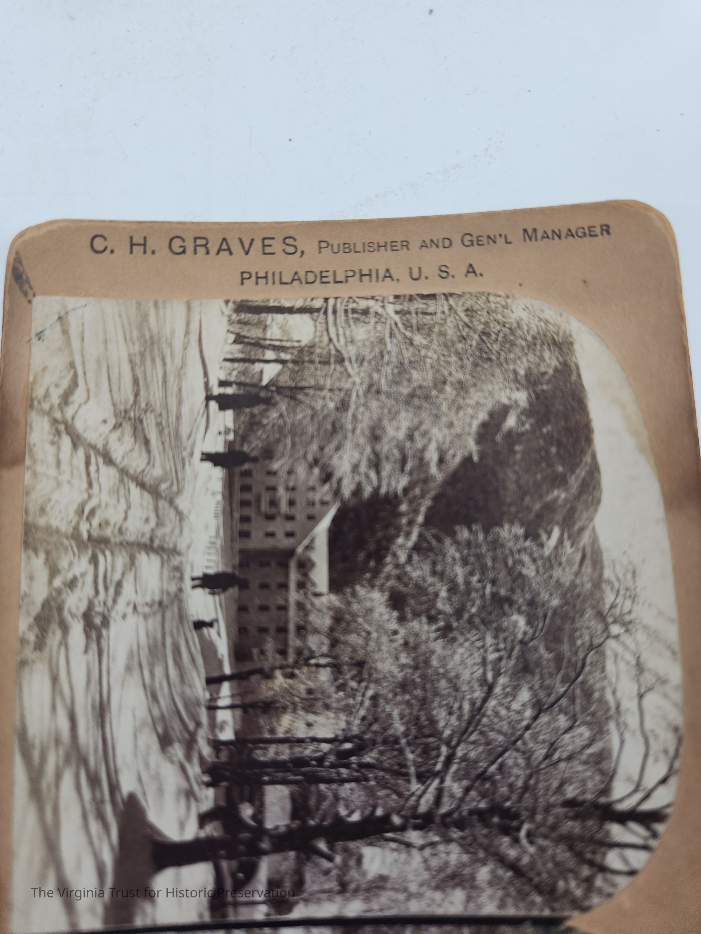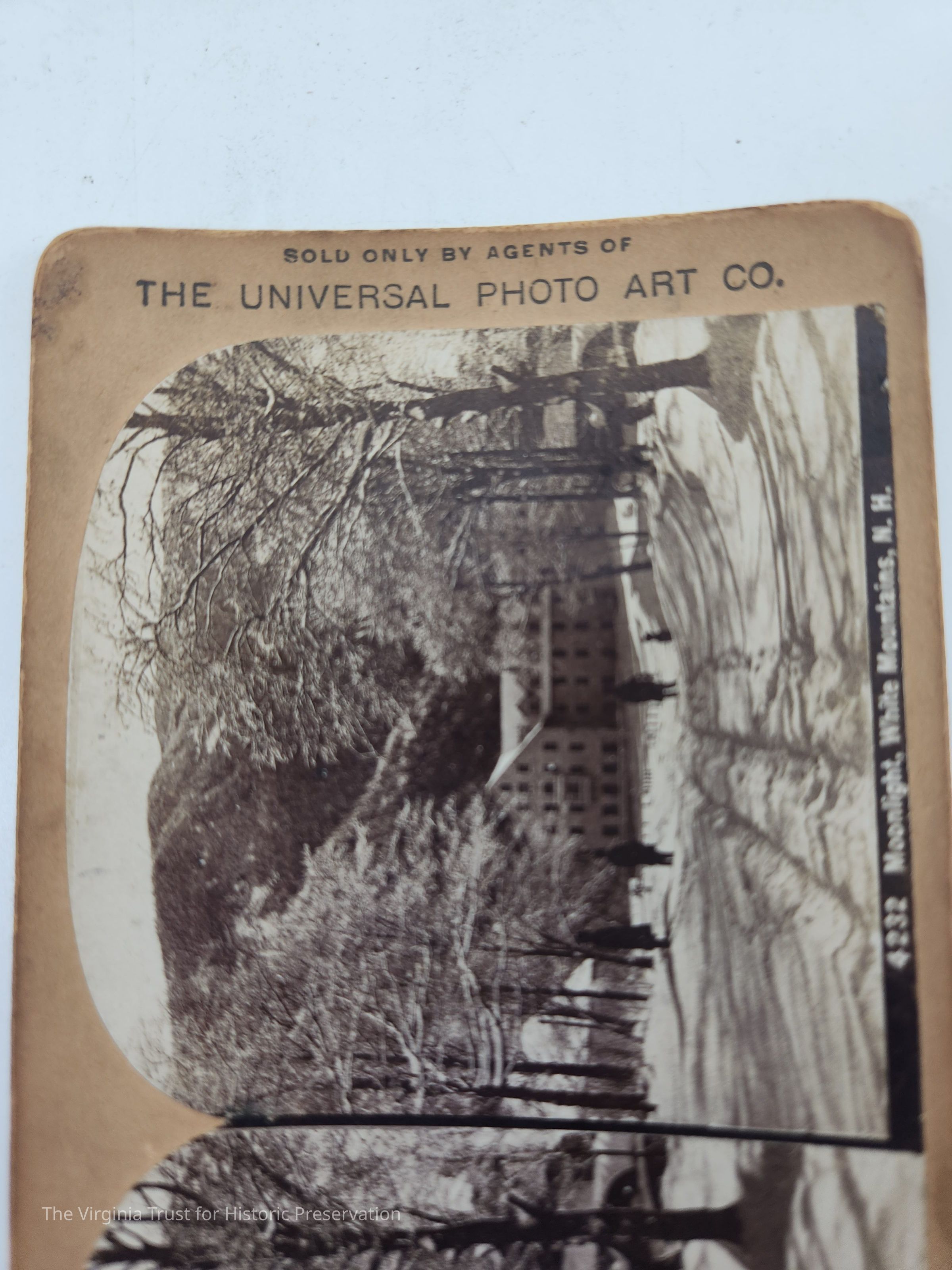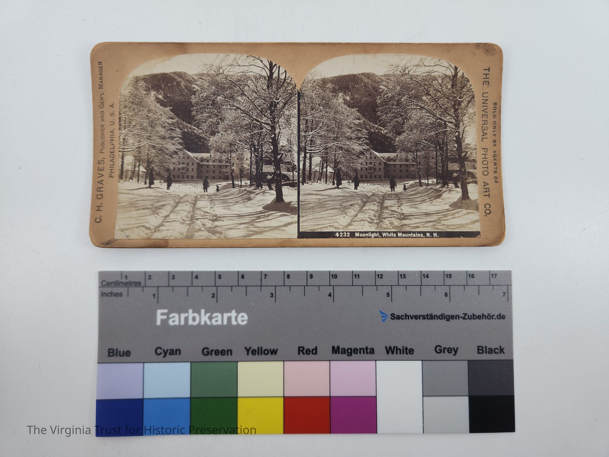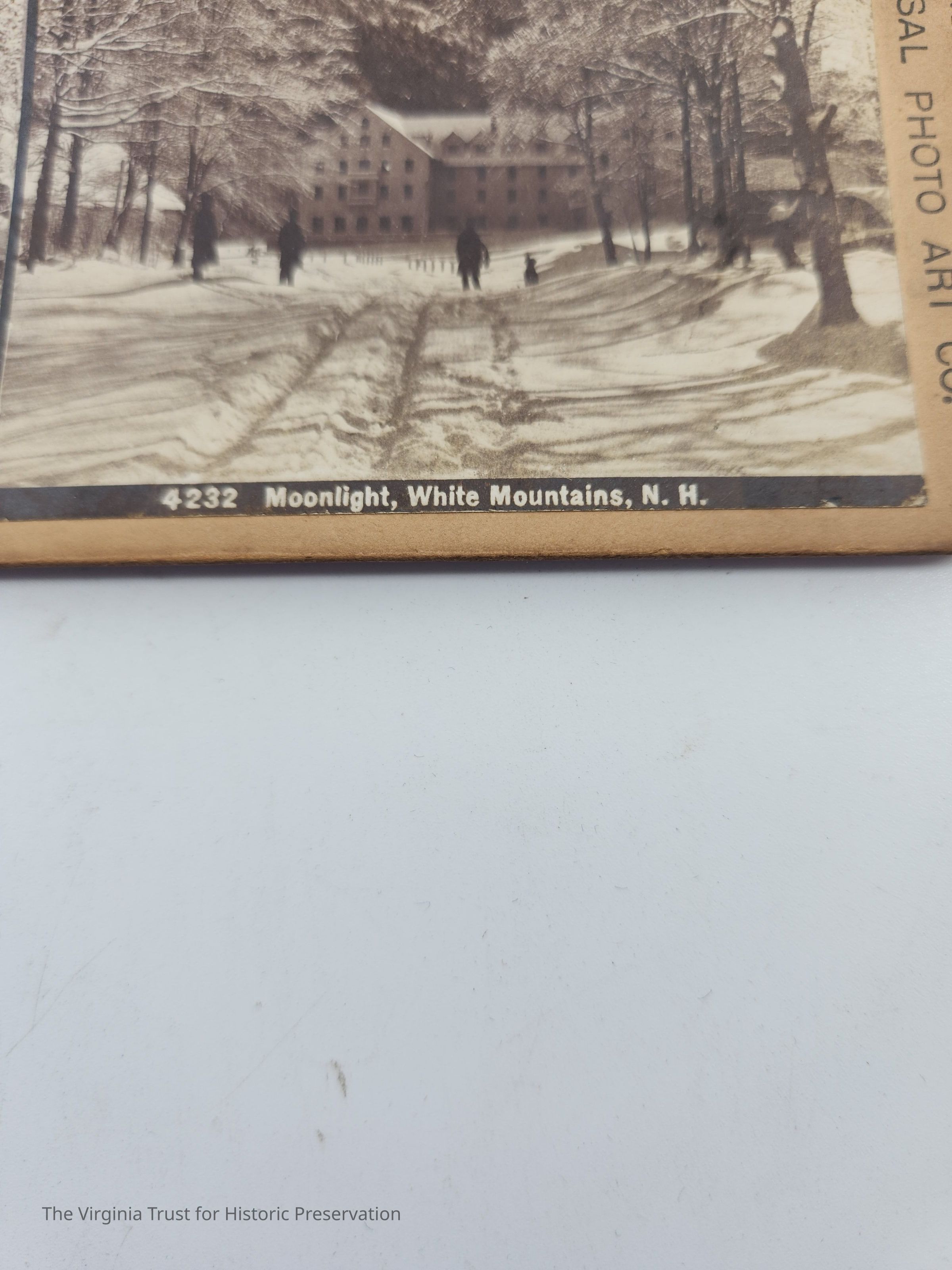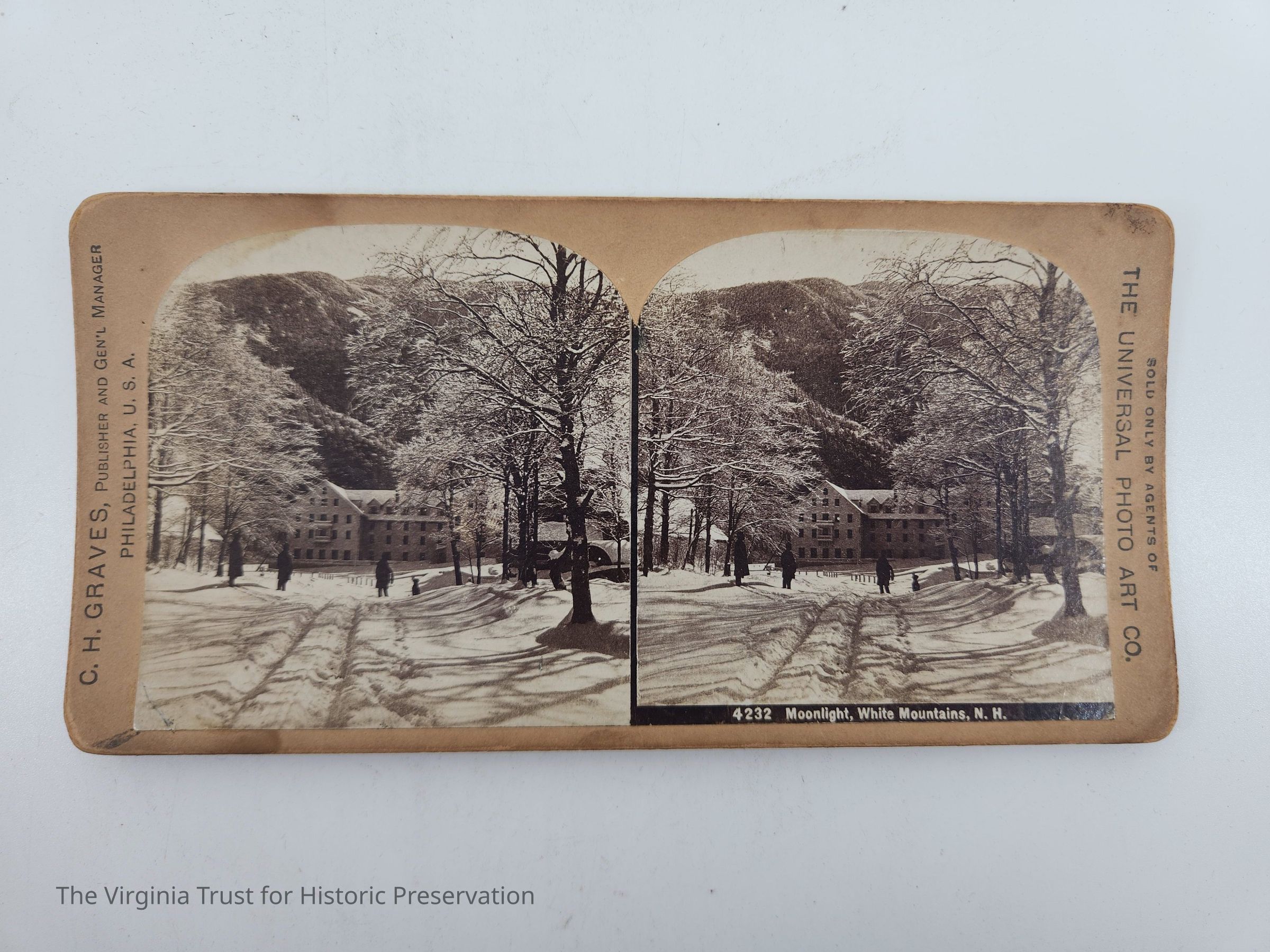 Stereograph titled "4232 Moonlight, White Mountains N. H." depicting large building in front of a mountain and the path leading up to it. There are trees along the path, which is covered in snow, and four people on and near the path. Labeled with "C. H. Graves, Publisher and Gen'l Manager" and "The Universal Photo Art Co."