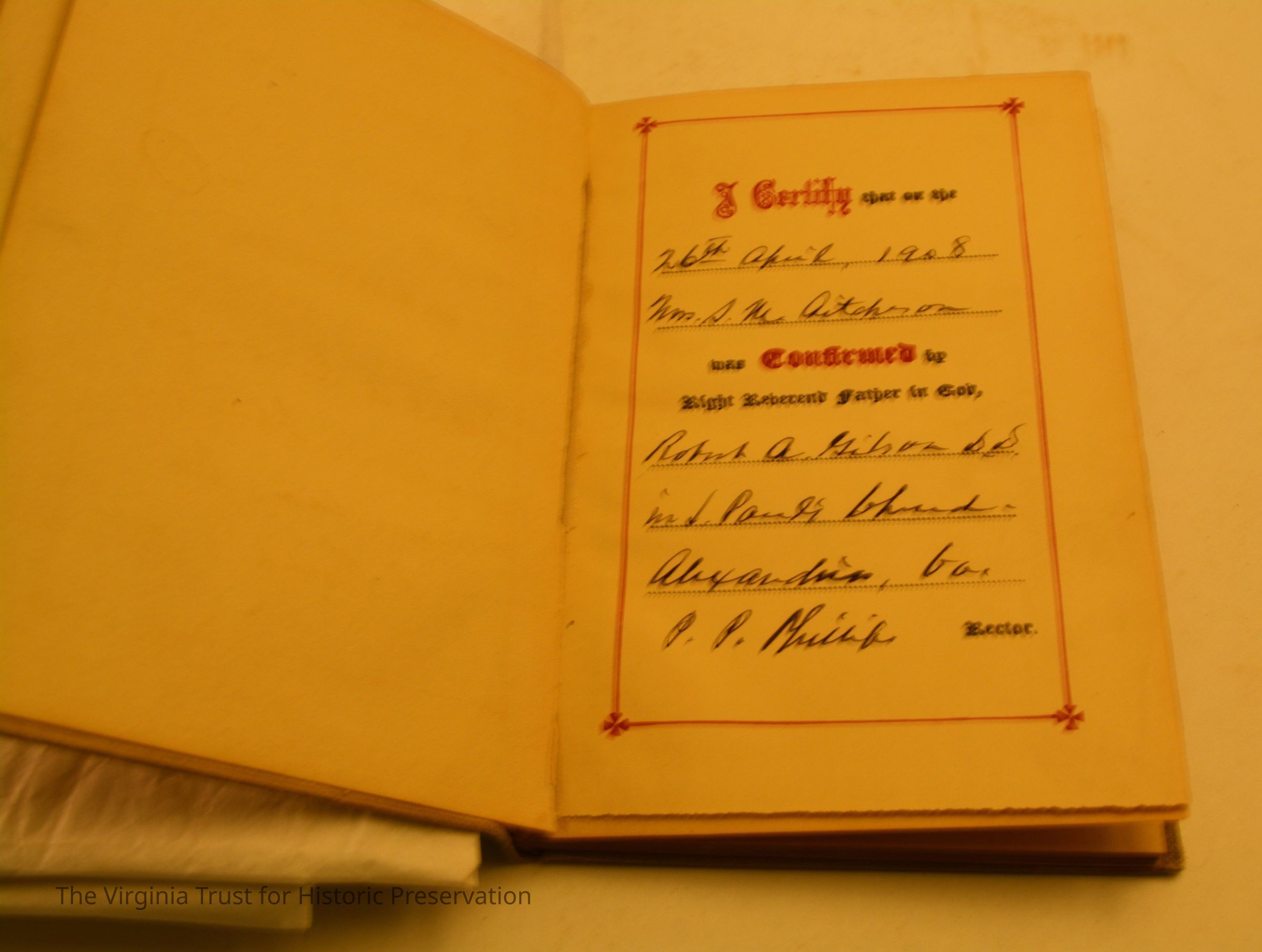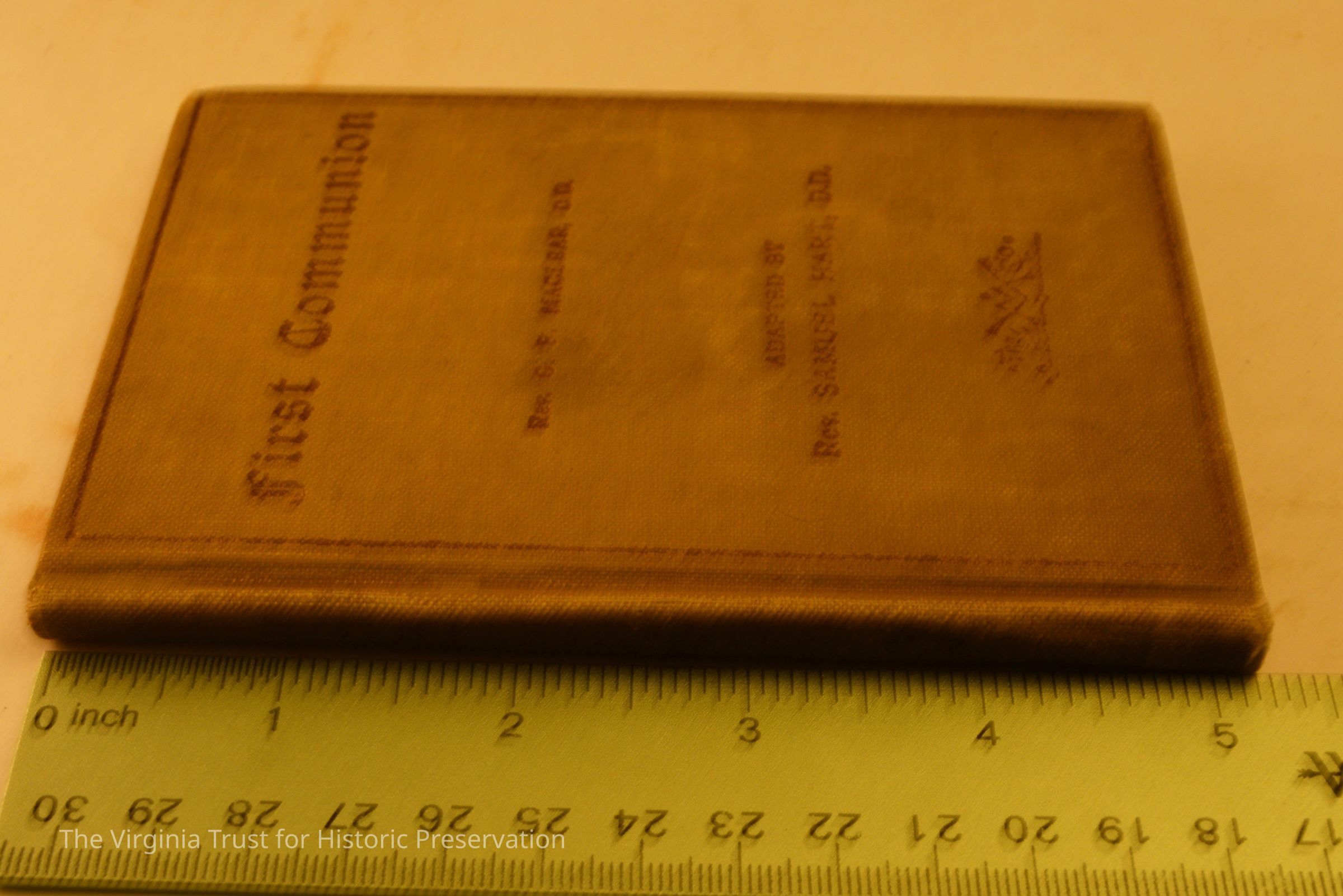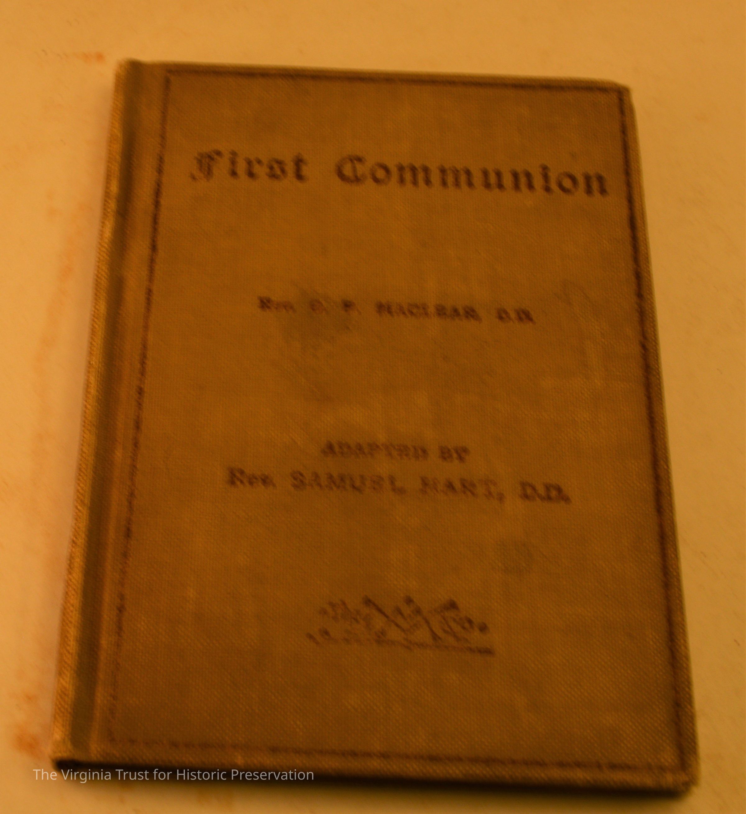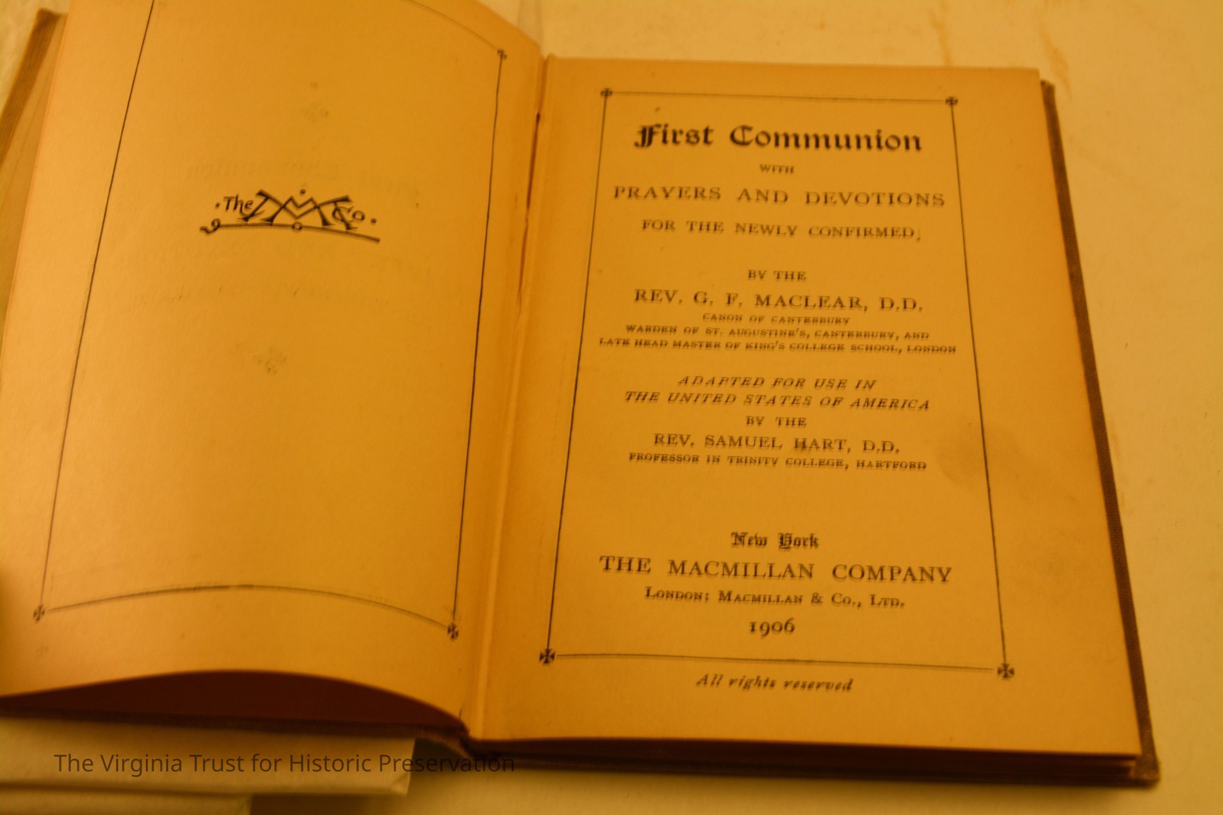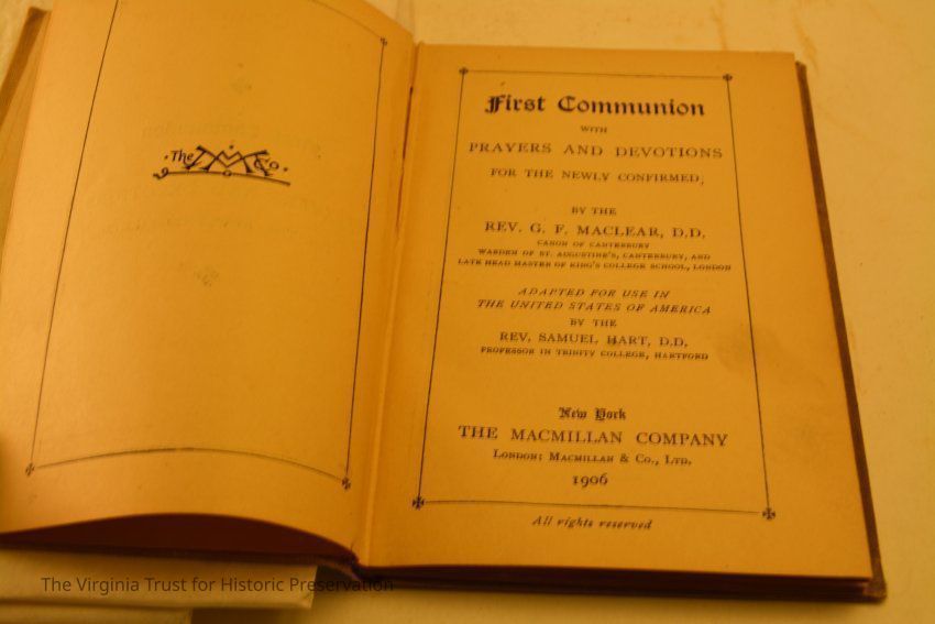 Maclear, Rev. G.F. "First Communion with Prayers and Devotions for the Newly Confirmed. New York: The Macmillan Company, 1906. Inscribed "I certify that on the 26th of April, 1908 Miss S.M. Aitcheson was confirmed by Right Revered Father in God Robert A. Gibson, D." Book contains a tin type of two girls; marked on back "Colonial Beach 1897."