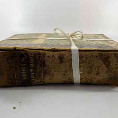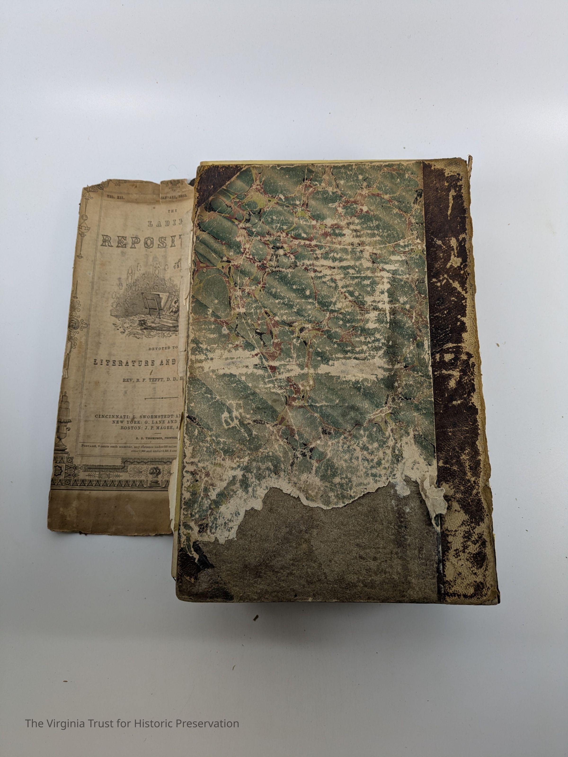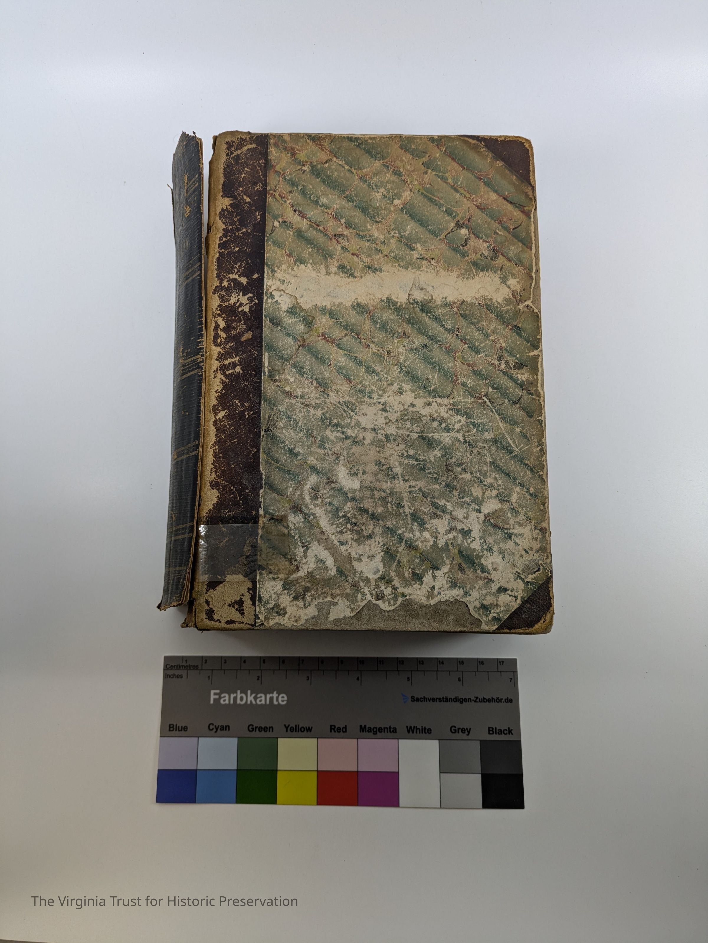 Worn green patterned cover, detached back cover, detached/worn/ barely readable spine