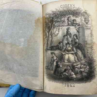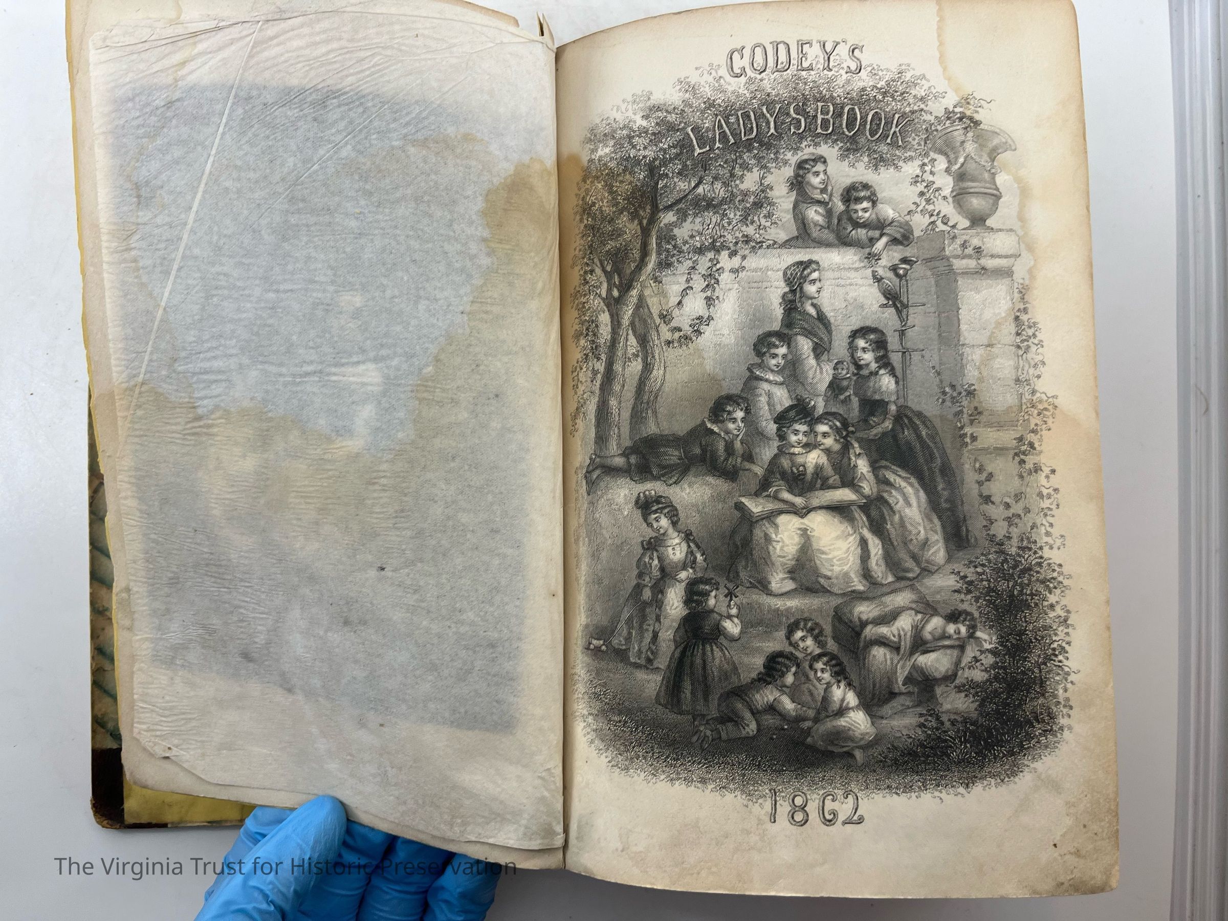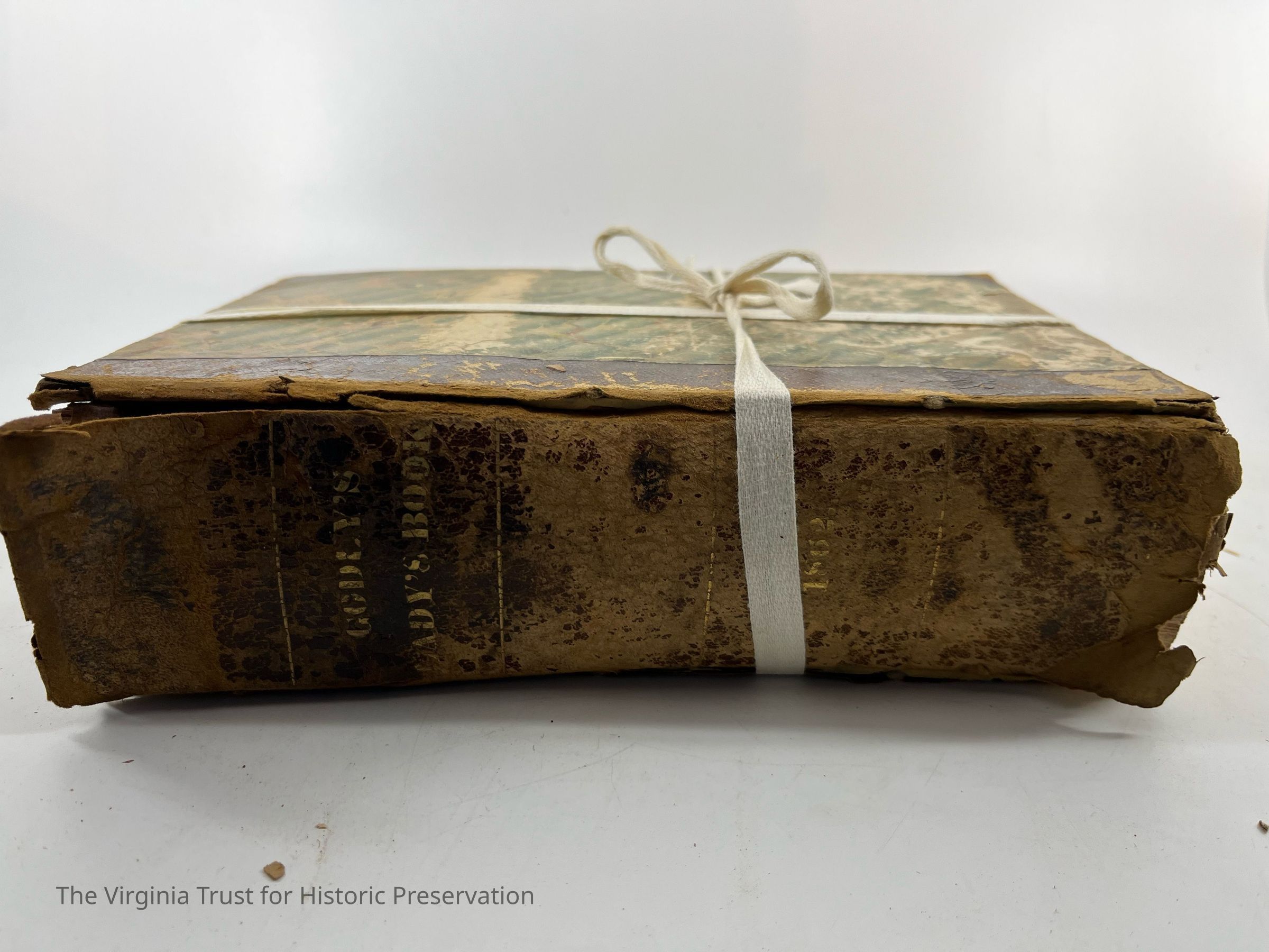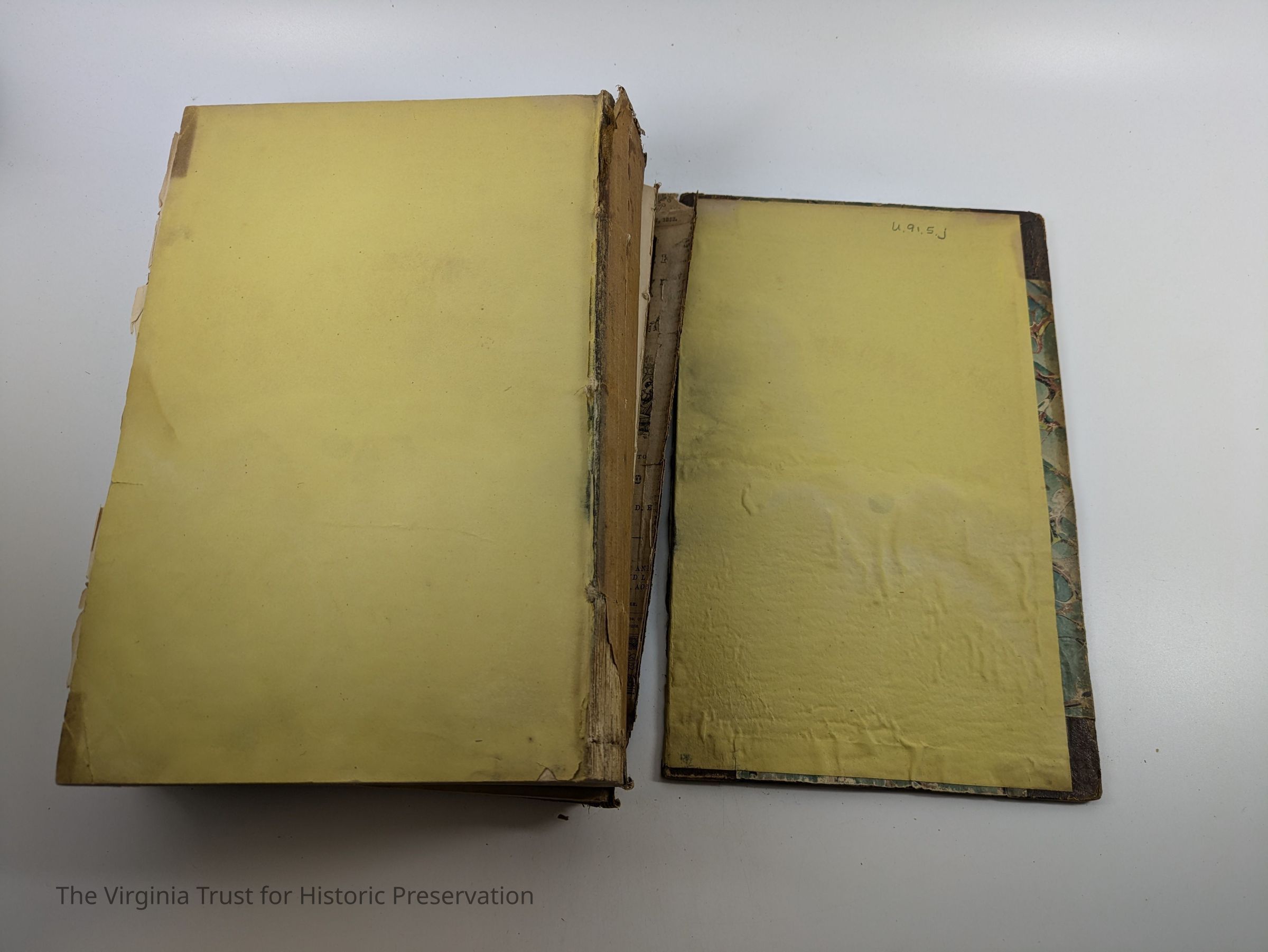 Worn green patterned cover, detached back cover, detached/worn/ barely readable spine