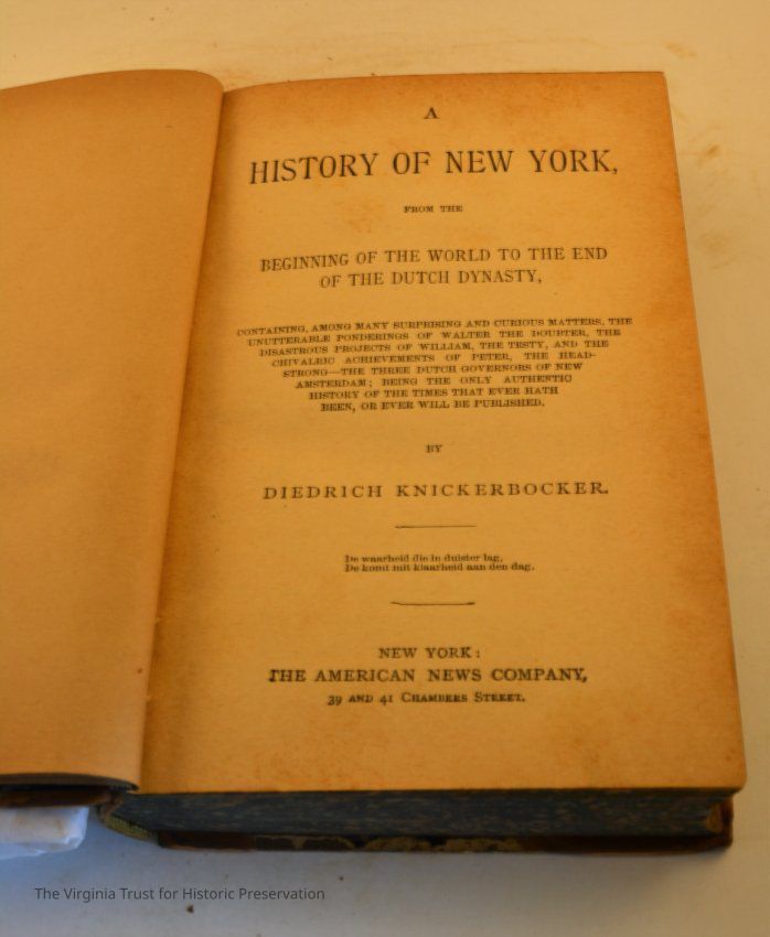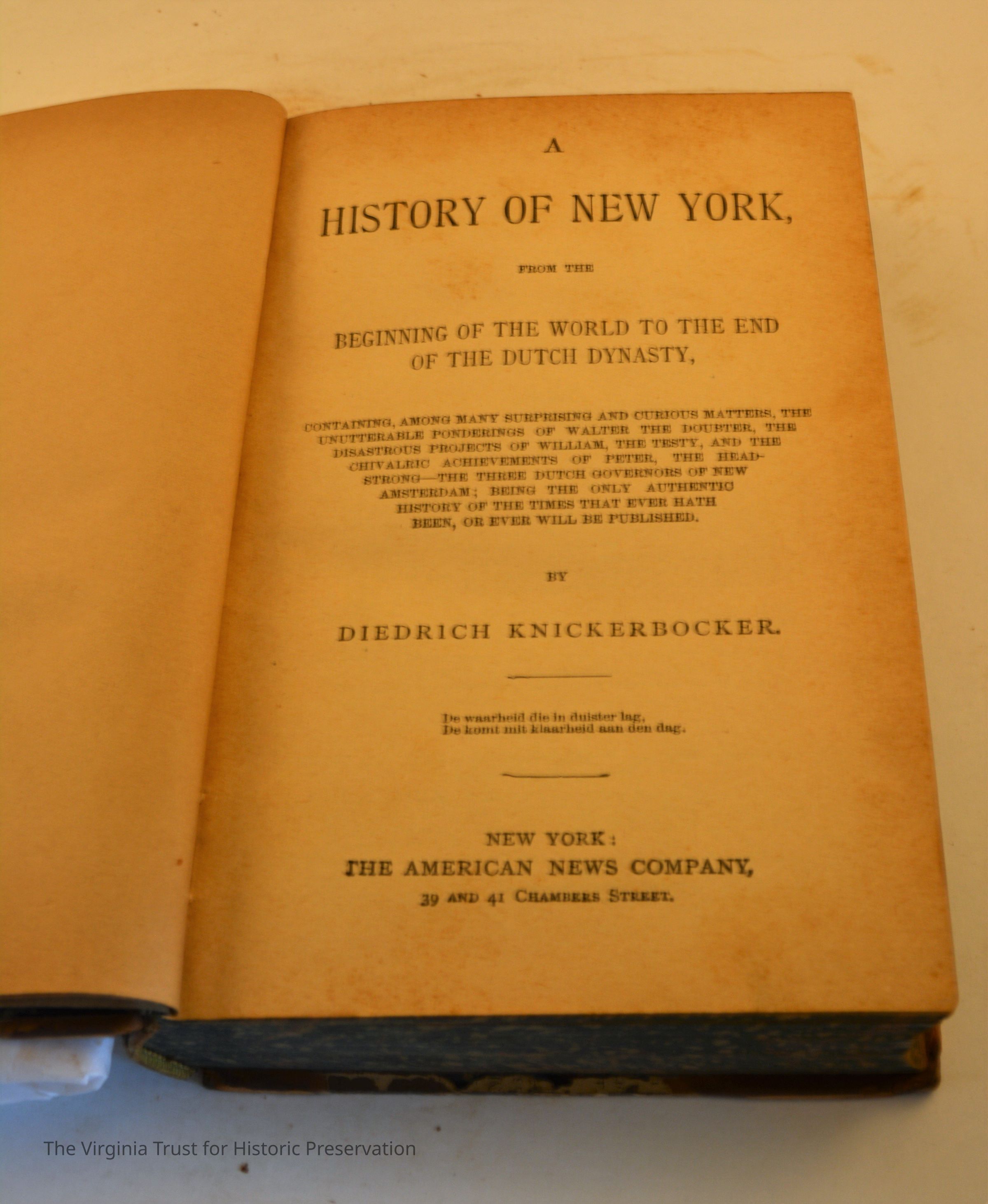 "A History of New York, from the Beginning of the World to the End of the Dutch Dynasty" by Diedrich Knickerbocker. New York: The American News Company, [n.d.]. One of a set of 10 volumes by Washington Irving.