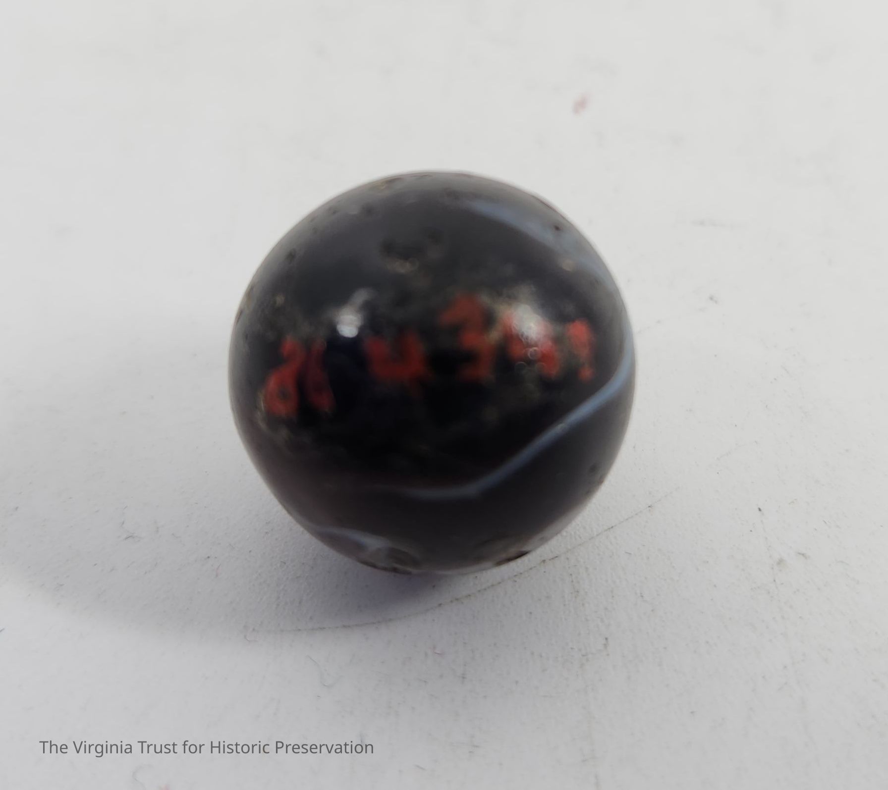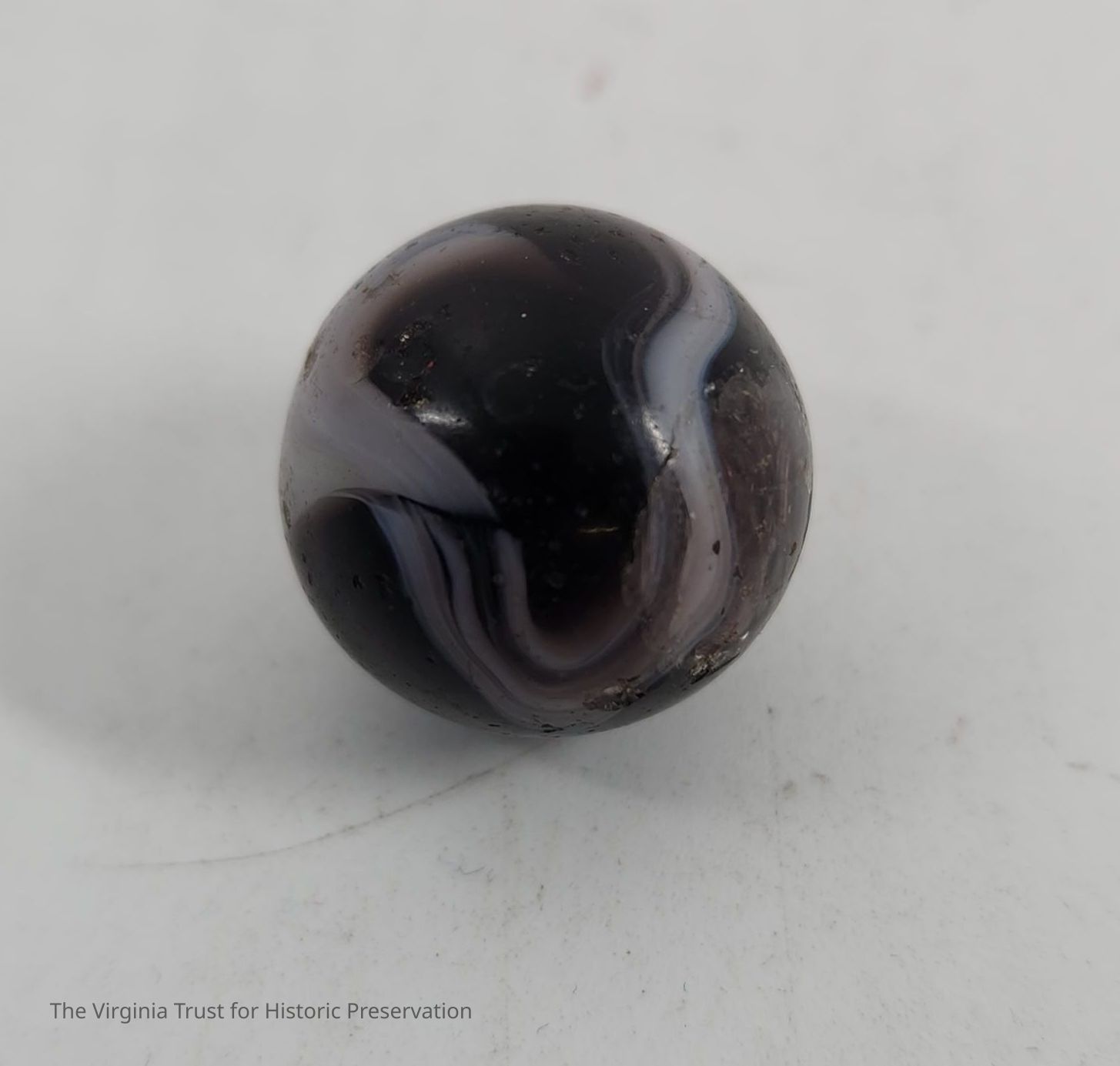 Black and purple with white streaks. One of 11 assorted marbles, various size, design and age.