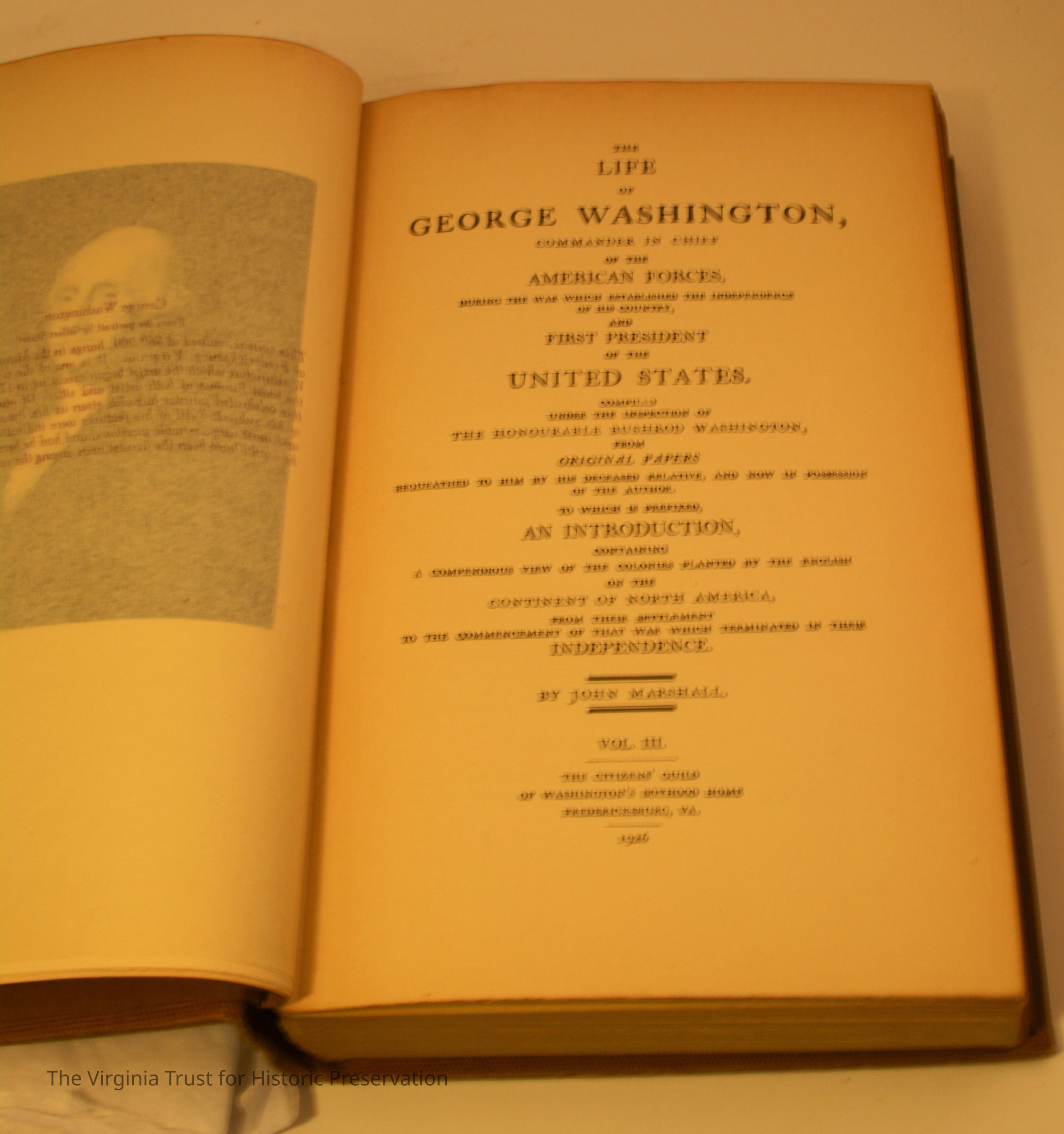 Marshall, John. The Life of George Washington, Commander in Chief of the American Forces... vol. III. Fredericksburg, Va.: The Citizens' Guild of Washington's Boyhood Home, 1926. Missing paper file.