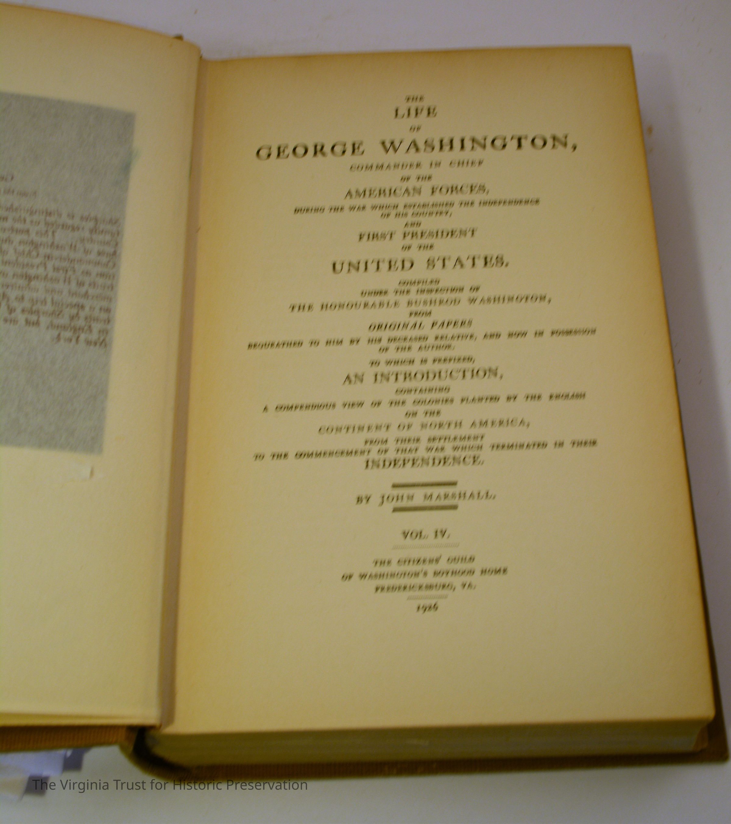 Marshall, John. The Life of George Washington, Commander in Chief of the American Forces... vol. IV. Fredericksburg, Va.: The Citizens' Guild of Washington's Boyhood Home, 1926. Missing paper file.