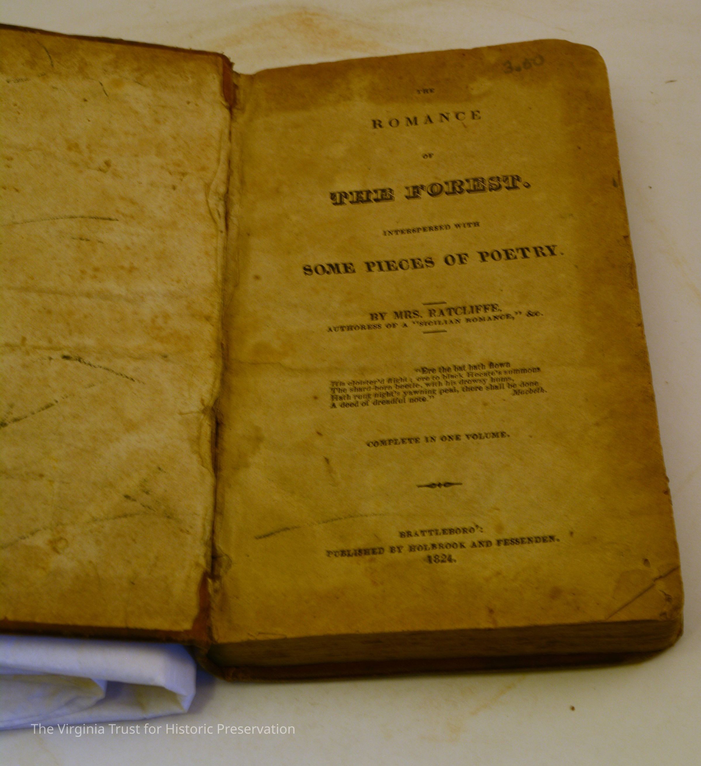 Mrs. Ratcliffe. The Romance of the Forest. Interspersed with Some Pieces of Poetry. Brattleboro': Holbrook and Fessenden, 1824. Missing paper file.