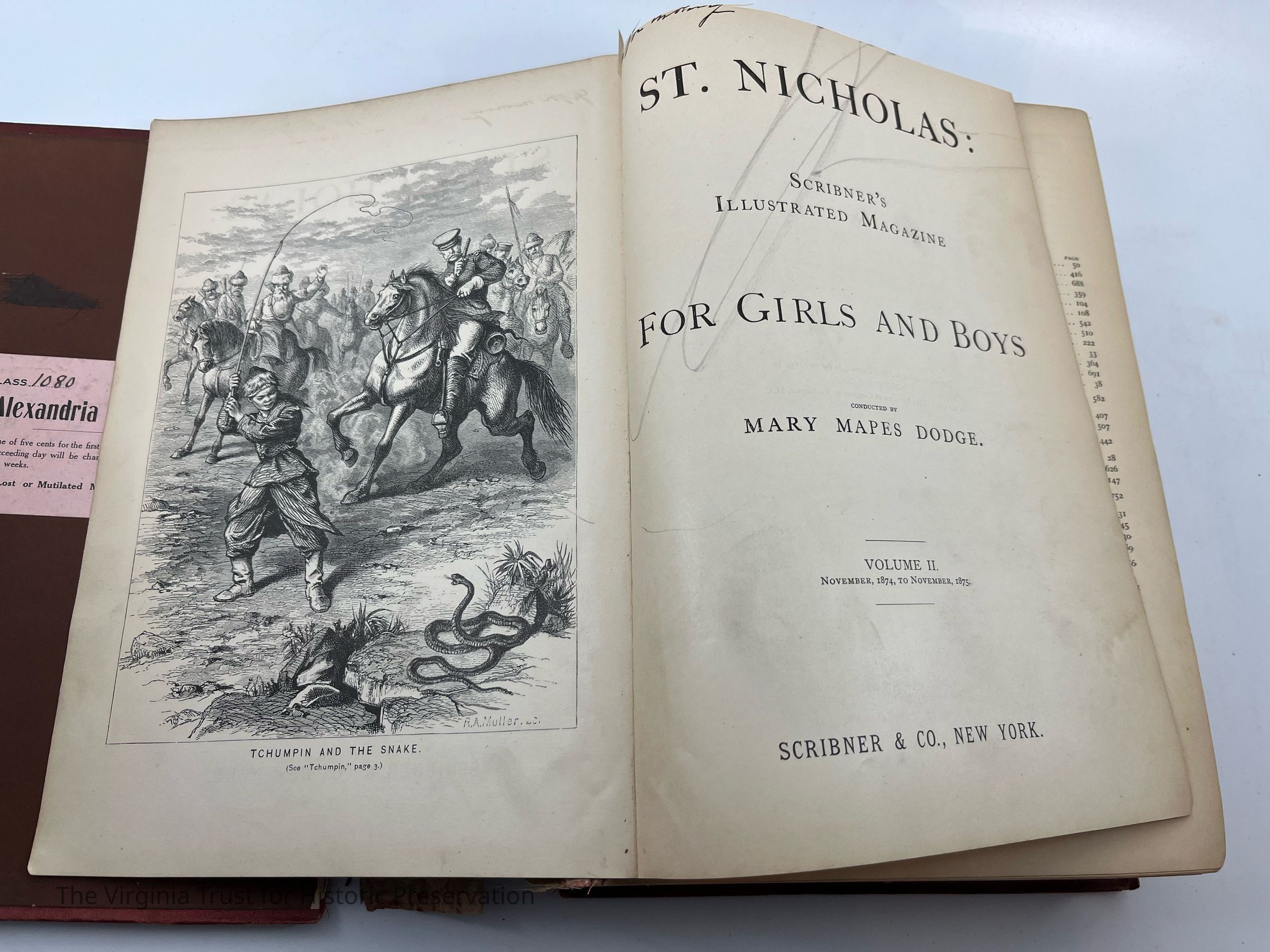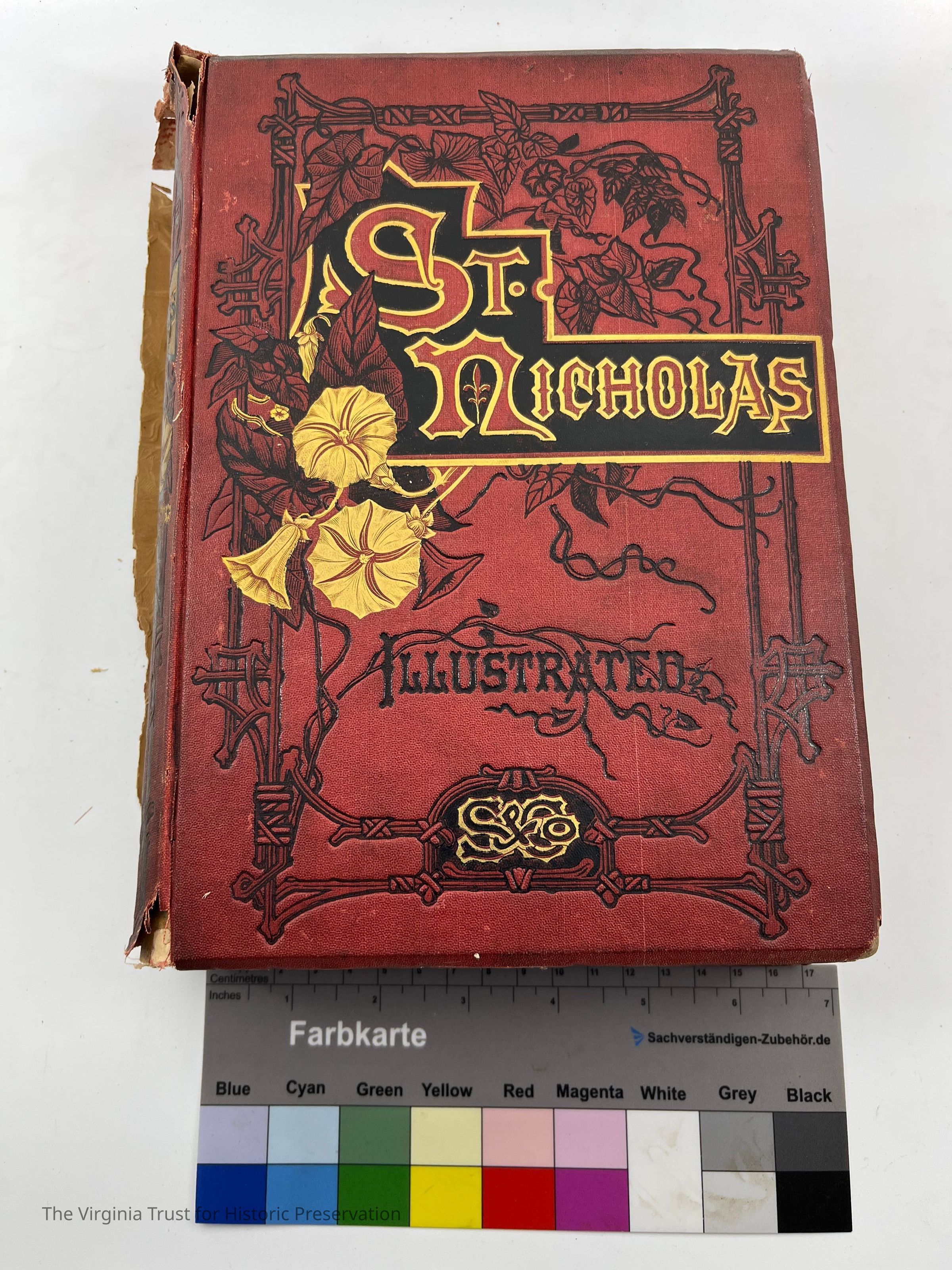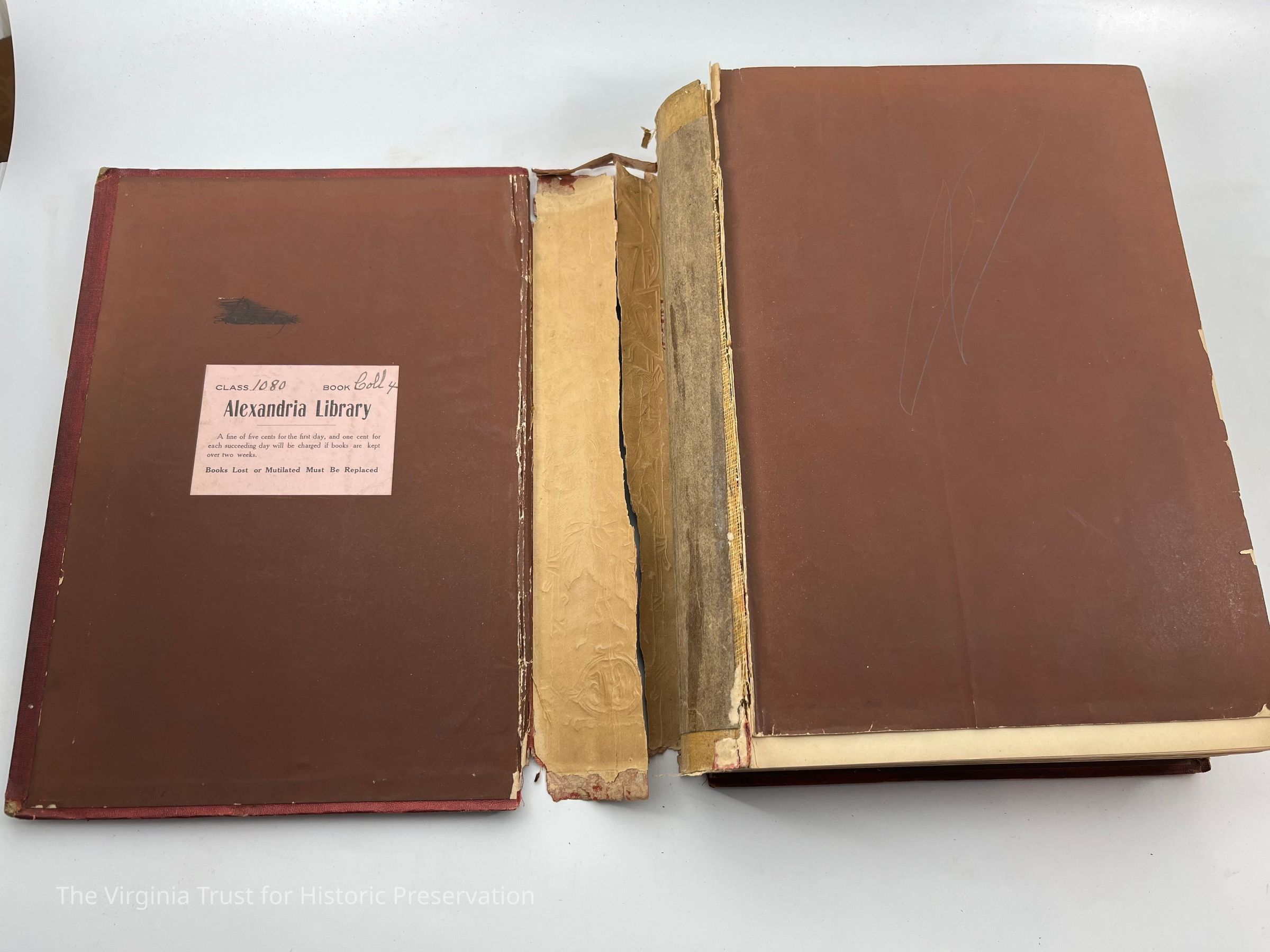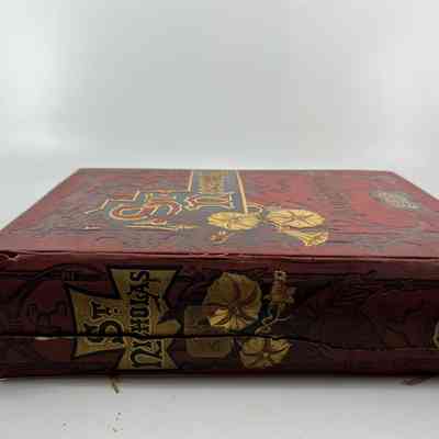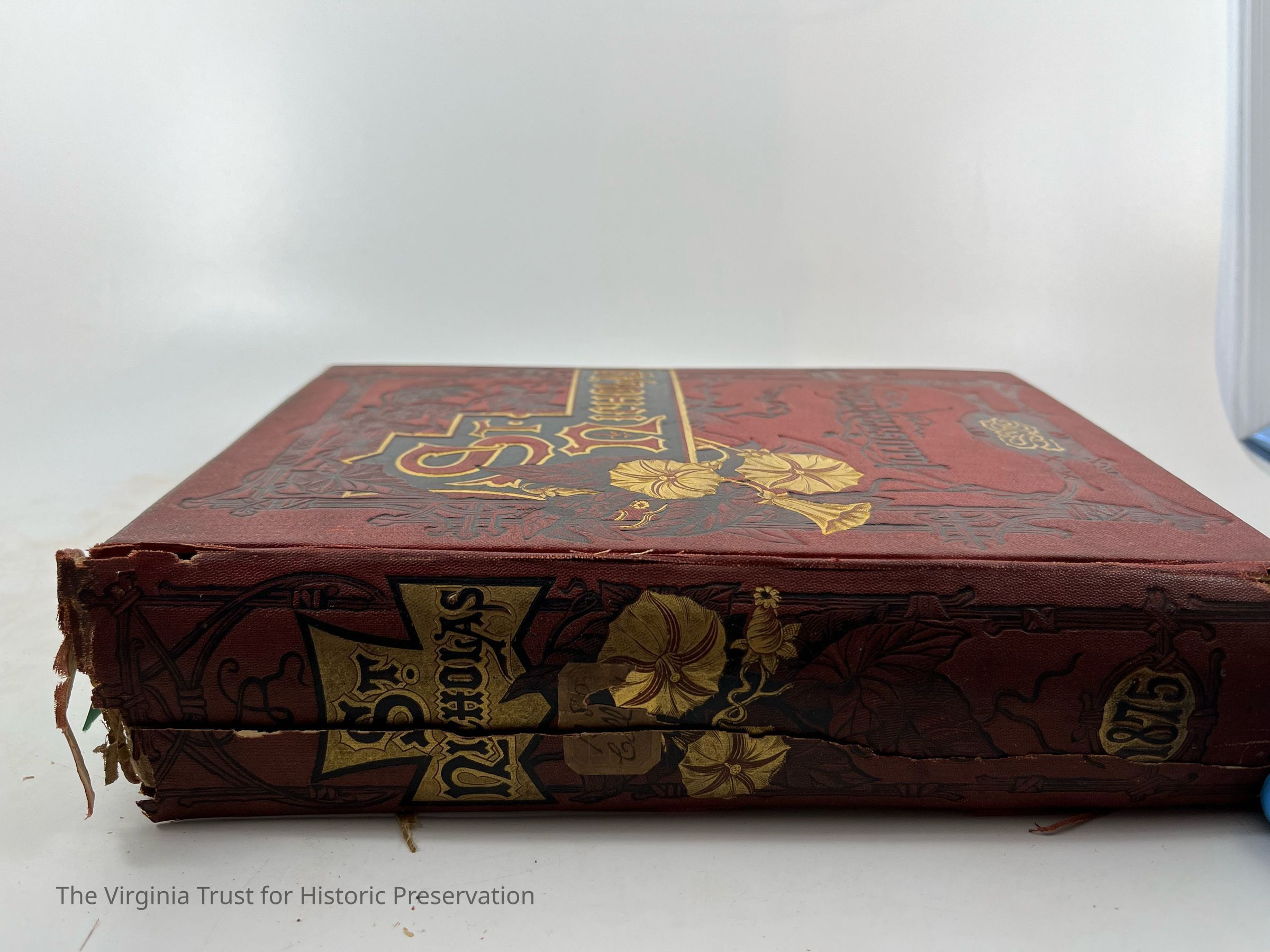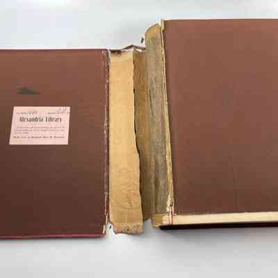 Maroon colored, flower pattern on cover, intact/loose binding, readable/torn spine, sticker on spine