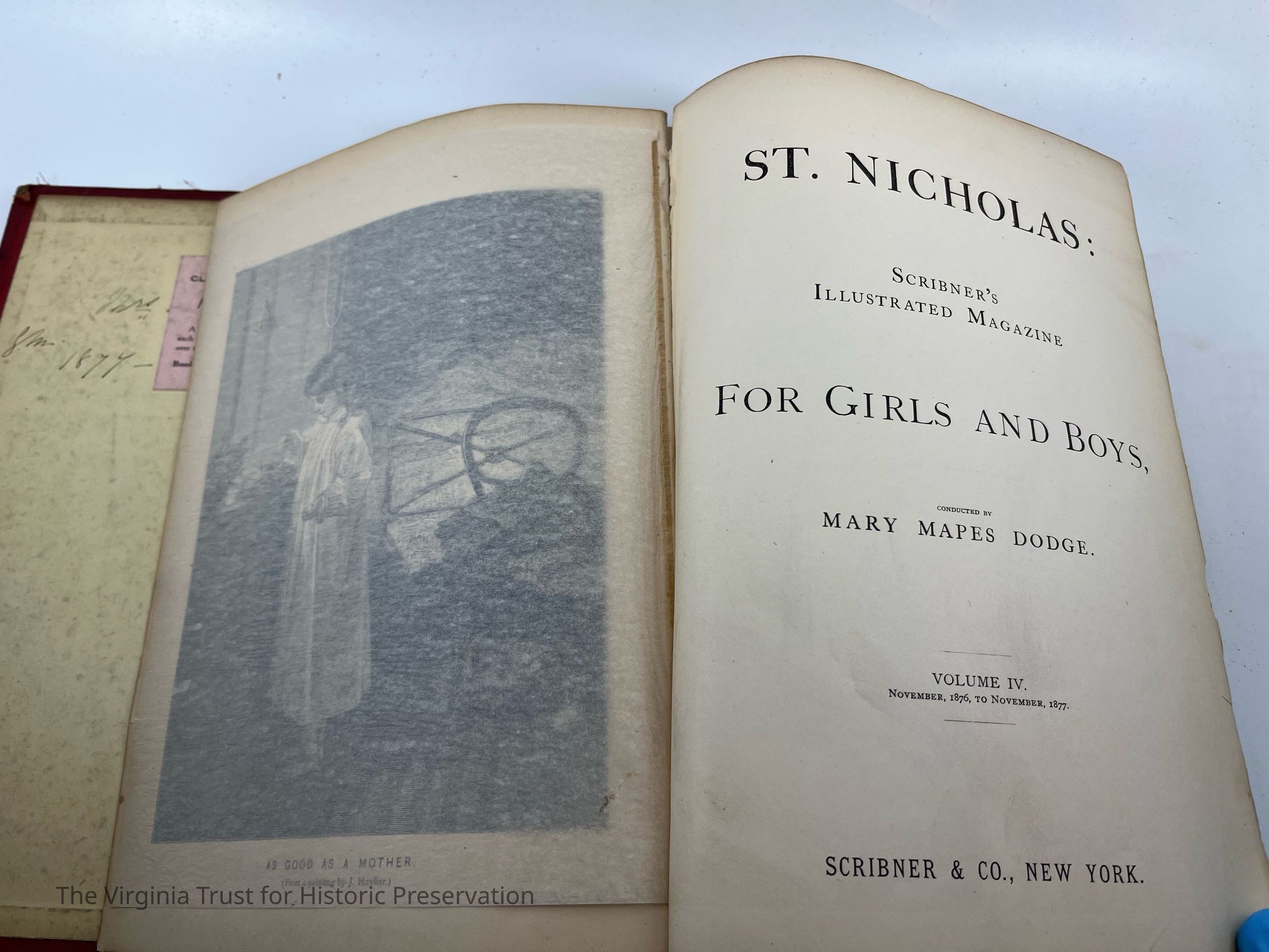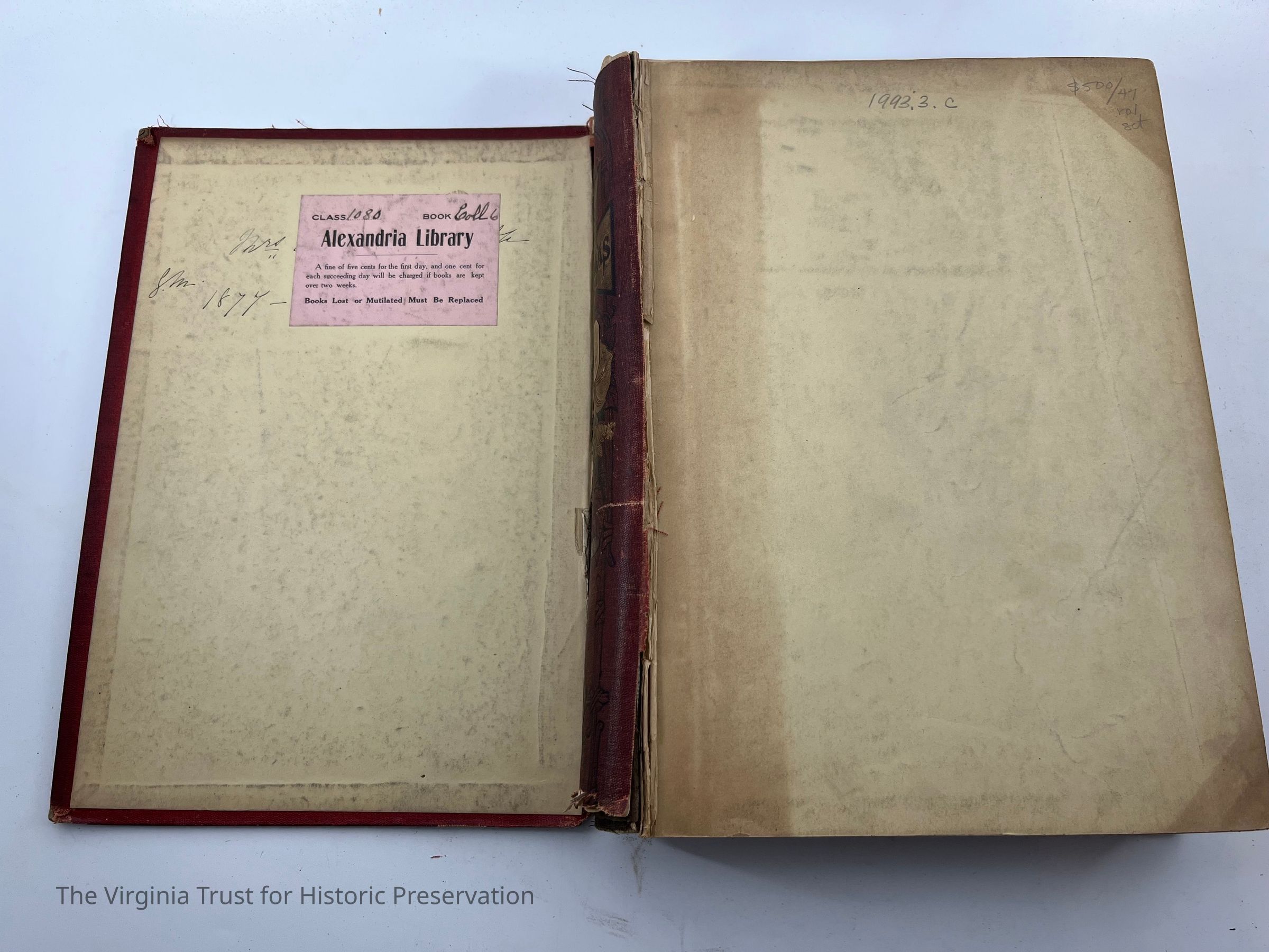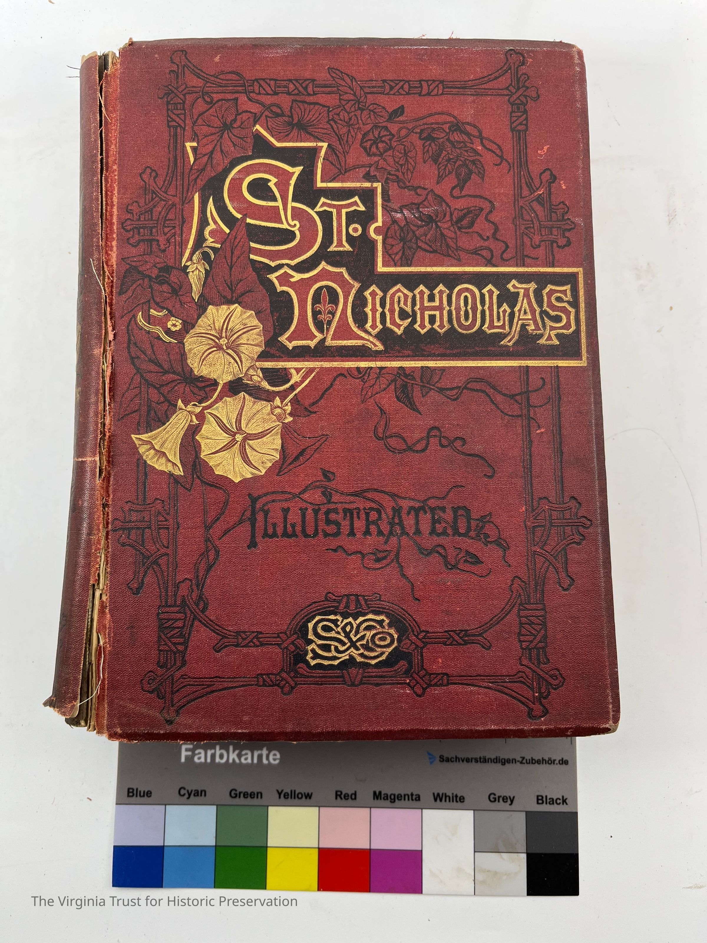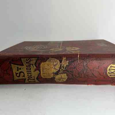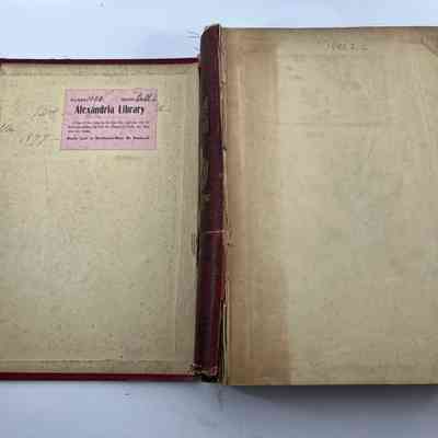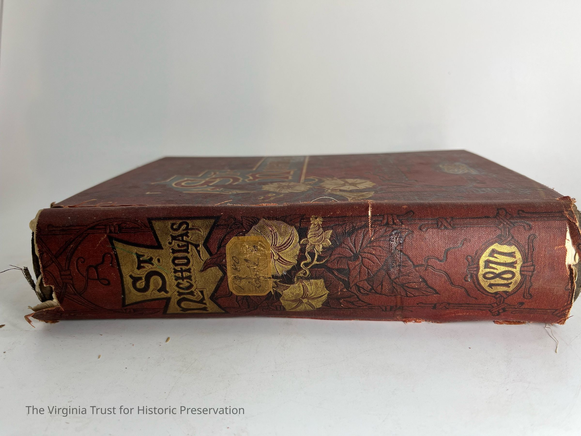Maroon colored, flower pattern on front cover, fragile binding, readable spine, sticker on spine