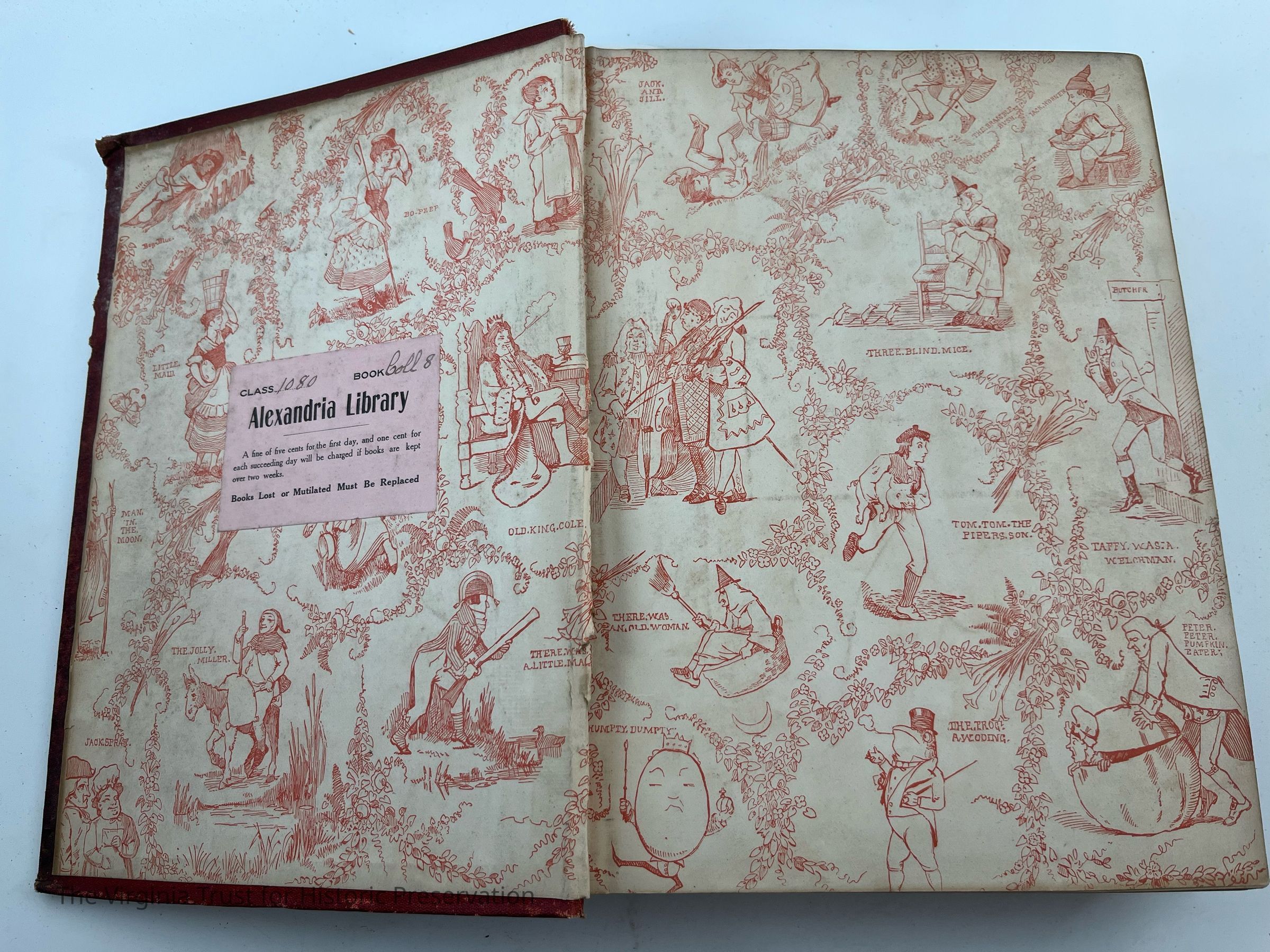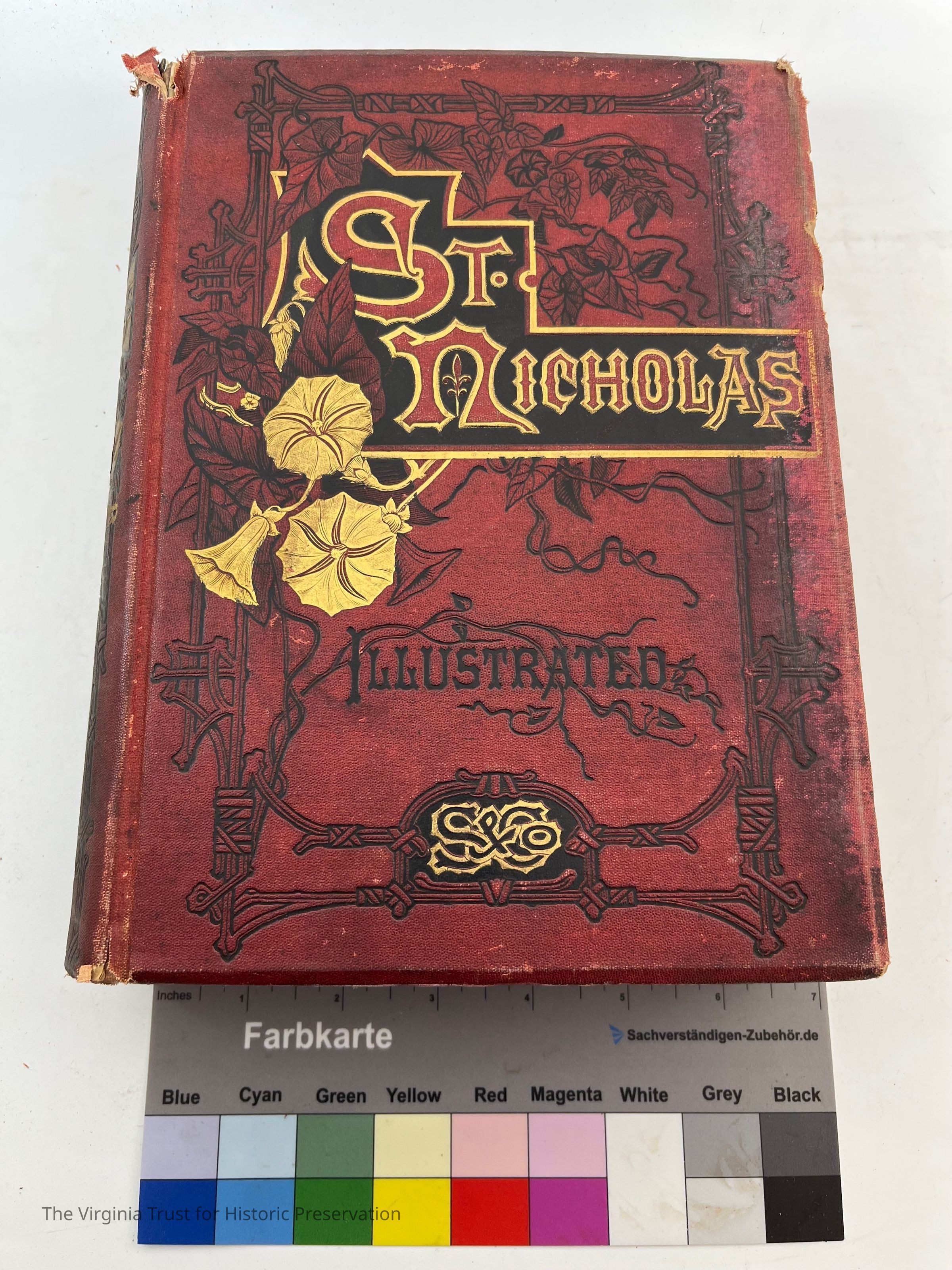 Maroon colored, flower pattern on front cover, good binding, readable spine, sticker on spine