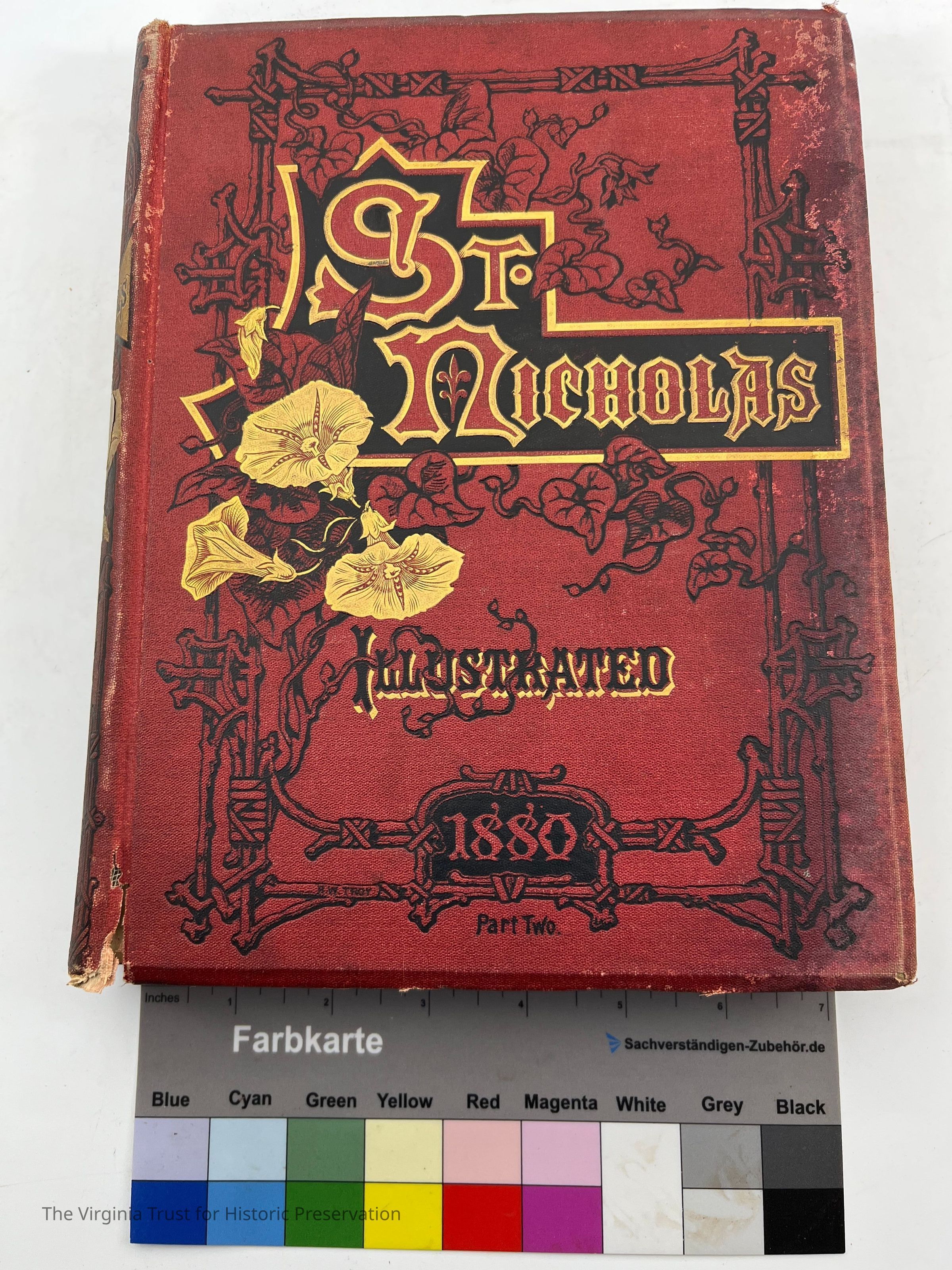 Maroon colored, flower pattern on front cover, good binding, readable spine