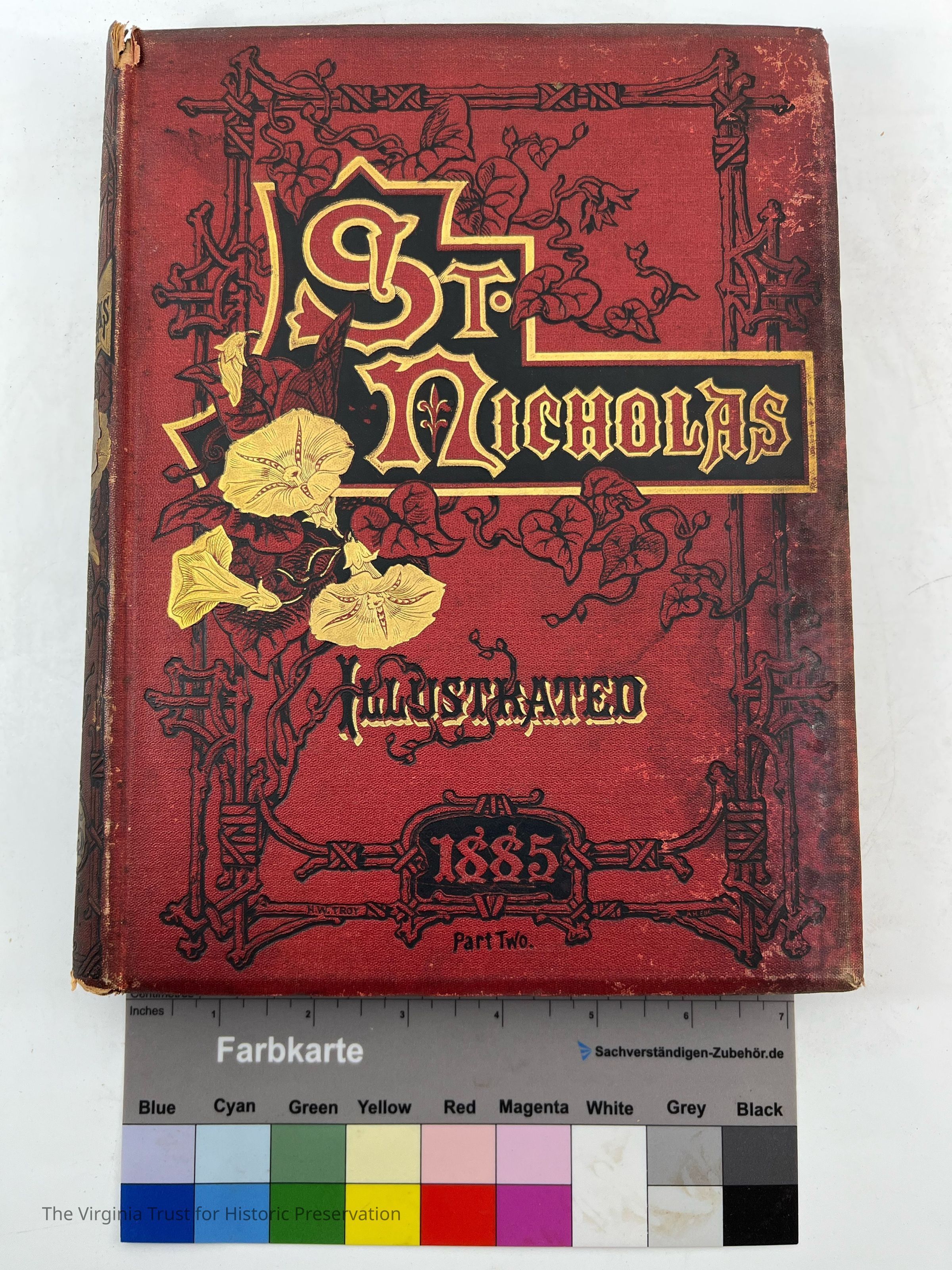 Maroon colored, flower pattern on front cover, good binding, readable spine, sticker on spine