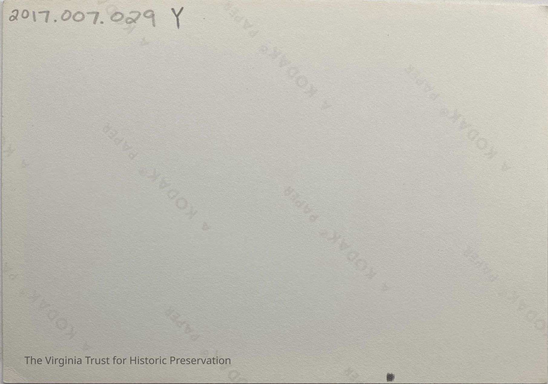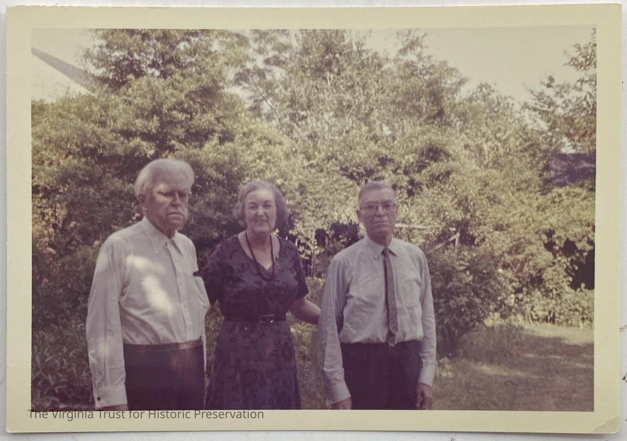 Color photograph of John L. Lewis standing with a woman (Ms Edith C) and a man. All three looking at camera while the Woman (center) holds arms of both men (Lewis on the left). Most likely in the Lee-Fendall garden during Lewis residence. Trees and foliage in background. Small piece of adjacent house in top left corner. White border with straight edges.