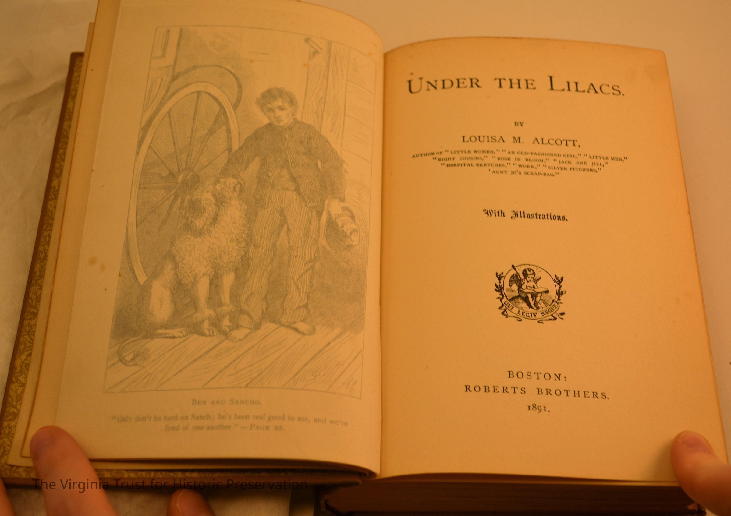 "Under the Lilacs" by Louisa M. Alcott. Boston: Roberts Brothers, 1891. 5 loose clippings relating to Louisa May Alcott in front cover.