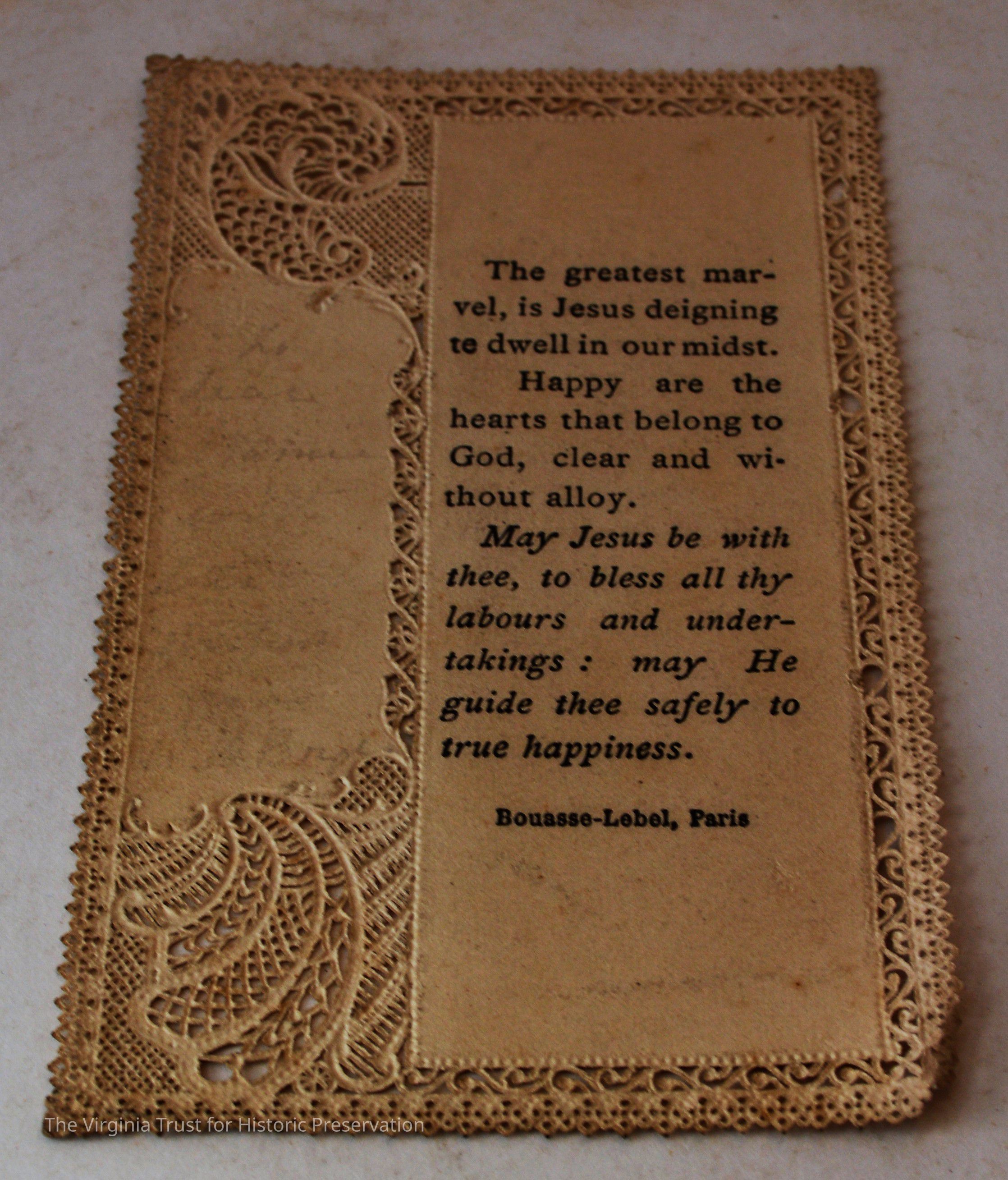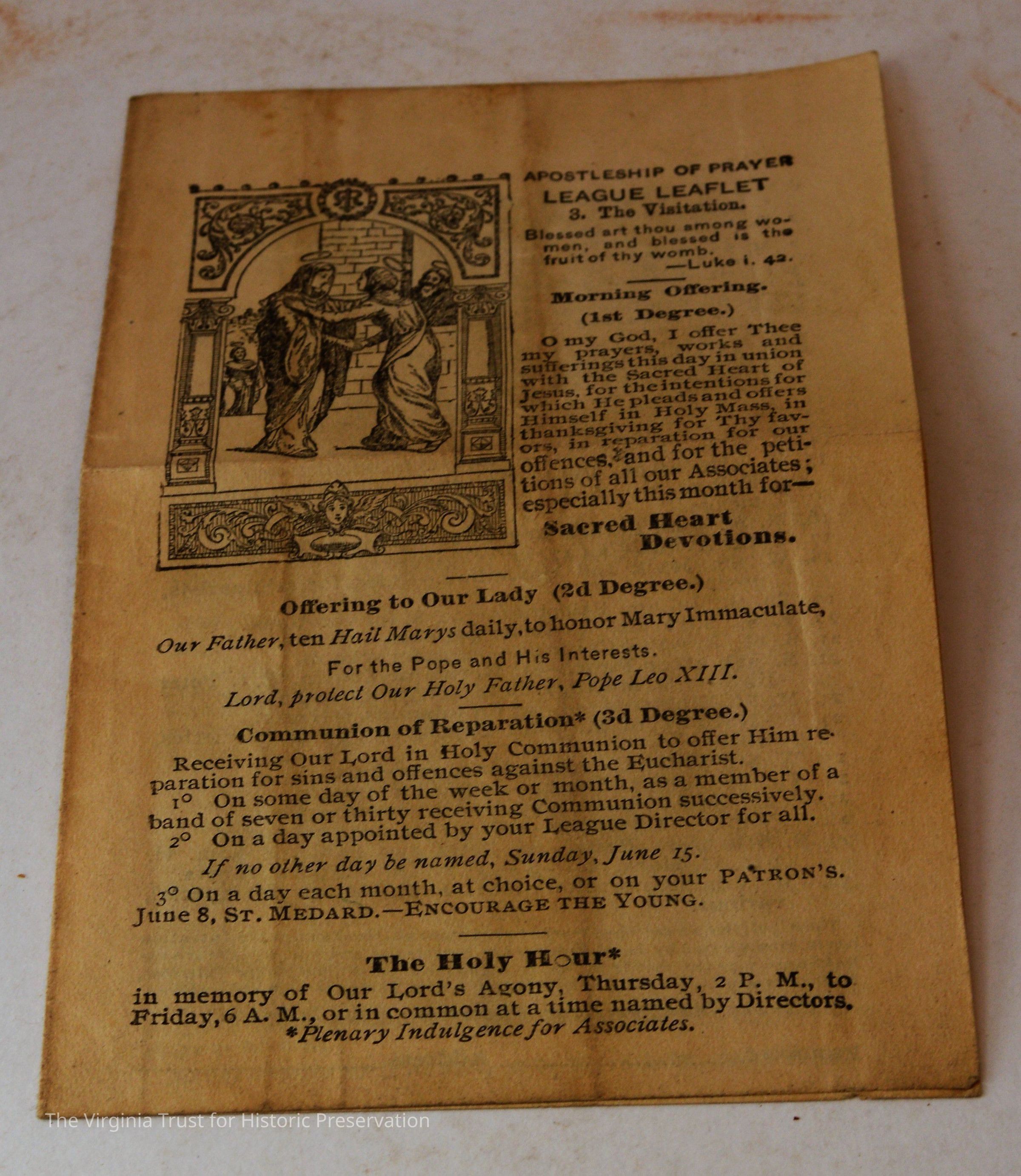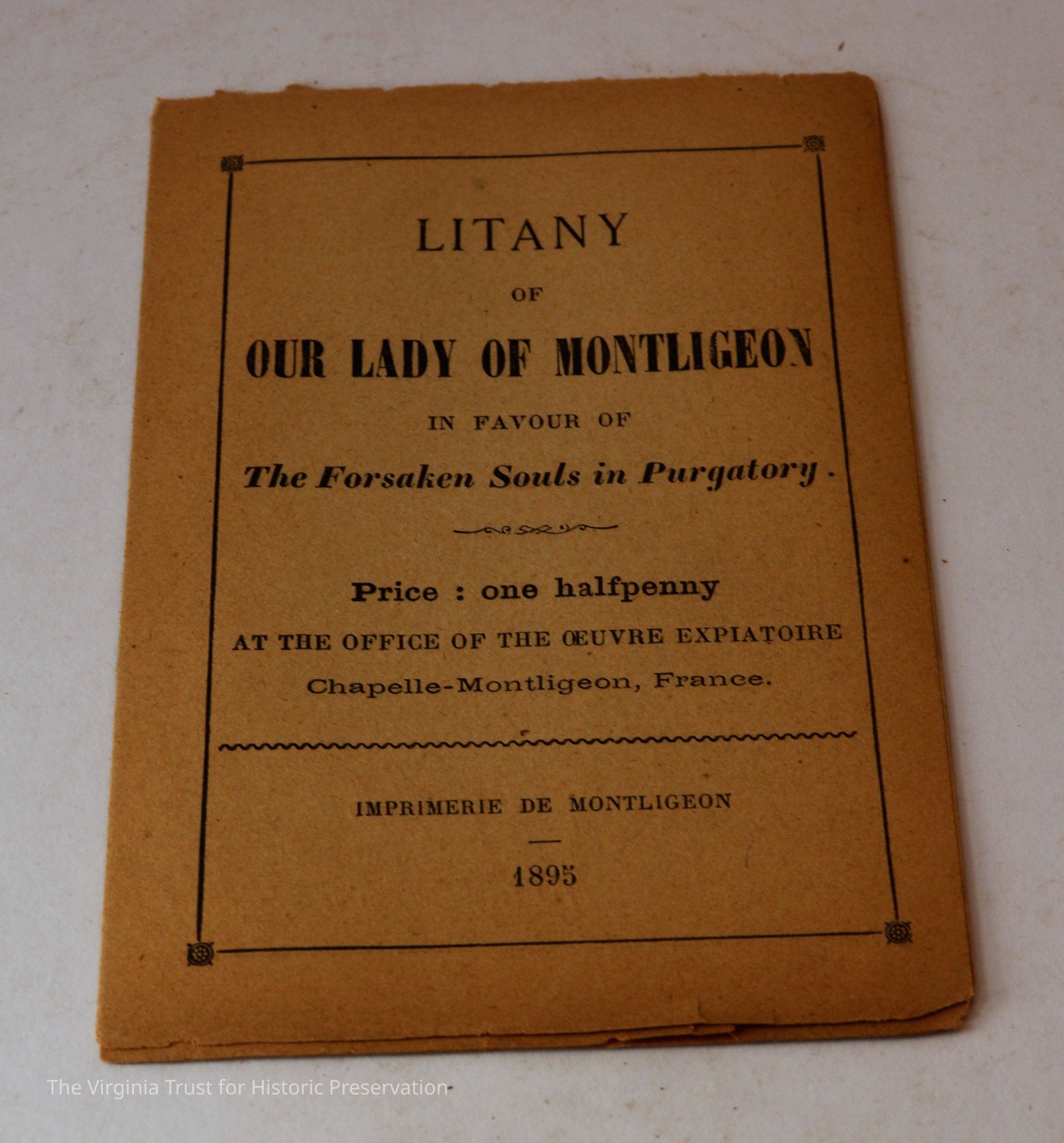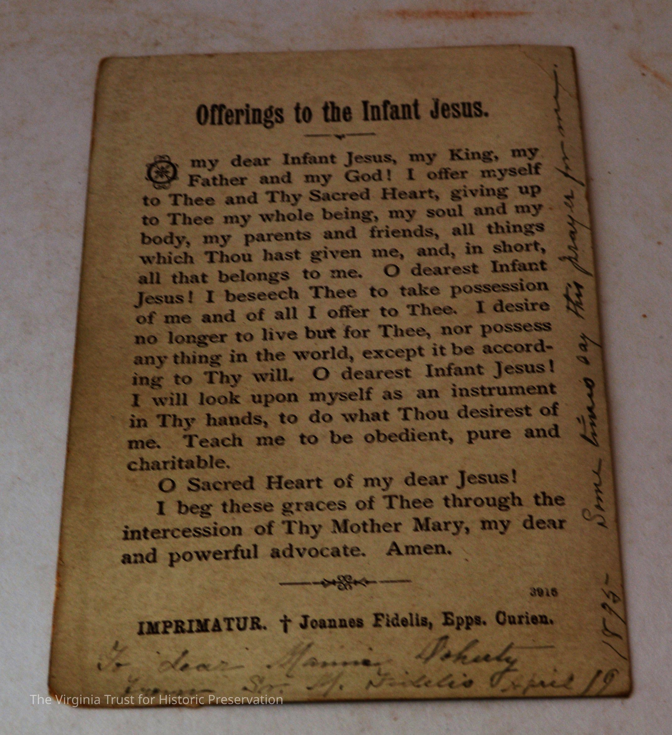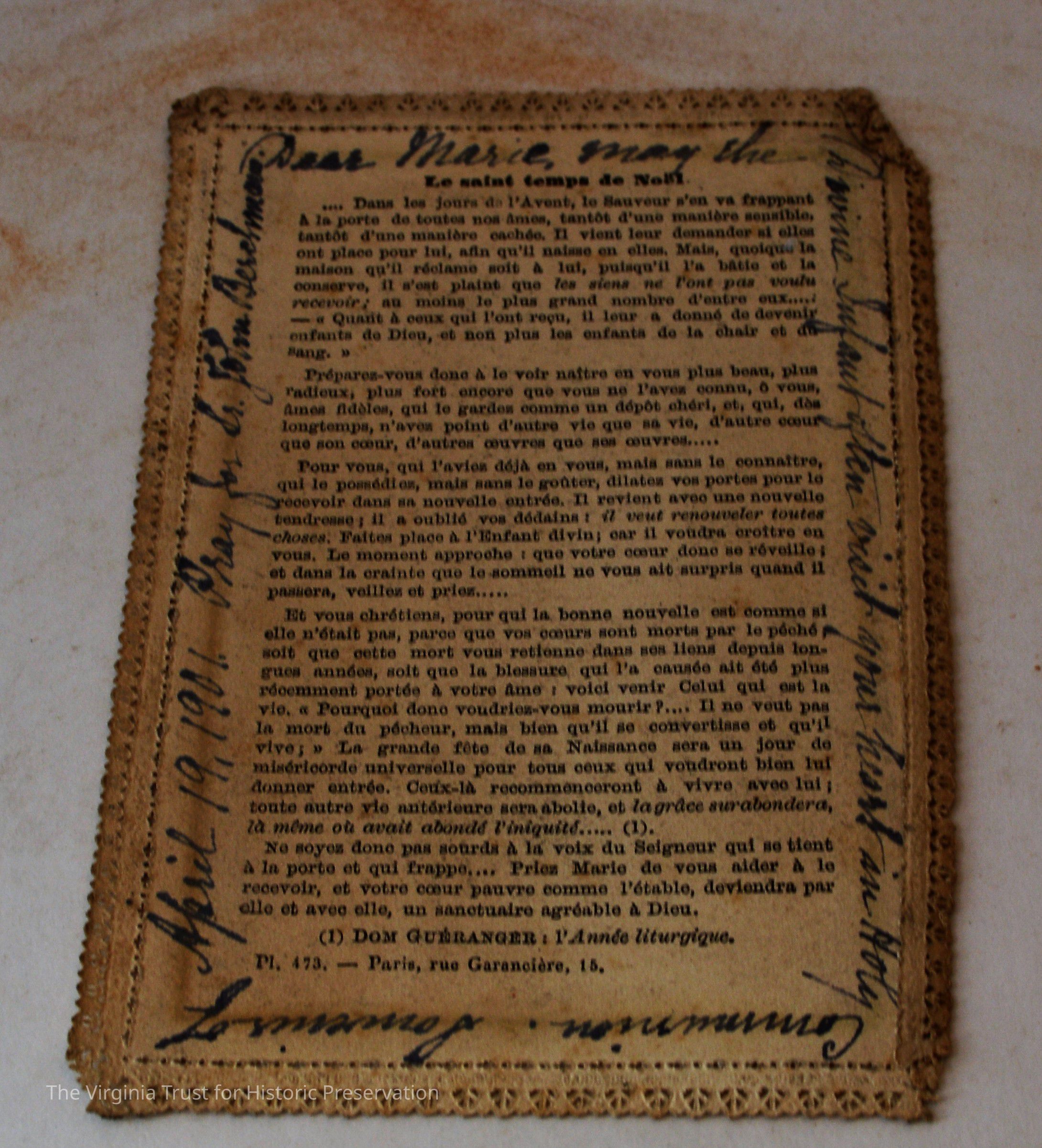 Inserts: 1) Litany of Our Lady of Montligeon in Favour of The Forsaken Souls in Purgatory. [Chapelle-Montligeon, France]: Imprimerie de Montligeon, 1895. 2) newspaper clipping of sayings; 3) lacy cut-out shepherd card; 4) folded lined paper with prayer of [au Auchorus], 13th century, written in pen, with pencil on two folded sheets, addressed to Marie; 5) Apostleship of Prayer League Leaflet; 6) A Pious Contract with Our Savior, Jesus Christ; 7) two book titles on scrap of paper; 8) Offerings to the Infant Jesus prayer card; 9) A Remembrance of the Mission of the Paulist Fathers; 10) folded scrap of lined paper with prayer [?], addressed to Antoinette; 11) two leaves; 12) lacy cut-out A Visit to the Crib card; 13) lacy cut-out Le saint temps de Noel card; 14) communion card; 15) In Honor of the Sacred Heart of Jesus