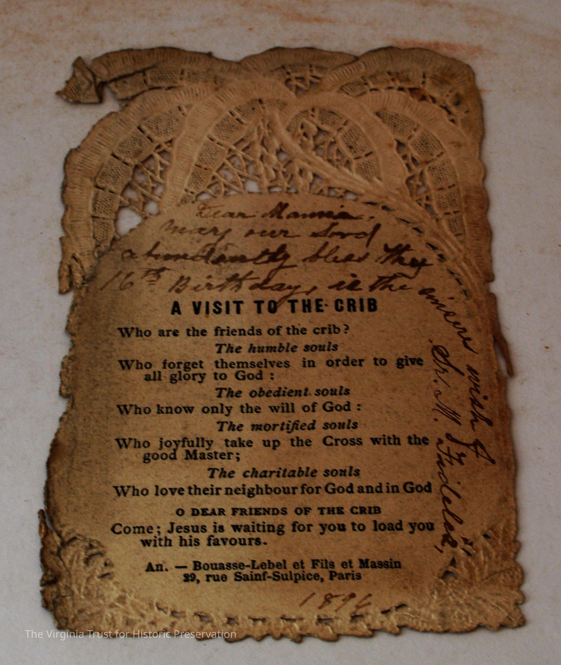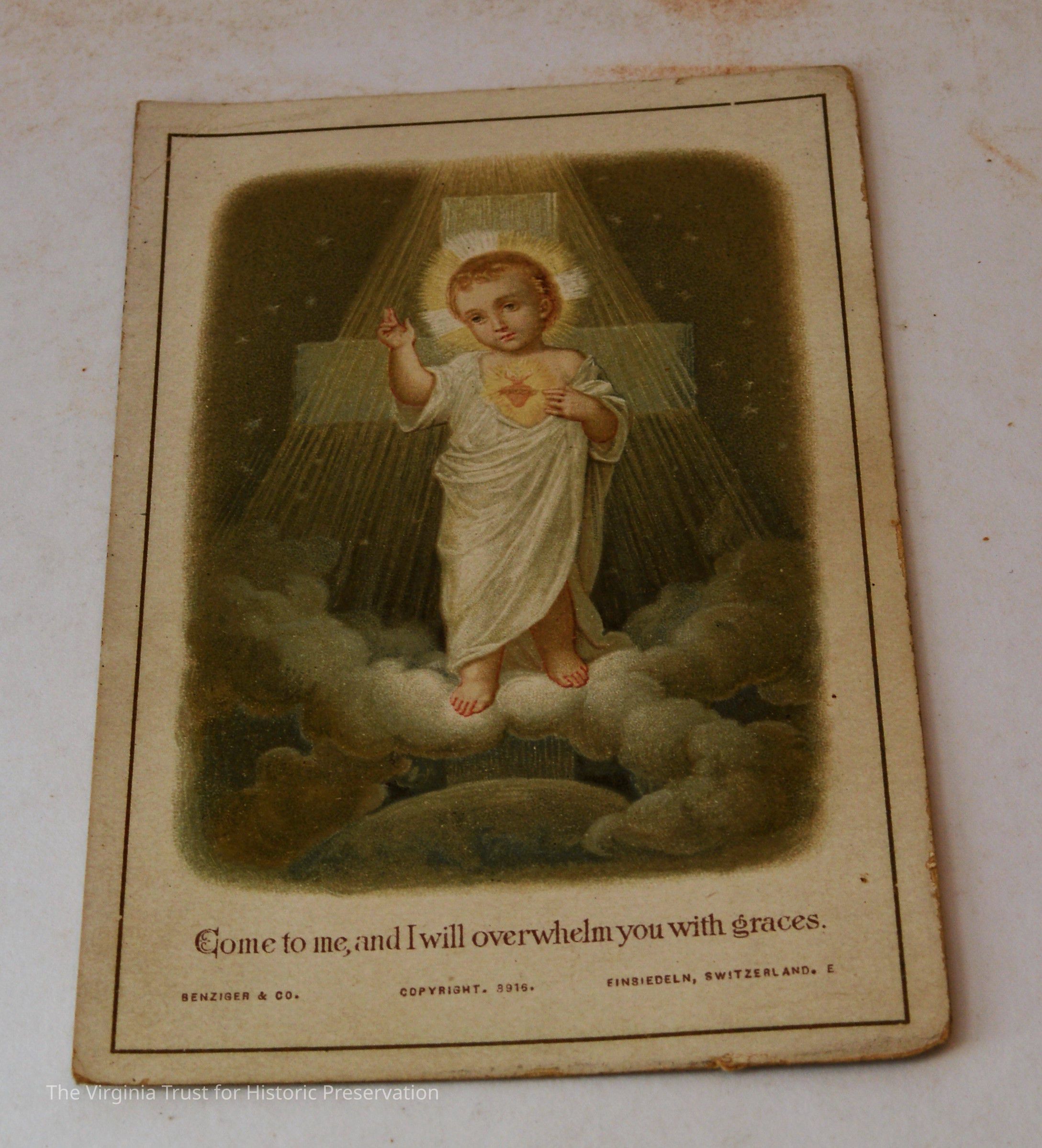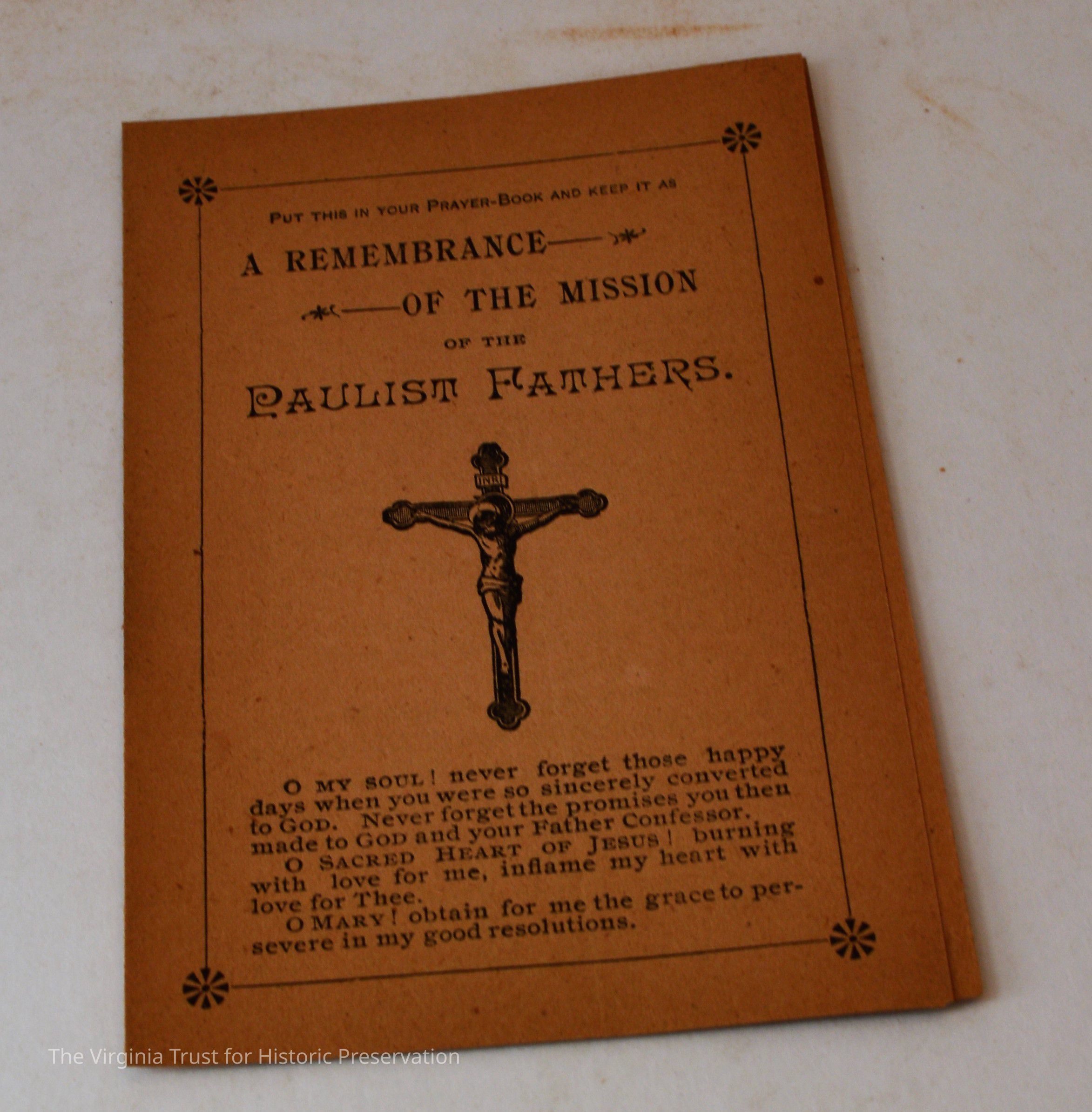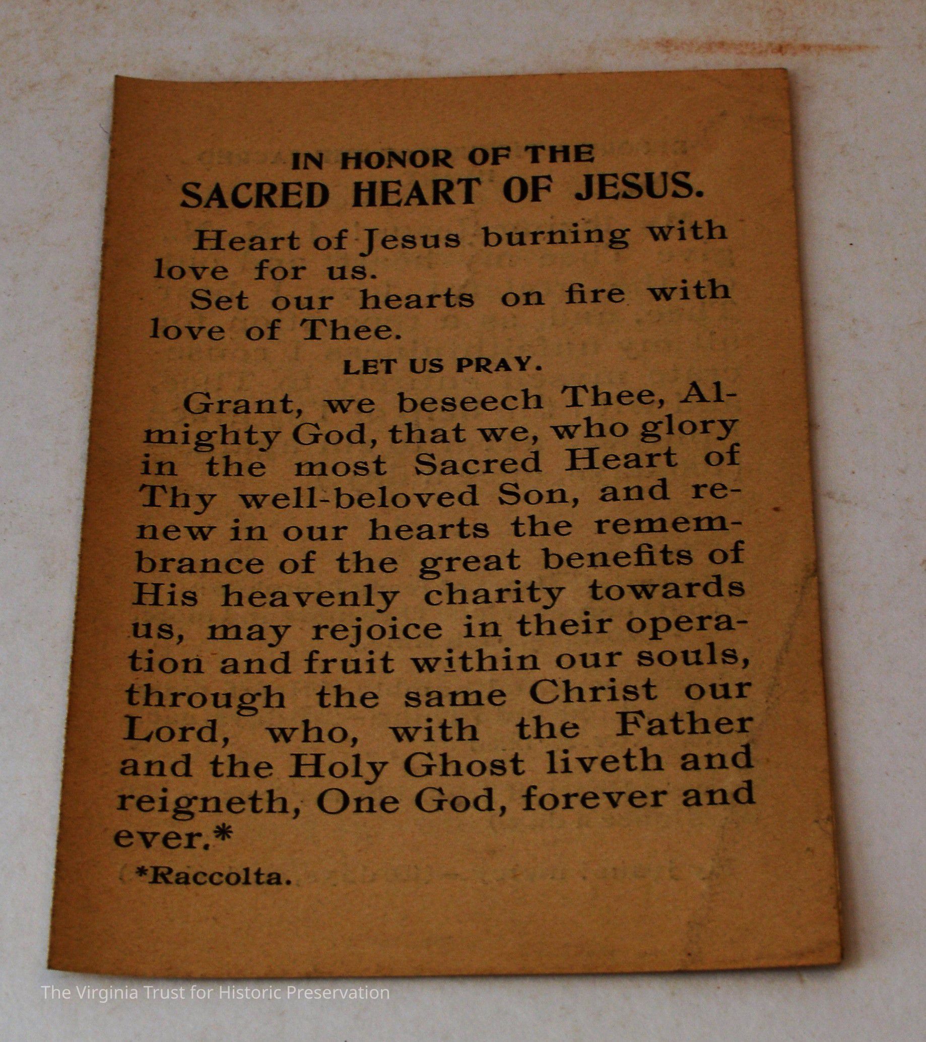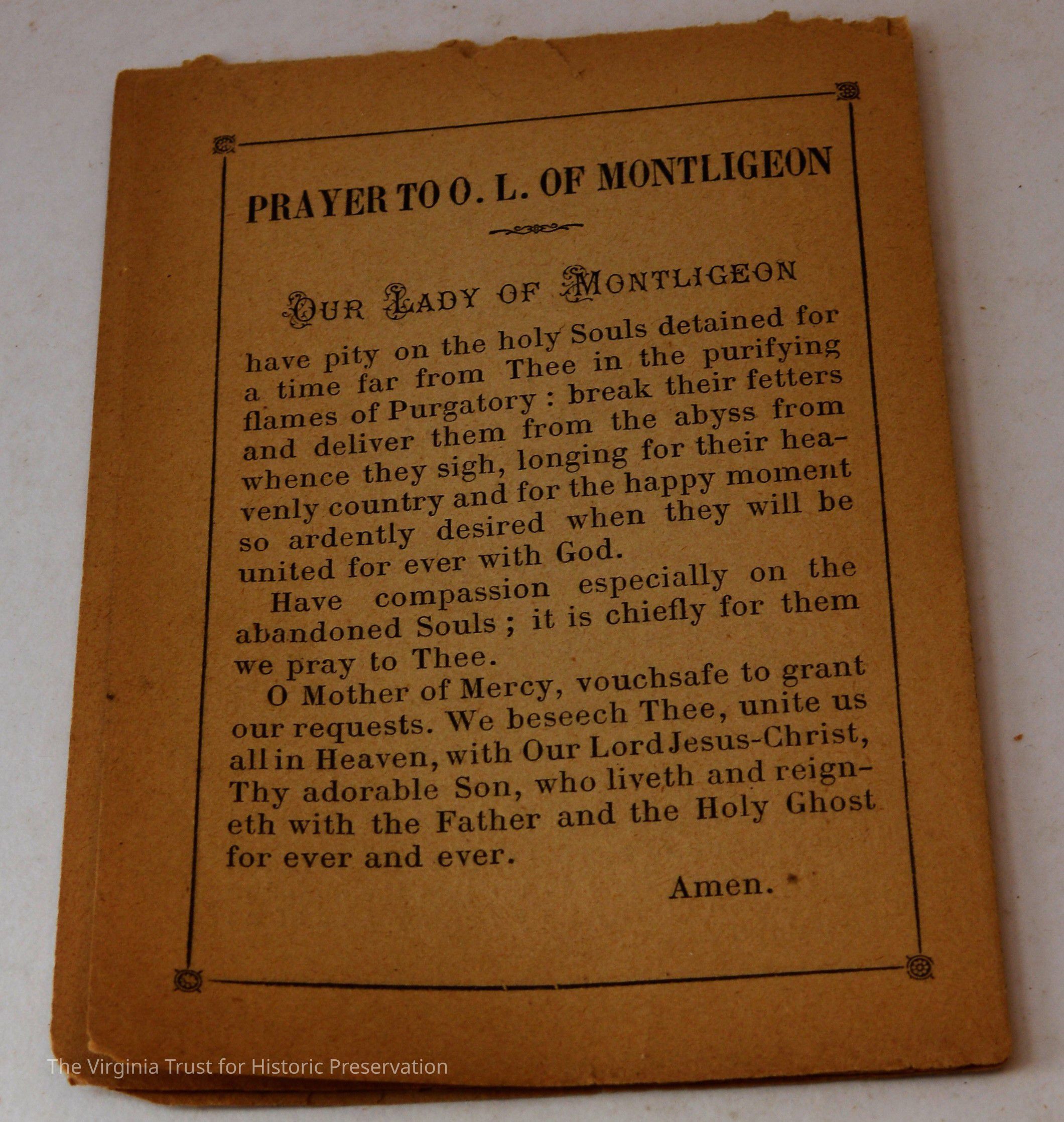 Inserts: 1) Litany of Our Lady of Montligeon in Favour of The Forsaken Souls in Purgatory. [Chapelle-Montligeon, France]: Imprimerie de Montligeon, 1895. 2) newspaper clipping of sayings; 3) lacy cut-out shepherd card; 4) folded lined paper with prayer of [au Auchorus], 13th century, written in pen, with pencil on two folded sheets, addressed to Marie; 5) Apostleship of Prayer League Leaflet; 6) A Pious Contract with Our Savior, Jesus Christ; 7) two book titles on scrap of paper; 8) Offerings to the Infant Jesus prayer card; 9) A Remembrance of the Mission of the Paulist Fathers; 10) folded scrap of lined paper with prayer [?], addressed to Antoinette; 11) two leaves; 12) lacy cut-out A Visit to the Crib card; 13) lacy cut-out Le saint temps de Noel card; 14) communion card; 15) In Honor of the Sacred Heart of Jesus