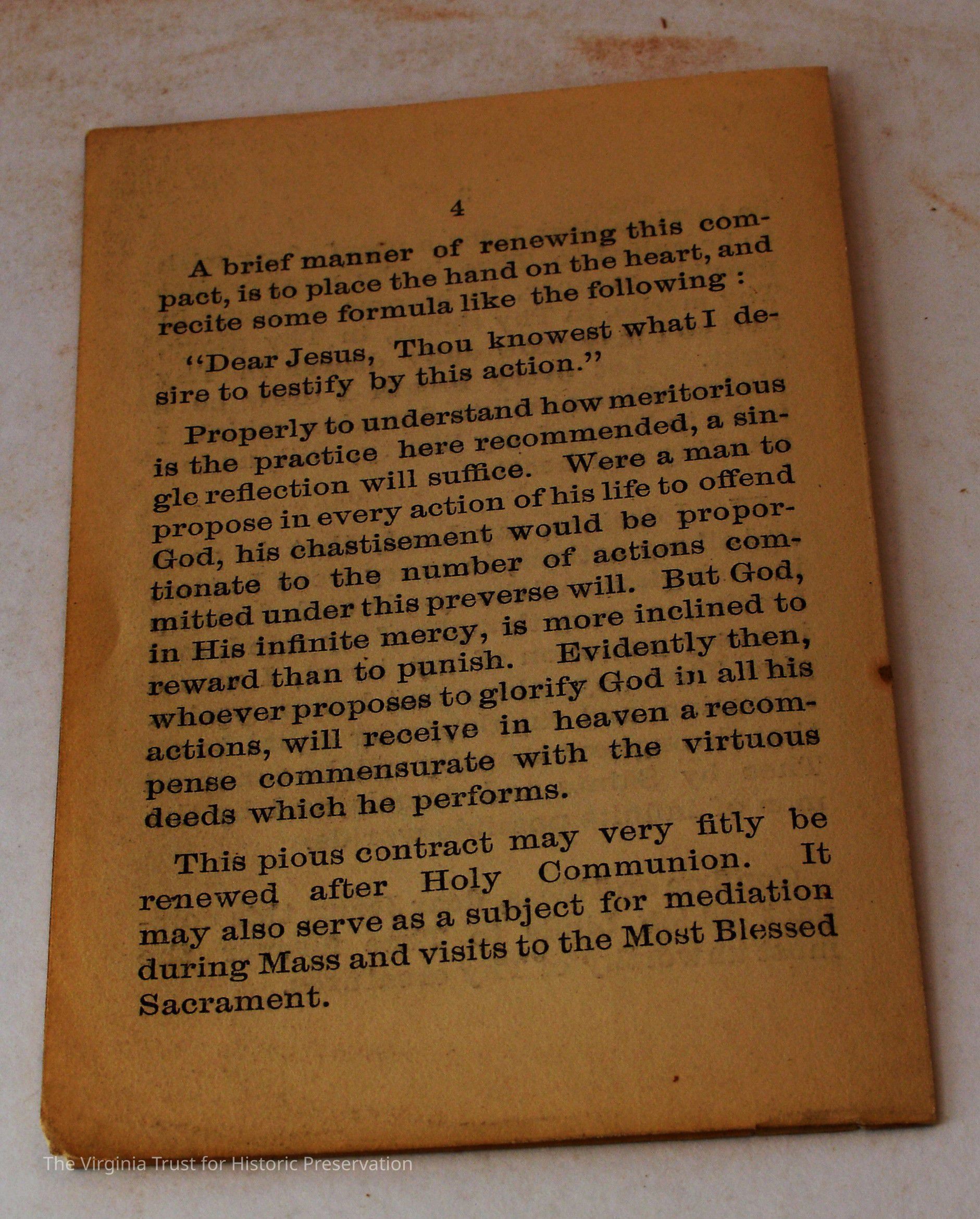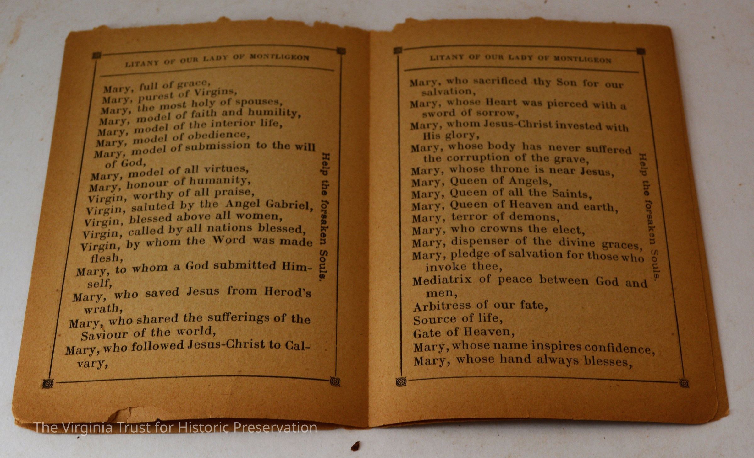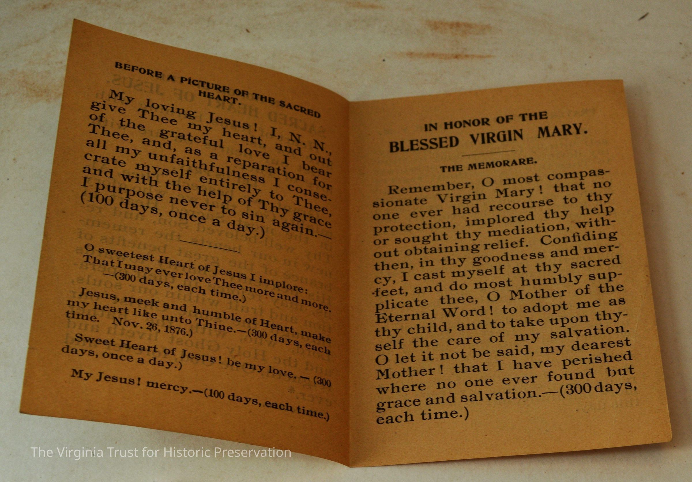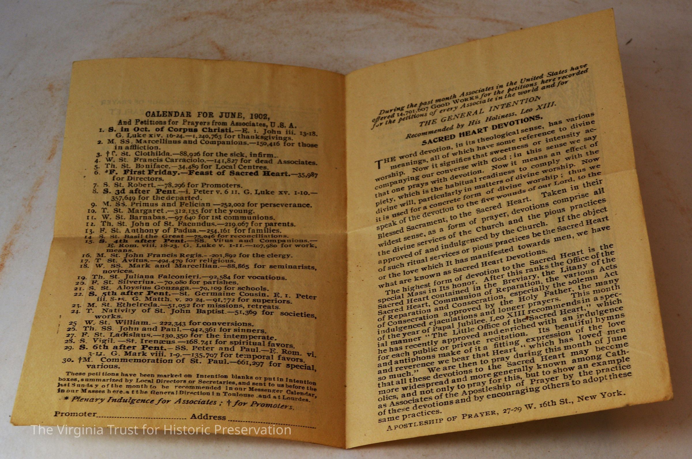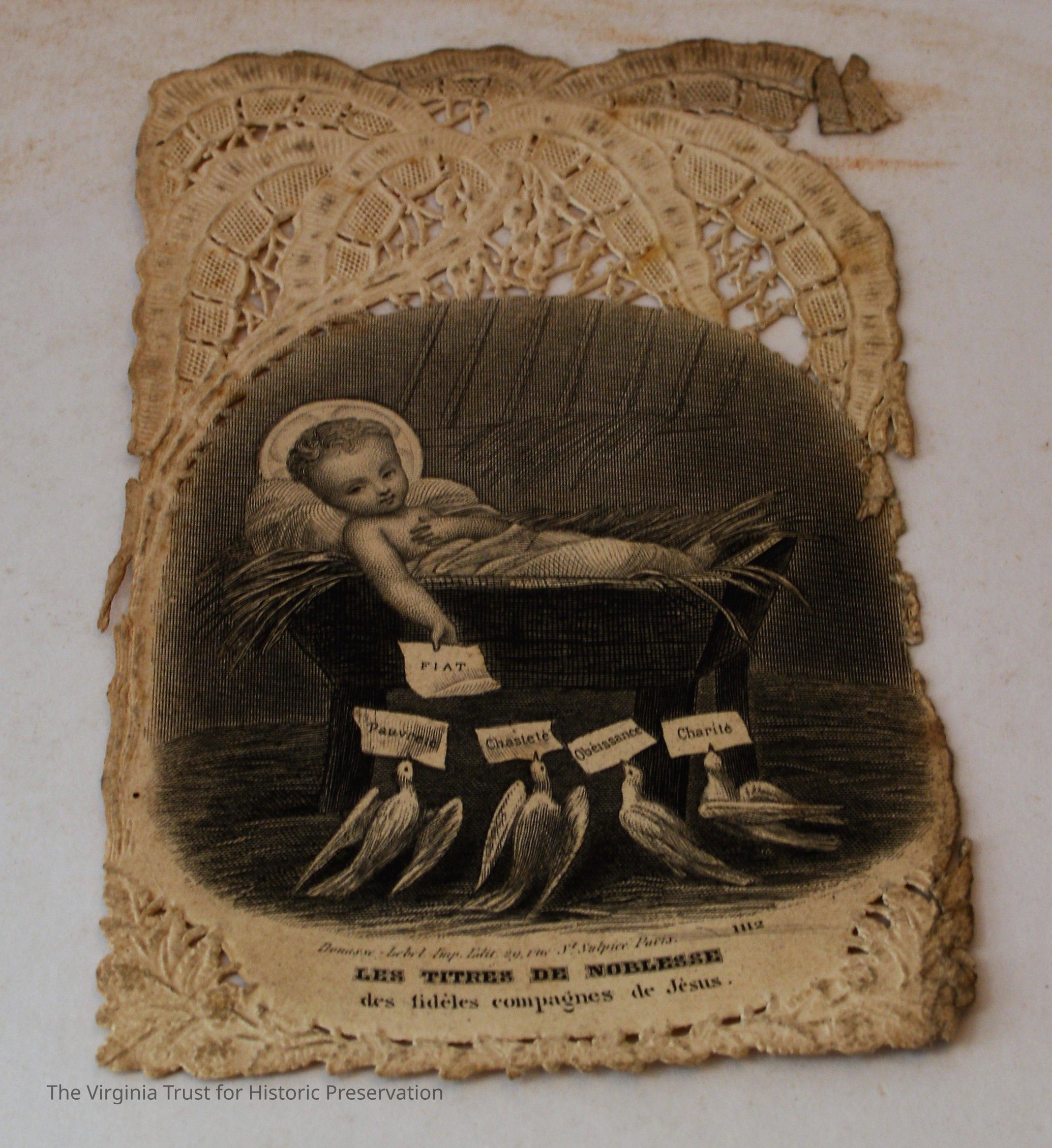 Inserts: 1) Litany of Our Lady of Montligeon in Favour of The Forsaken Souls in Purgatory. [Chapelle-Montligeon, France]: Imprimerie de Montligeon, 1895. 2) newspaper clipping of sayings; 3) lacy cut-out shepherd card; 4) folded lined paper with prayer of [au Auchorus], 13th century, written in pen, with pencil on two folded sheets, addressed to Marie; 5) Apostleship of Prayer League Leaflet; 6) A Pious Contract with Our Savior, Jesus Christ; 7) two book titles on scrap of paper; 8) Offerings to the Infant Jesus prayer card; 9) A Remembrance of the Mission of the Paulist Fathers; 10) folded scrap of lined paper with prayer [?], addressed to Antoinette; 11) two leaves; 12) lacy cut-out A Visit to the Crib card; 13) lacy cut-out Le saint temps de Noel card; 14) communion card; 15) In Honor of the Sacred Heart of Jesus