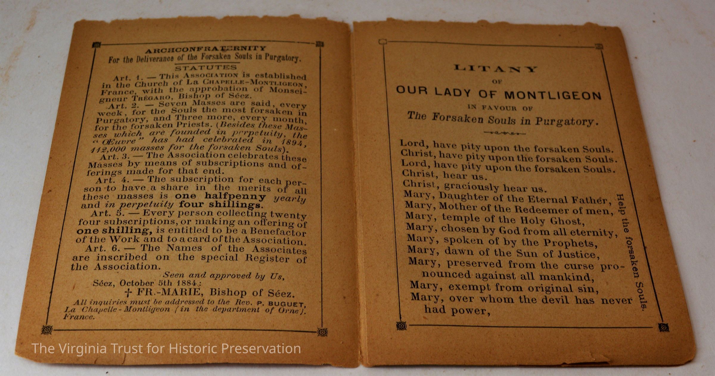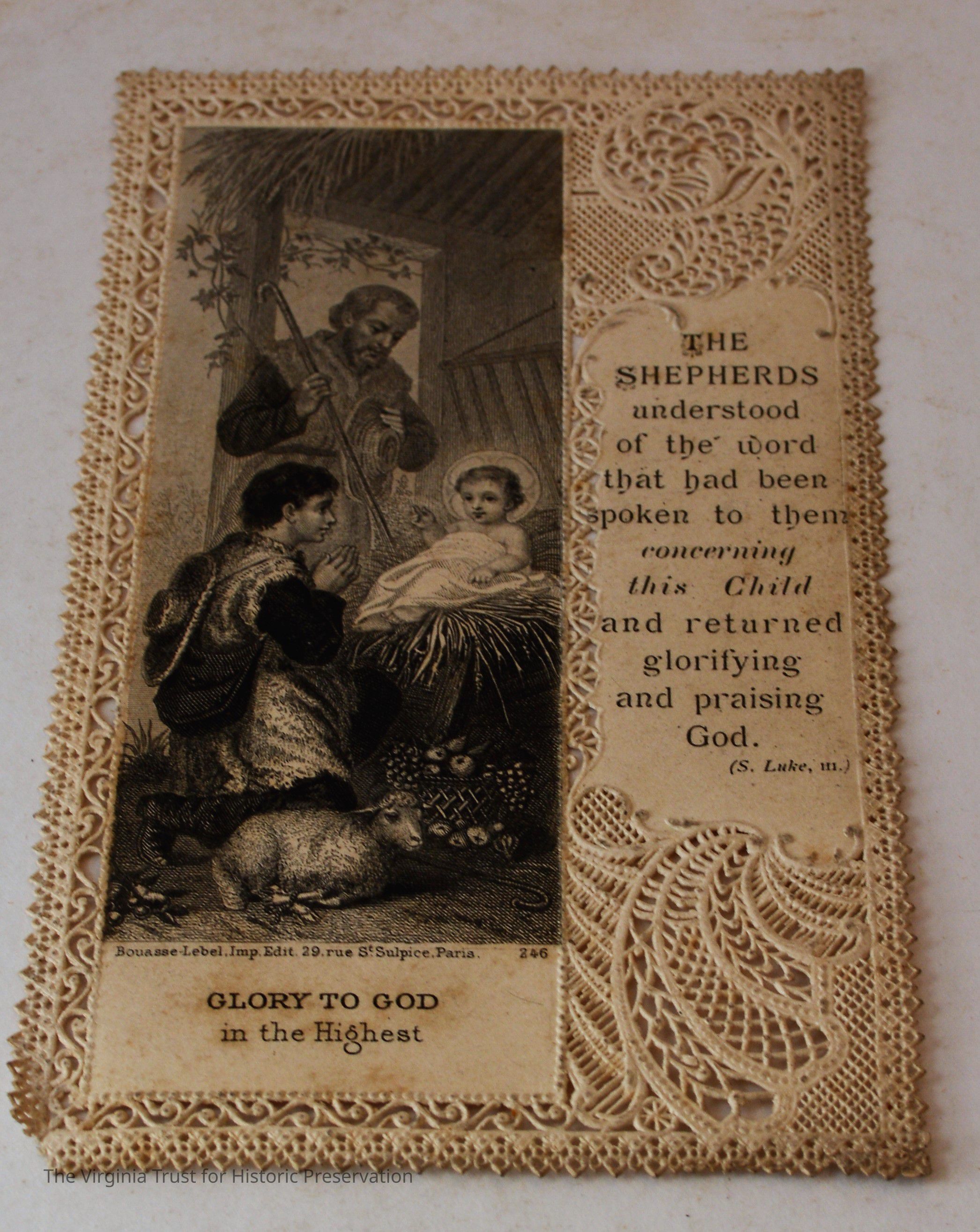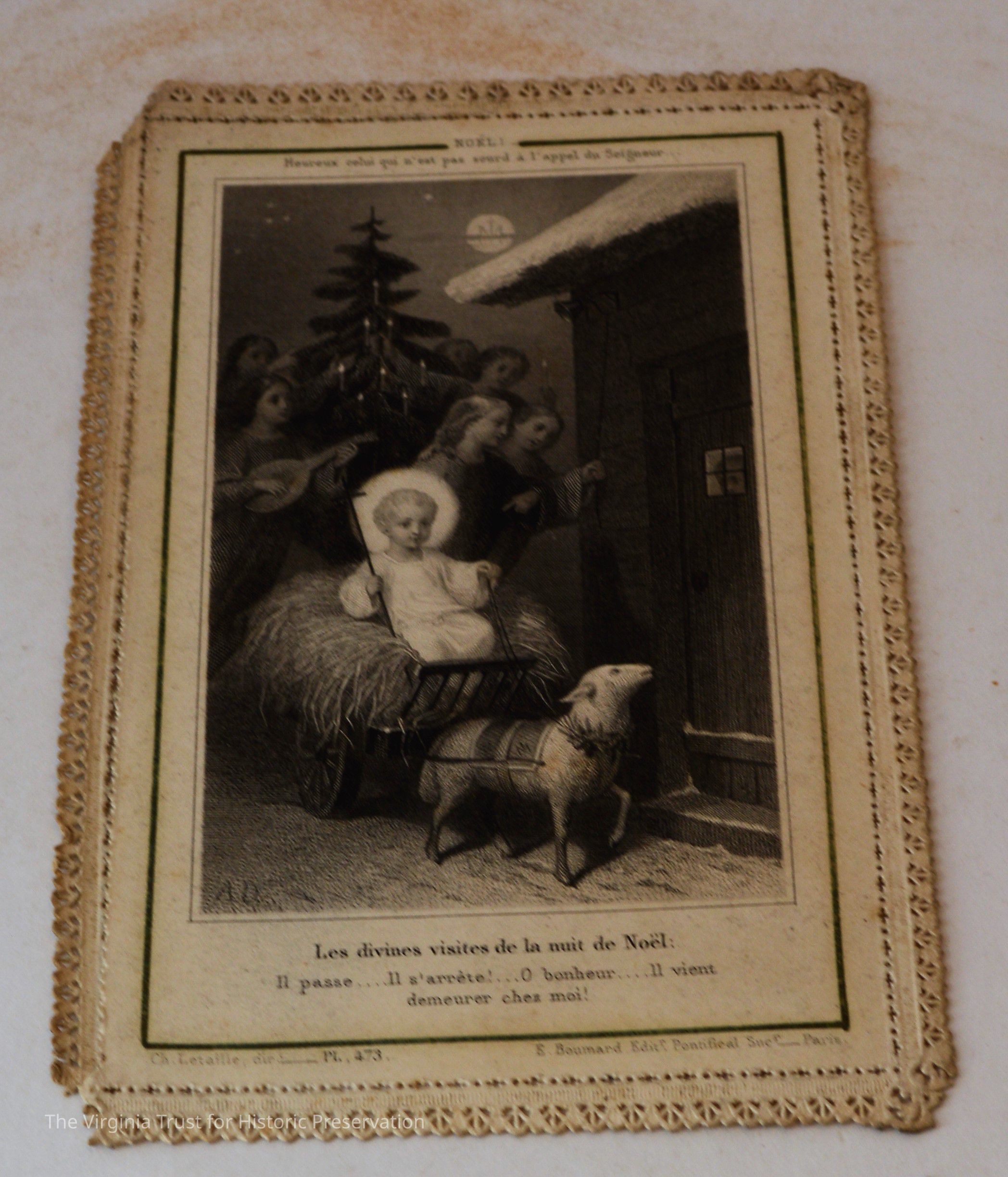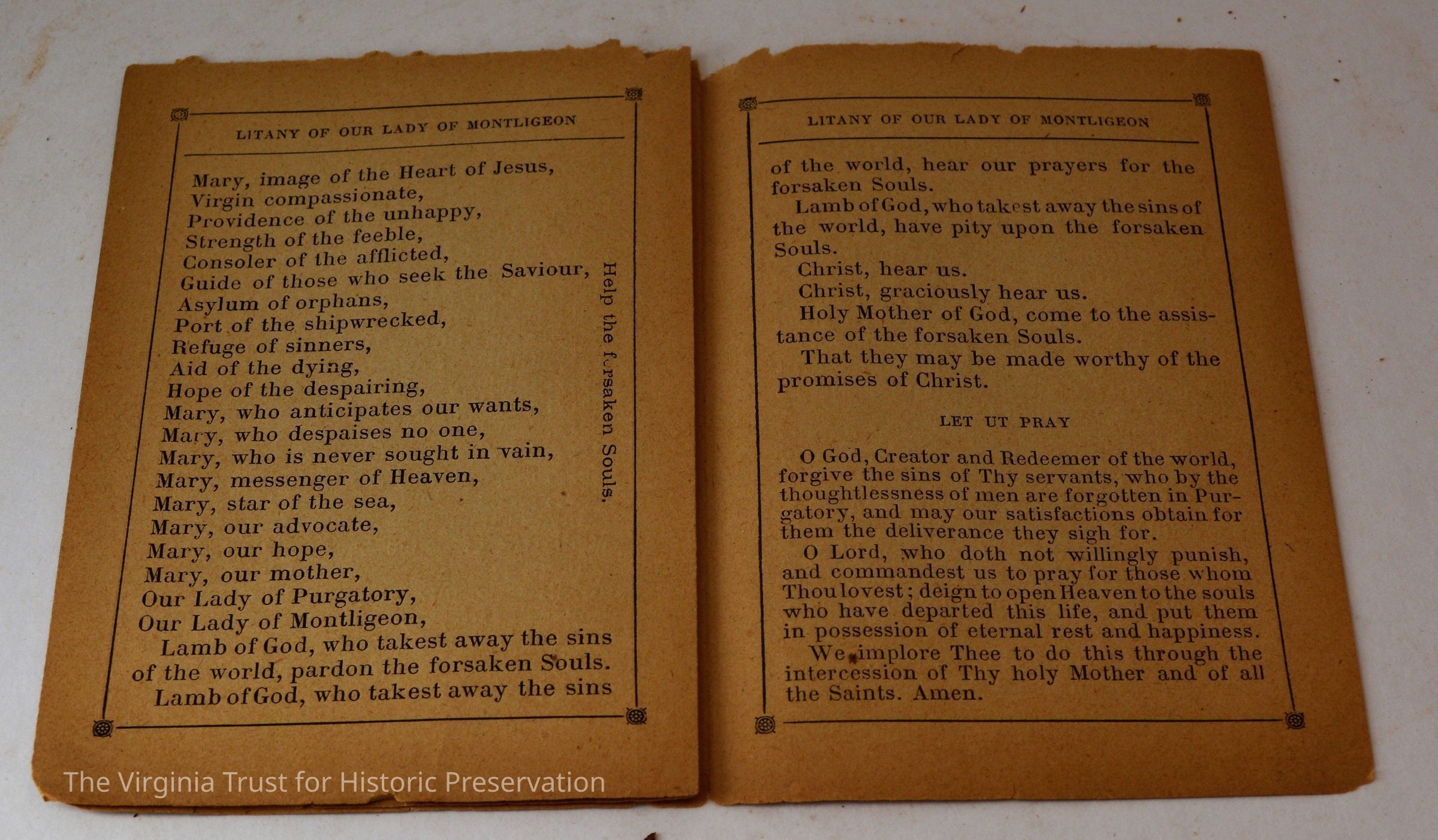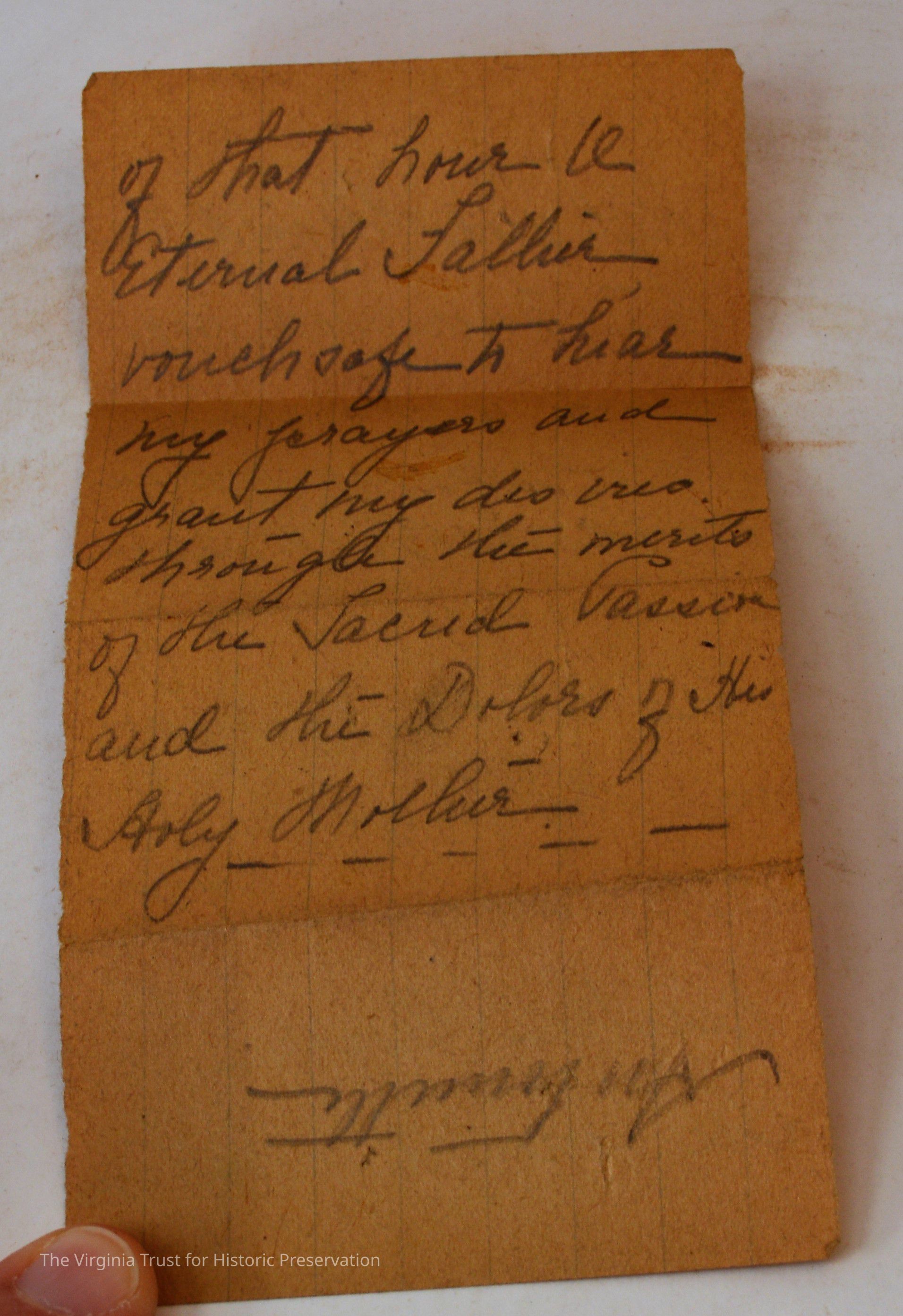 Inserts: 1) Litany of Our Lady of Montligeon in Favour of The Forsaken Souls in Purgatory. [Chapelle-Montligeon, France]: Imprimerie de Montligeon, 1895. 2) newspaper clipping of sayings; 3) lacy cut-out shepherd card; 4) folded lined paper with prayer of [au Auchorus], 13th century, written in pen, with pencil on two folded sheets, addressed to Marie; 5) Apostleship of Prayer League Leaflet; 6) A Pious Contract with Our Savior, Jesus Christ; 7) two book titles on scrap of paper; 8) Offerings to the Infant Jesus prayer card; 9) A Remembrance of the Mission of the Paulist Fathers; 10) folded scrap of lined paper with prayer [?], addressed to Antoinette; 11) two leaves; 12) lacy cut-out A Visit to the Crib card; 13) lacy cut-out Le saint temps de Noel card; 14) communion card; 15) In Honor of the Sacred Heart of Jesus