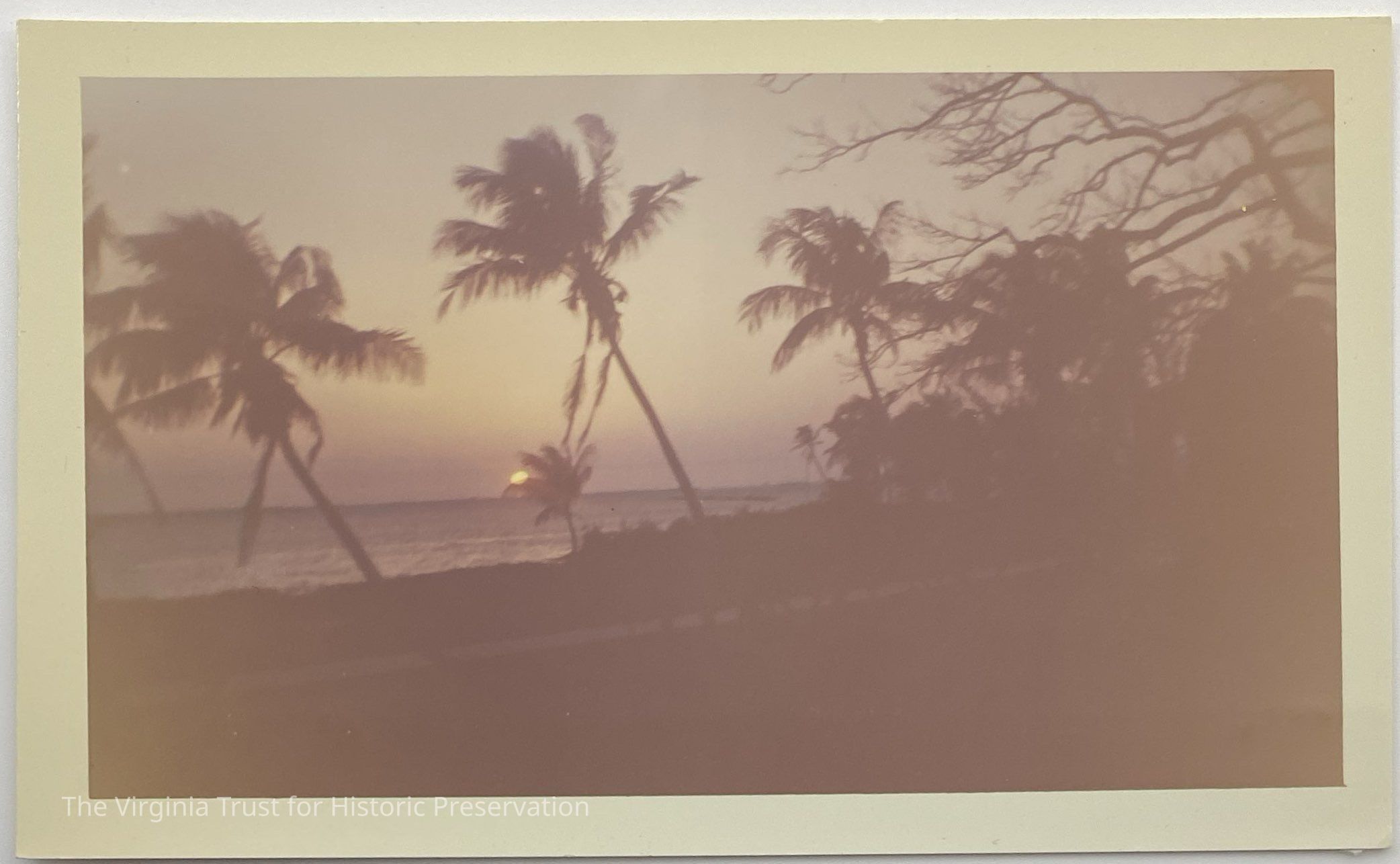 Color photograph of palm trees against a sunset. A walkway and waters are in the background. Most likely in Pine Island, Florida where John L. Lewis had a house. White border with straight edges.Dimensions