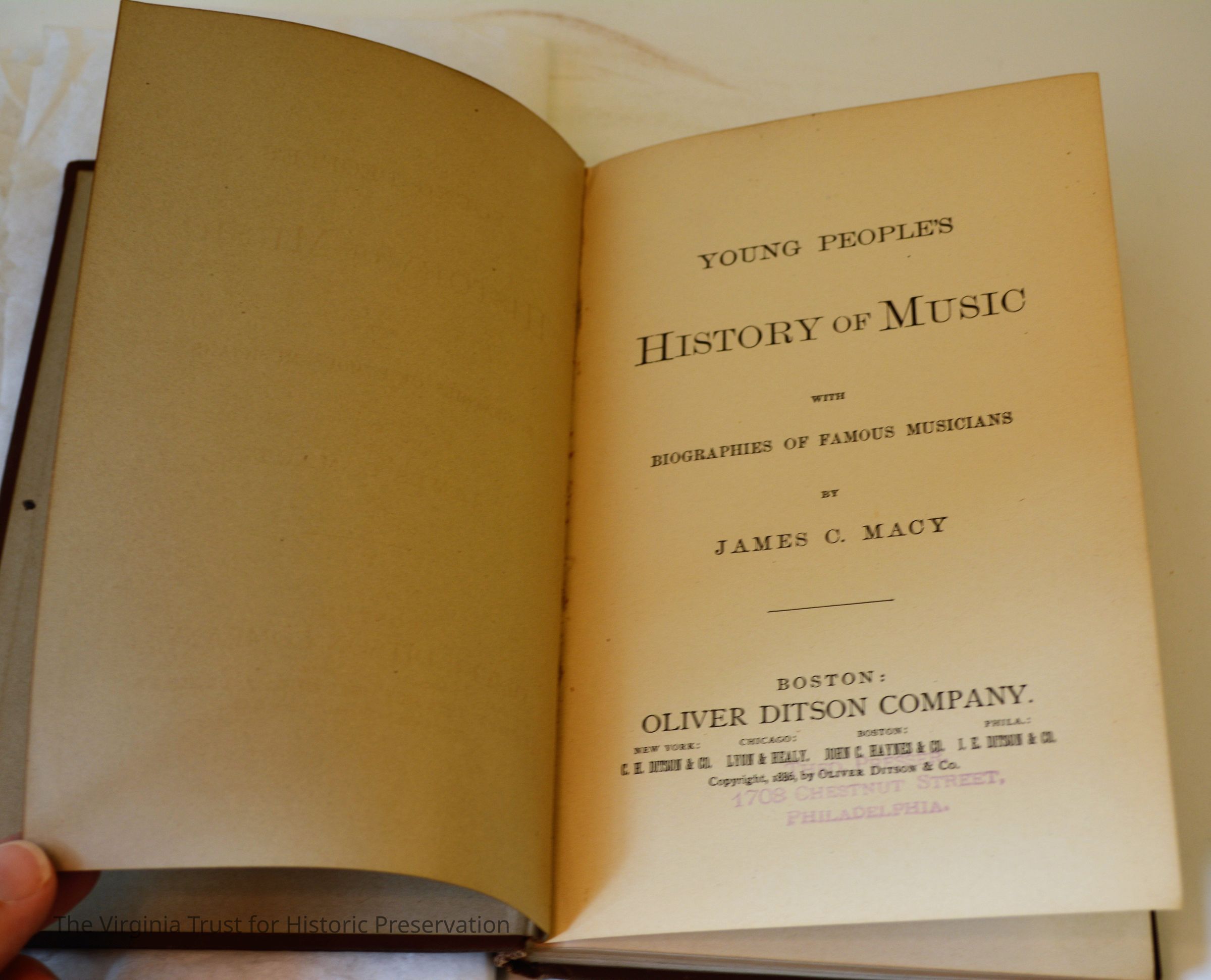 "Young People's History of Music with Biographies of Famous Musicians" by James C. Macy. Boston: Oliver Ditson Company, 1886.