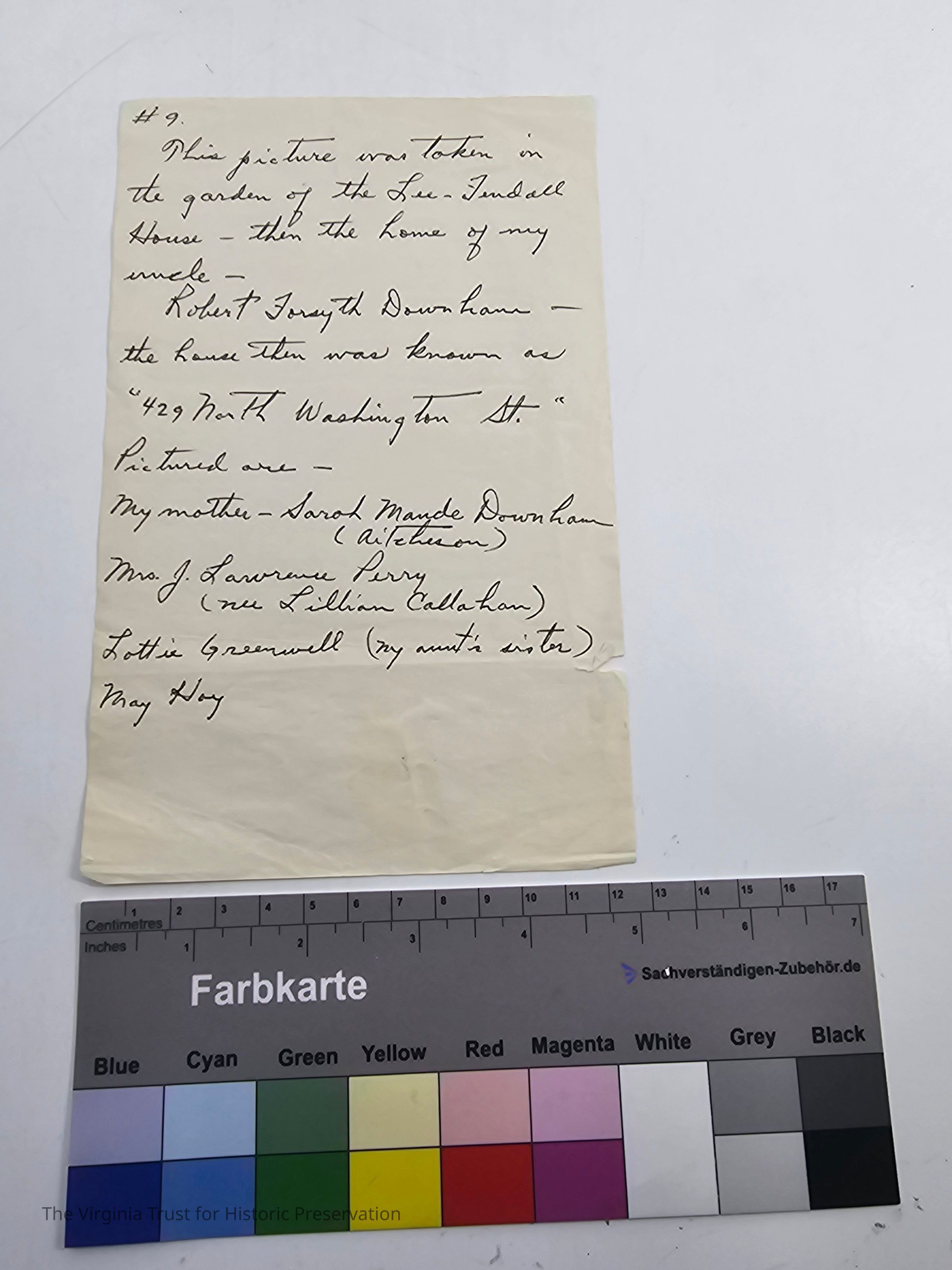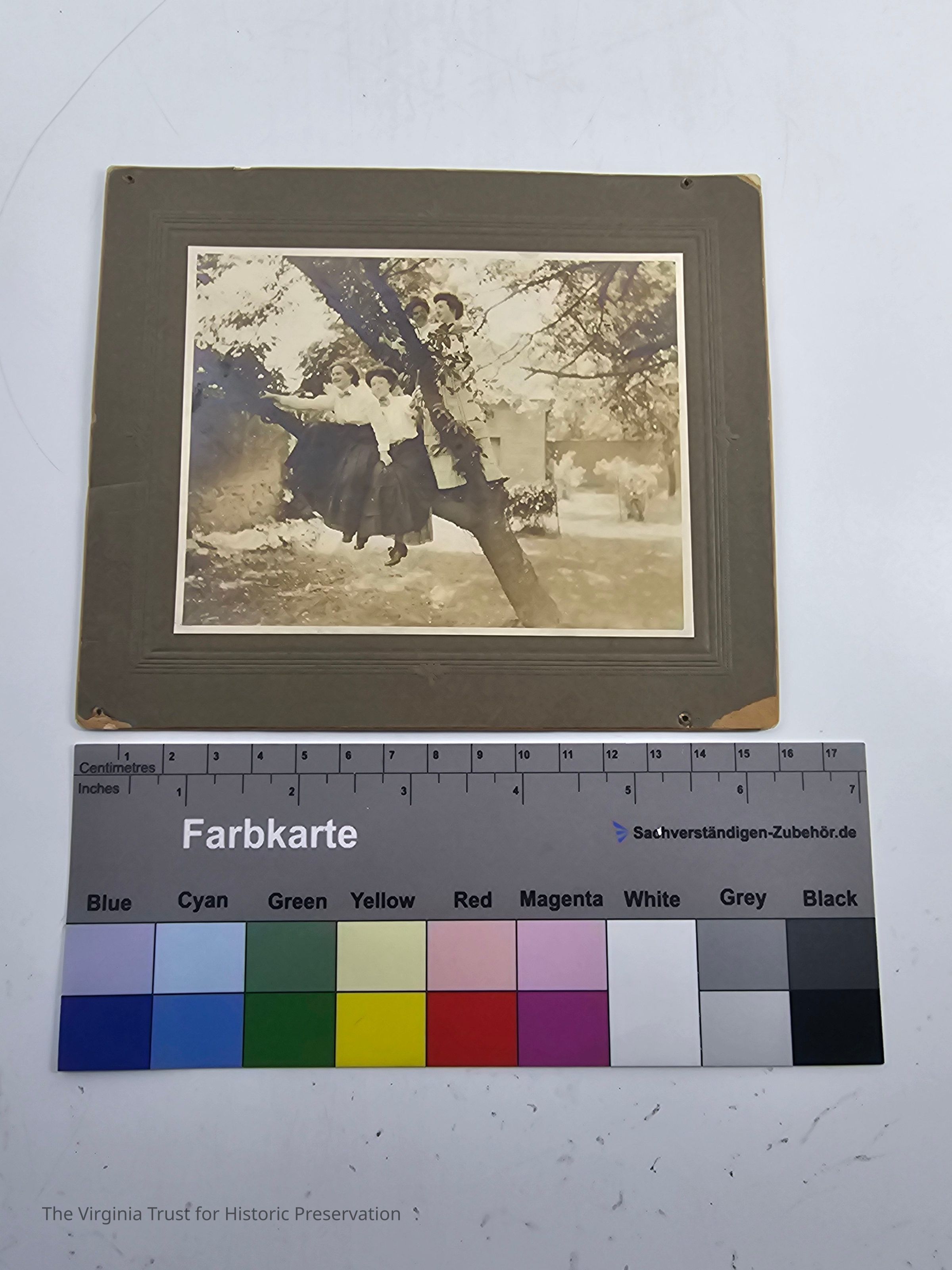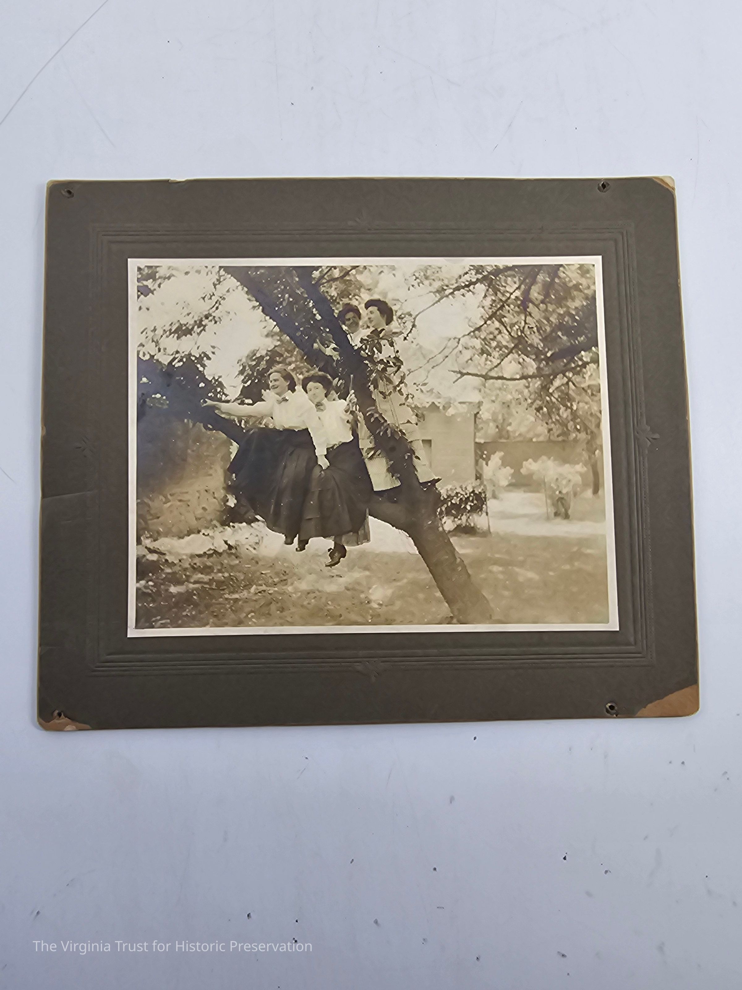 L-R Sarah Maude Downham Aitcheson, Lillian Callahan (Later J. Lawrence Perry), Lottie Greenwell, and May Hay up in a tree in the Lee-Fendall garden.