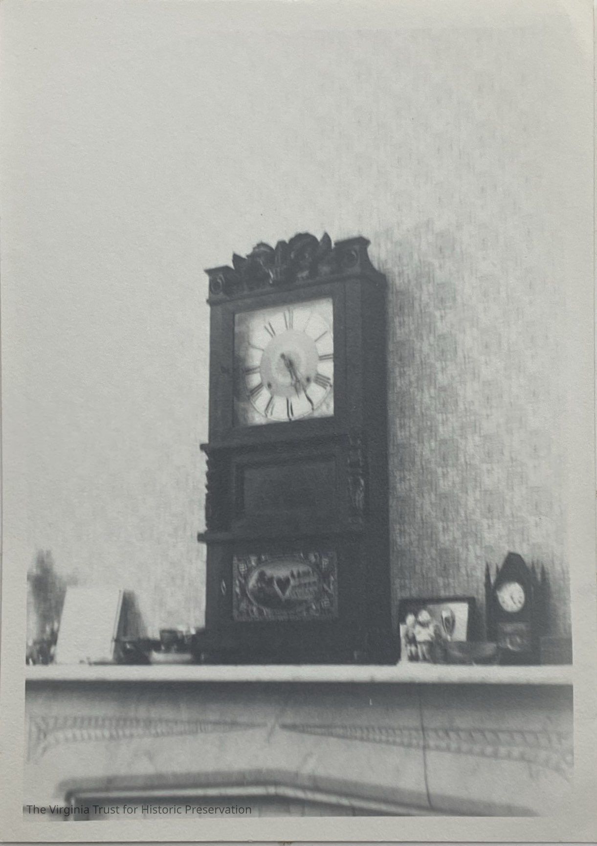 Black and white vertical photograph of a clock sitting on a mantle in the South Parlor of the Lee-Fendall House. Miscellaneous objects are lined up on either side of the clock. Straight white border.Dimensions