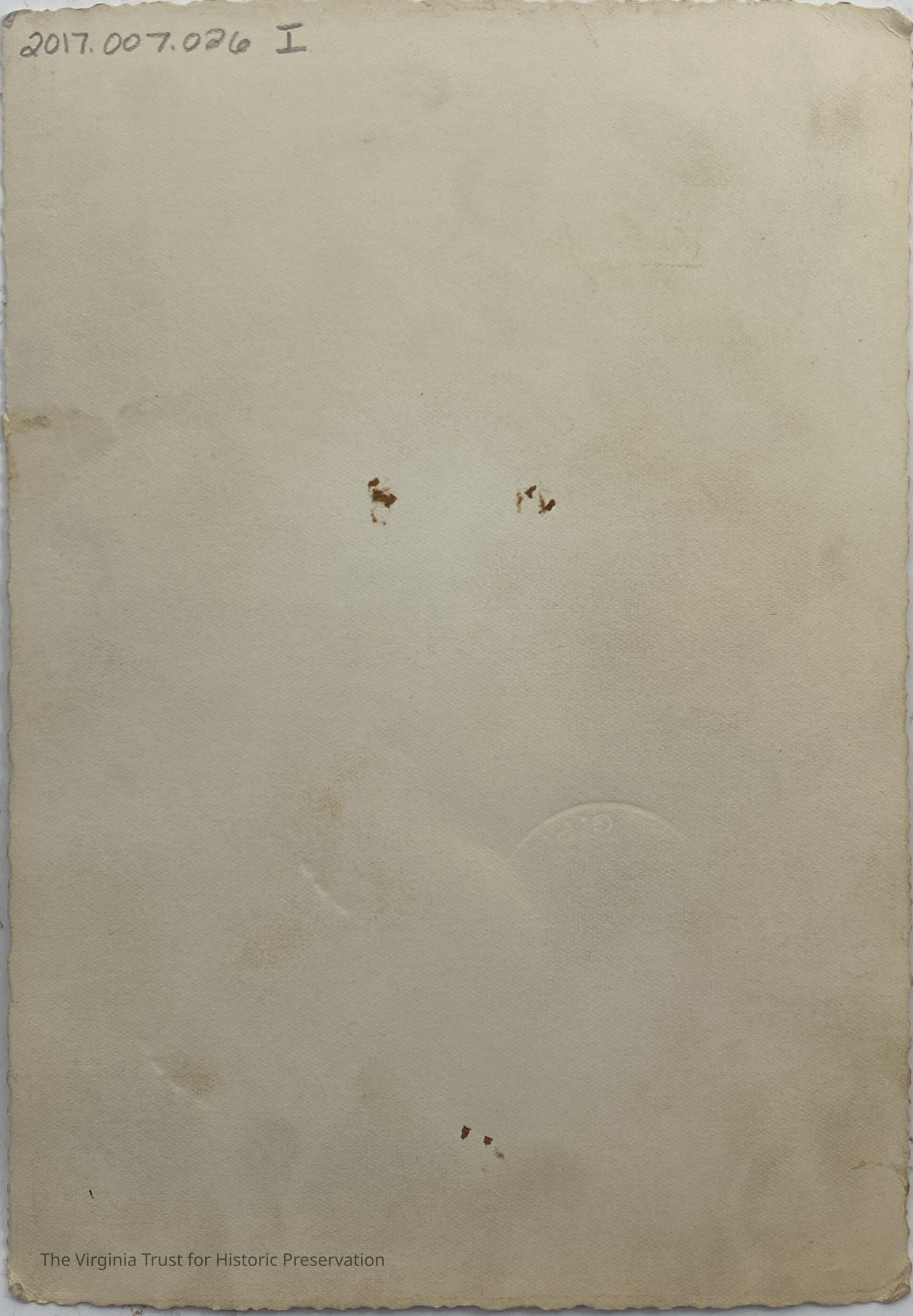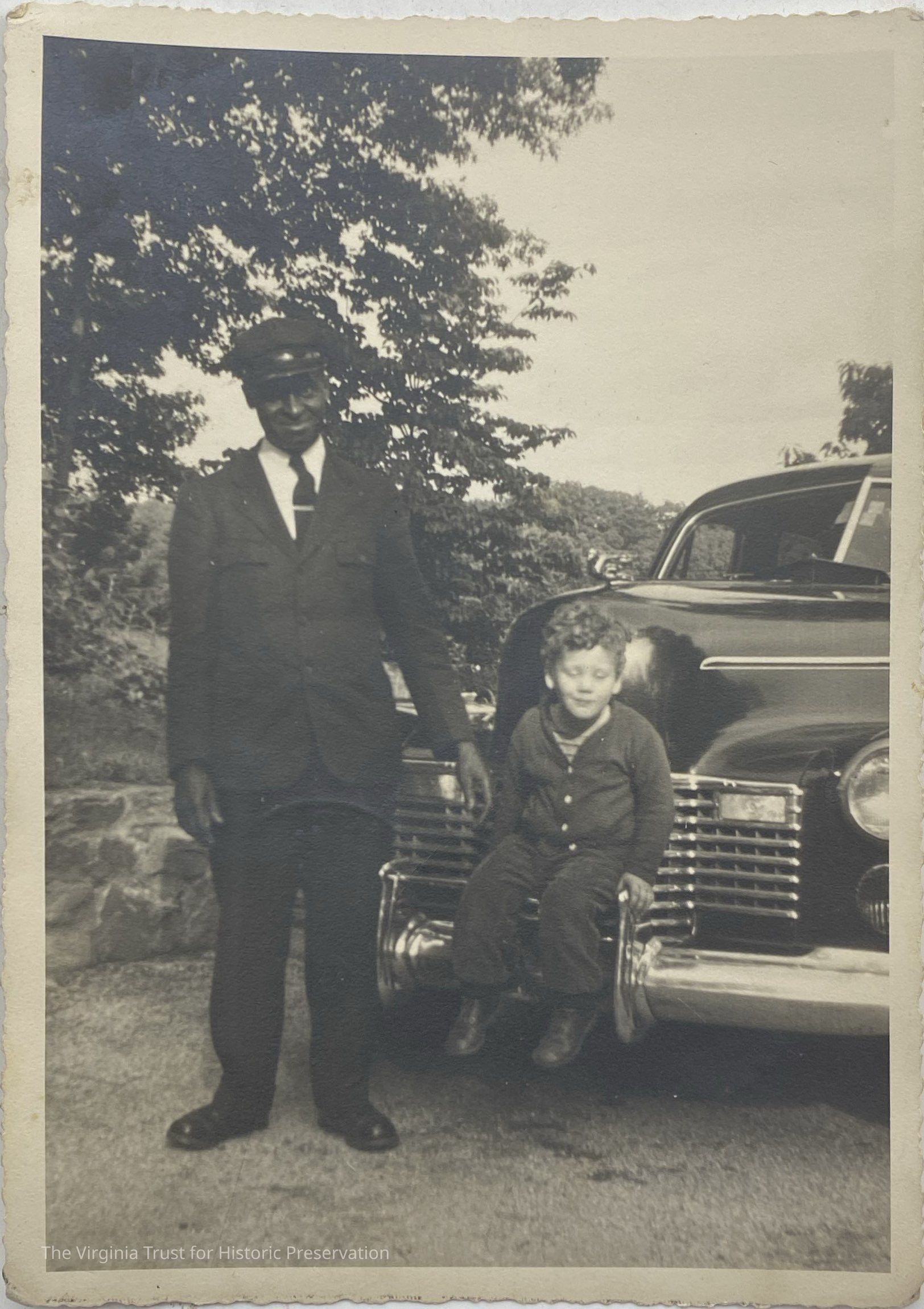 Black and white photograph of James Lewis Jr. in his chauffeur suit and cap with a child (possibly one of John Lewis’ kids) who sits on the front of Cadillac. Short brick wall and foliage in background. Probably taken same day as 2017.006.026 H.